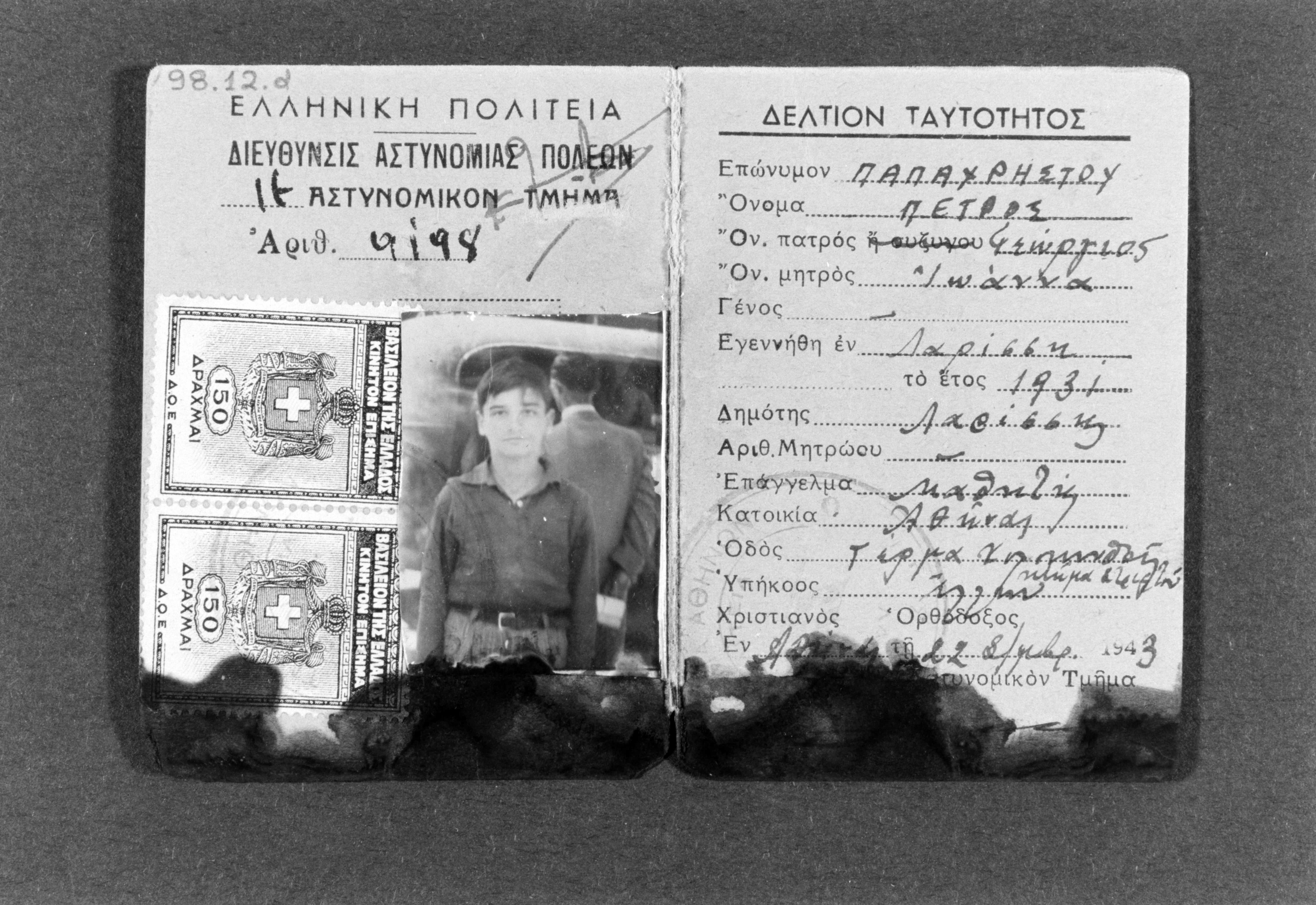 False police ID card issued for Perez Siakkis in the name Petros Papachristos, Athens 22/09/1943