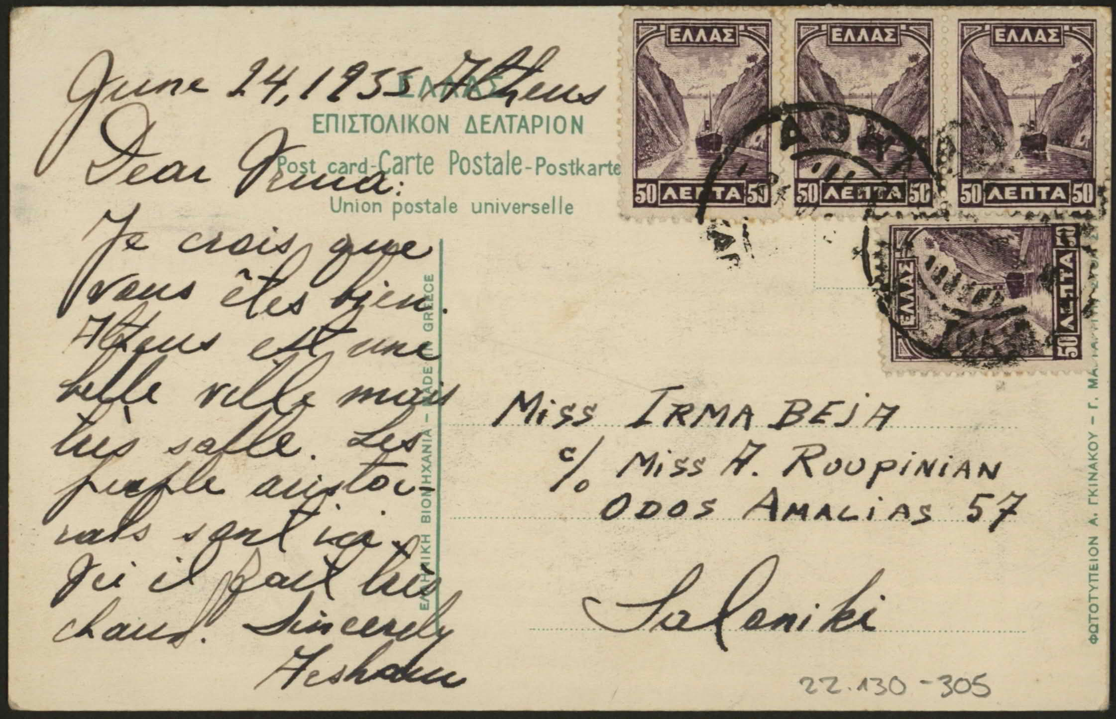 From Aesham (?) to Miss Irma Beja, c/o Miss A. Roupinian, Odos Amalias 57, Saloniki. "June 24, 1933, Athens. Dear Irma, Je crois que vous etes bien. Athes est une belle ville mais tres sale. Les … … sont ici. Ici il fait tres chaud. Sincerely, Aesham (?)".