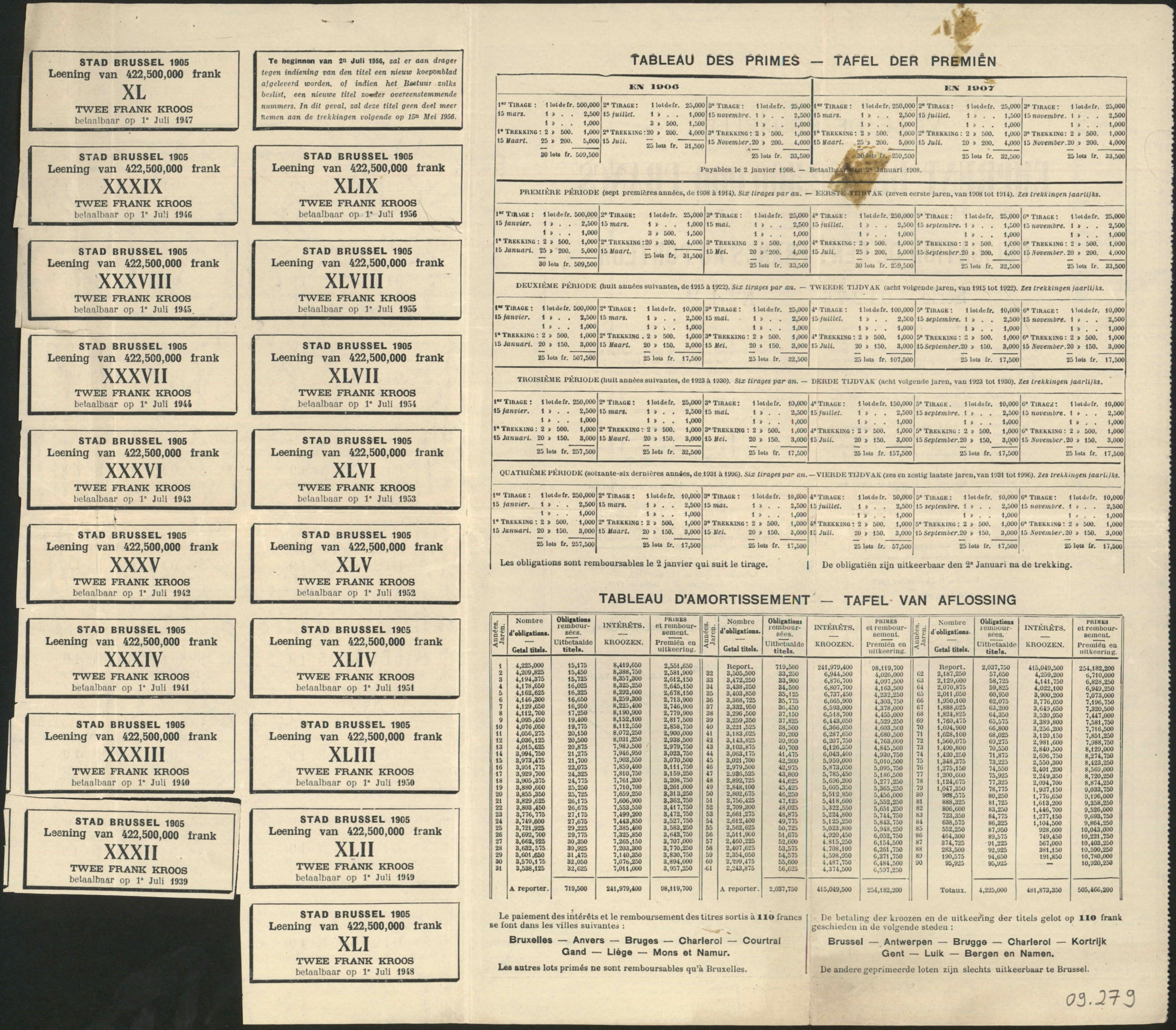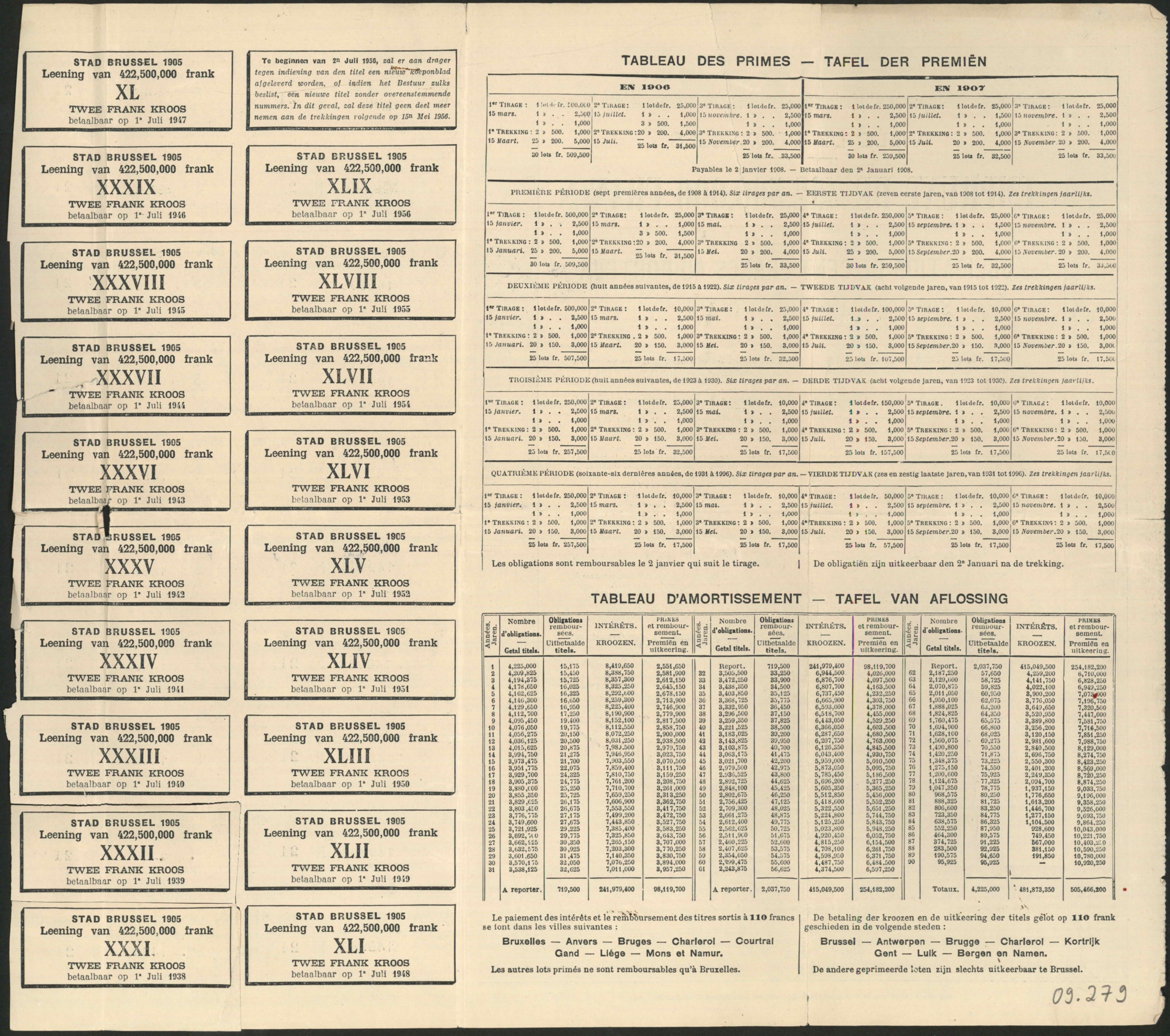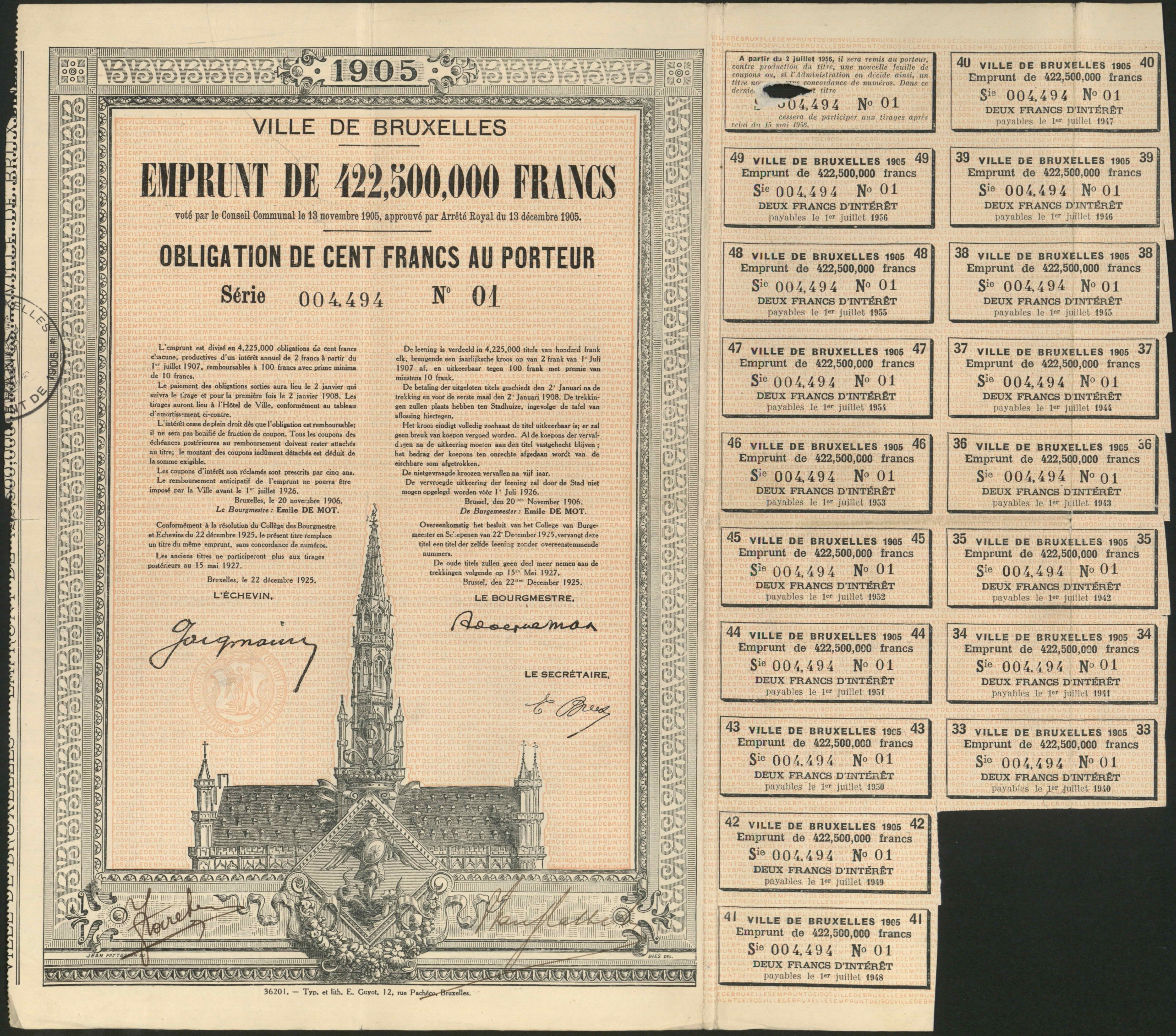 Bonds and an obligation, issued by the Municipality of Brussels, with coupons.