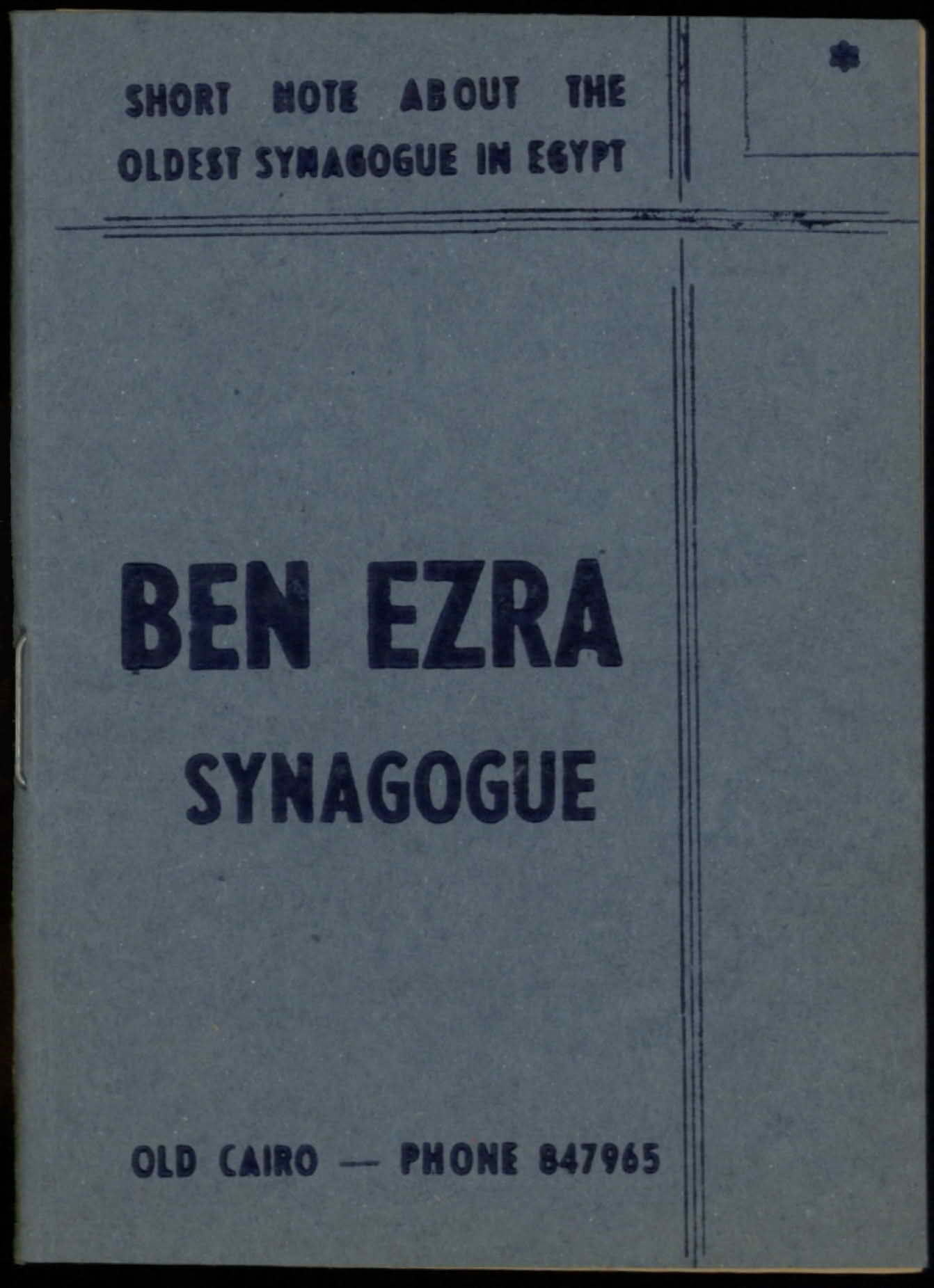 | dc.description | Booklet titled "Ben Ezra Synagogue", concerning the homonymous synagogue in Old Cairo, printed in Cairo. | |