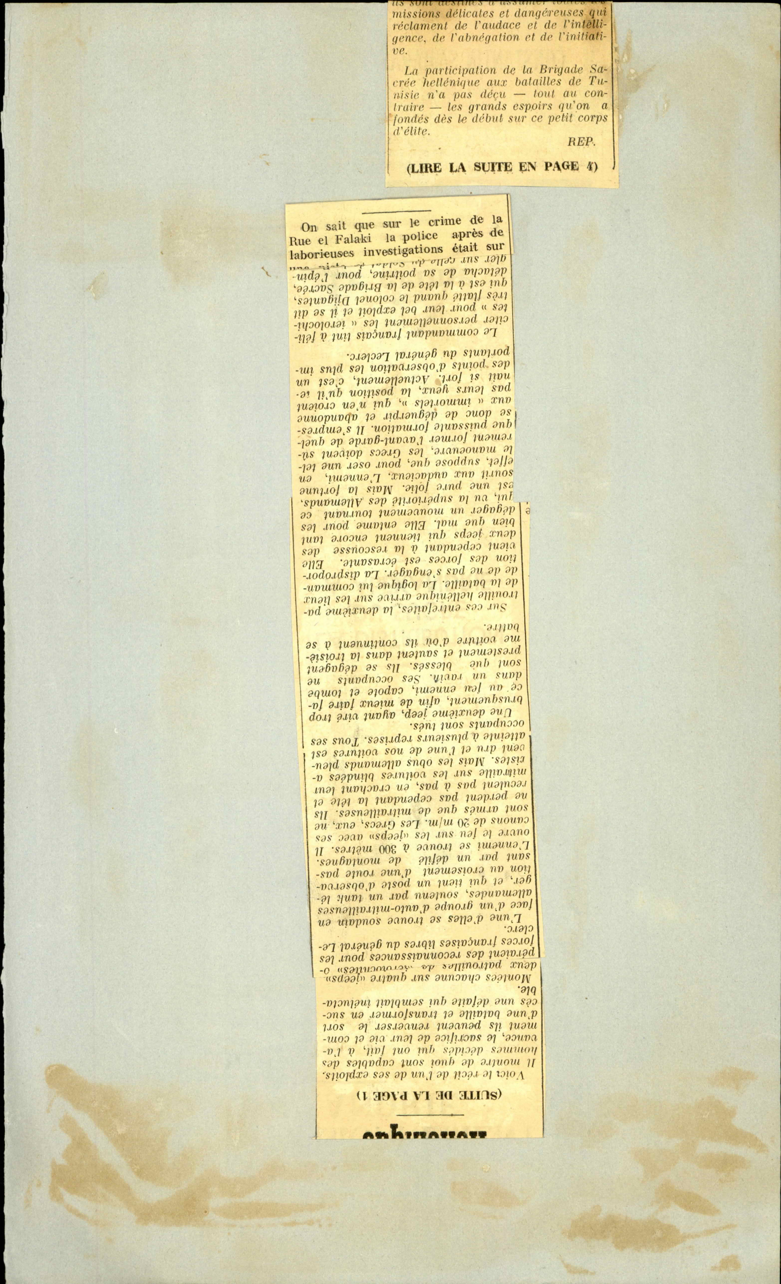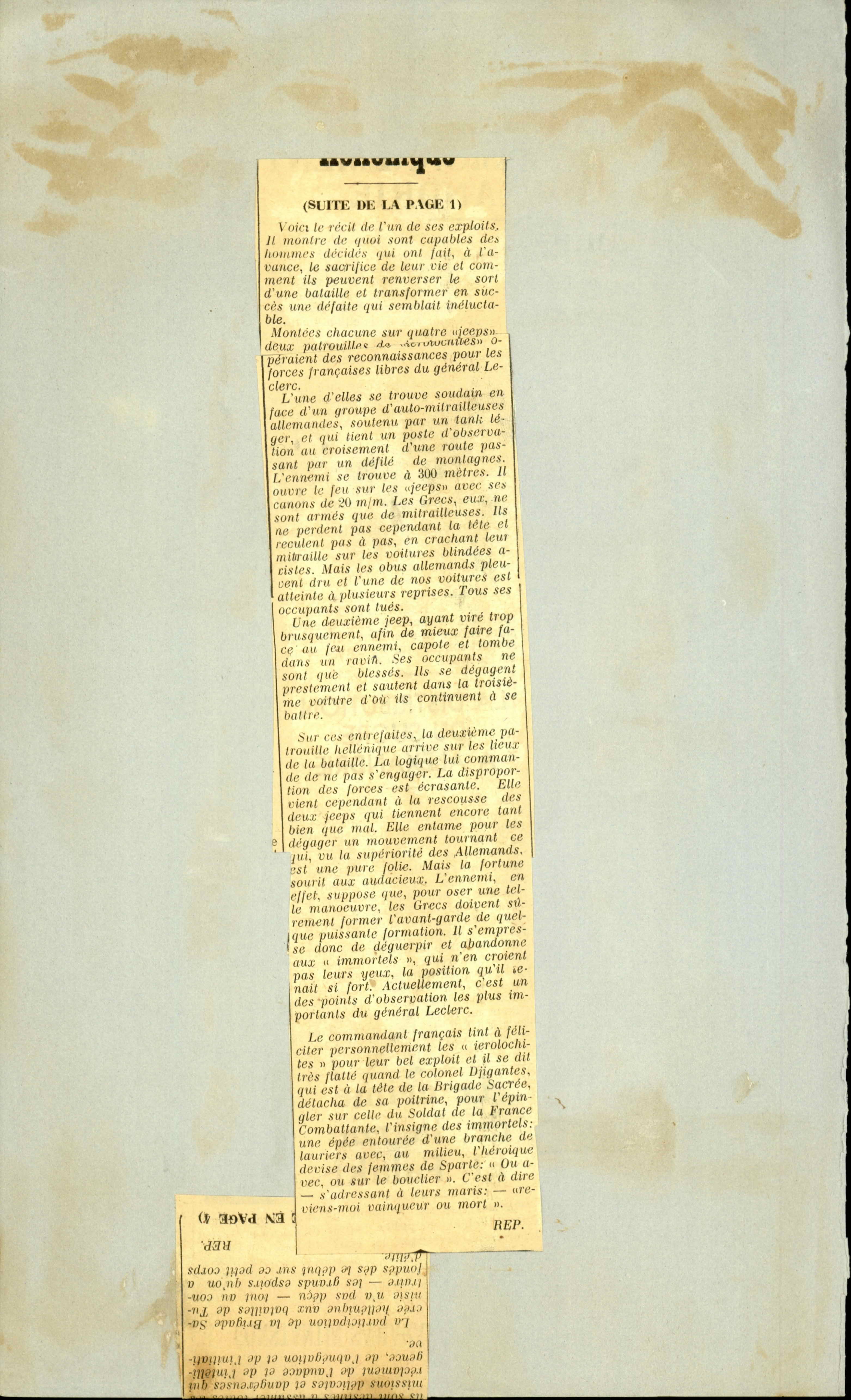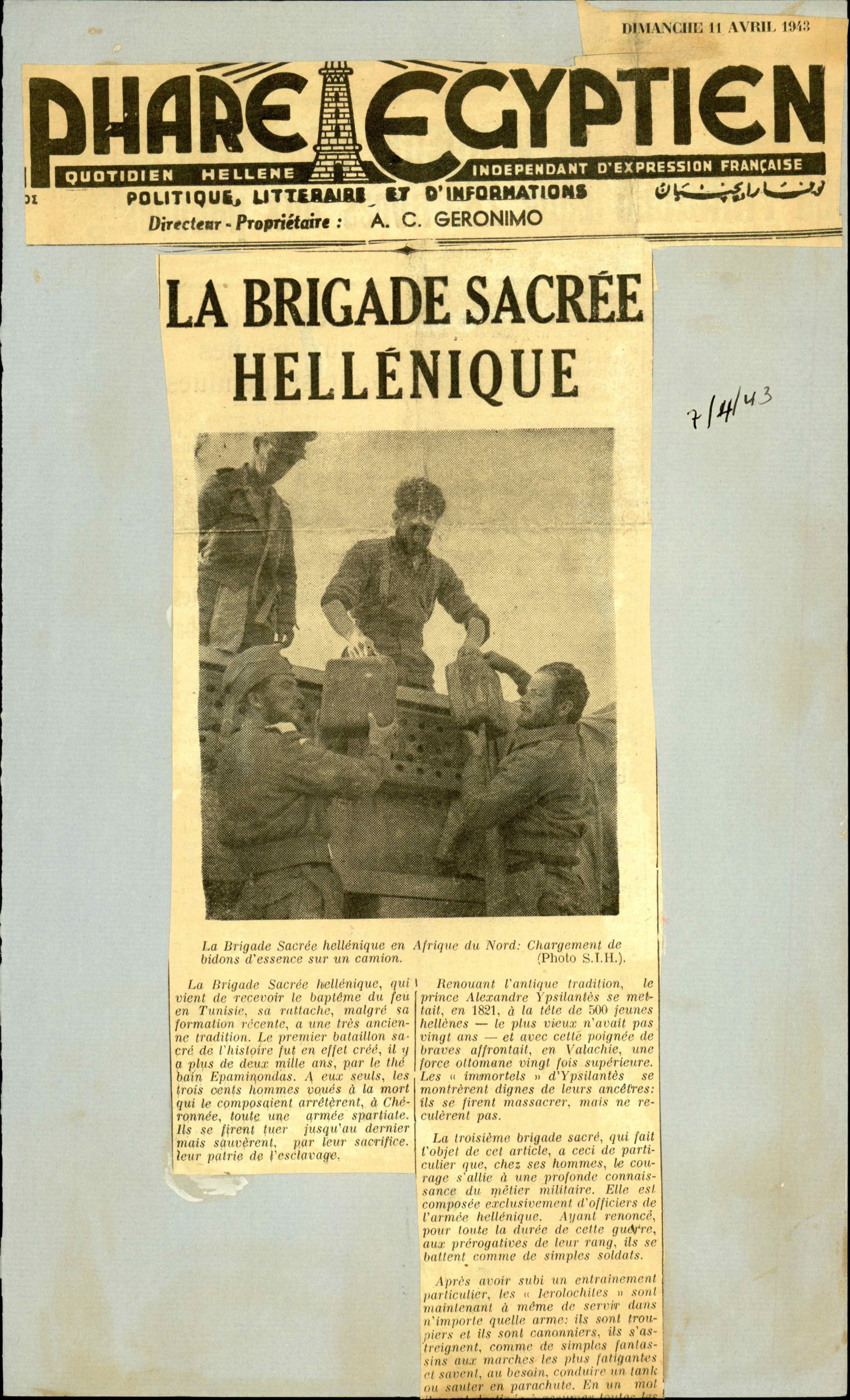 "Le Phare Égyptien" newspaper clippings, attached on paper, with article titled "La Brigade Sacrée Hellénique", April 11th, 1943.