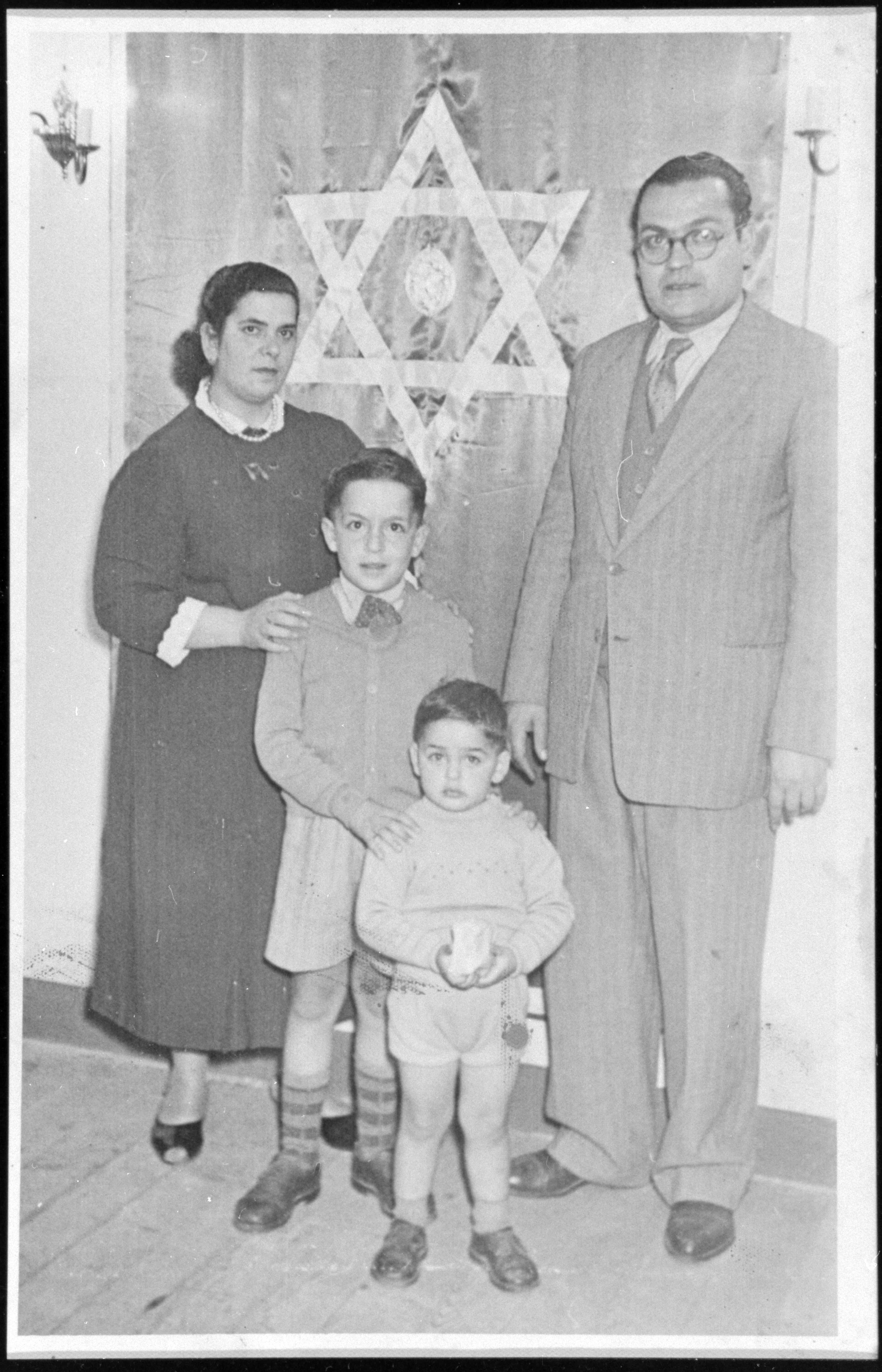 Eftichios Matathias family at the house of Gershon Matathias, 1955. From L to R Loukia M., Nissim, Moysis and Eftichios M.