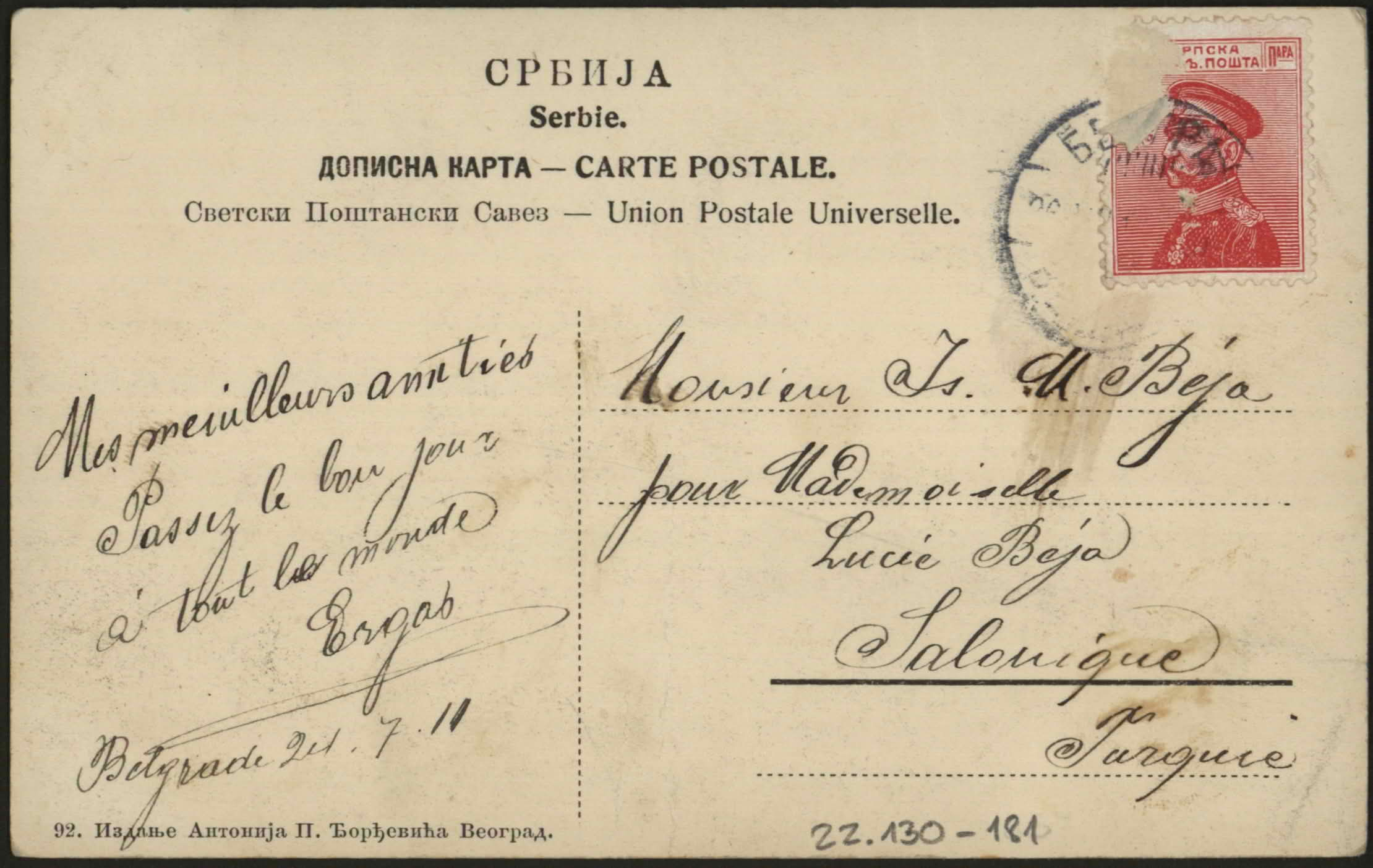 From Isac to Mademoiselle Lucie chez Is. M. Beja, Salonique, Turquie. "Ma chere fille, Je suis ici depuis mercredi, je crois que tu m'as envoye des lettres a Tourcoing ou j'ai demande ce jour par telegramme. Embrasse les chers freres et soeurs. Mille baisers de ton papa Isac, 28/7/911".