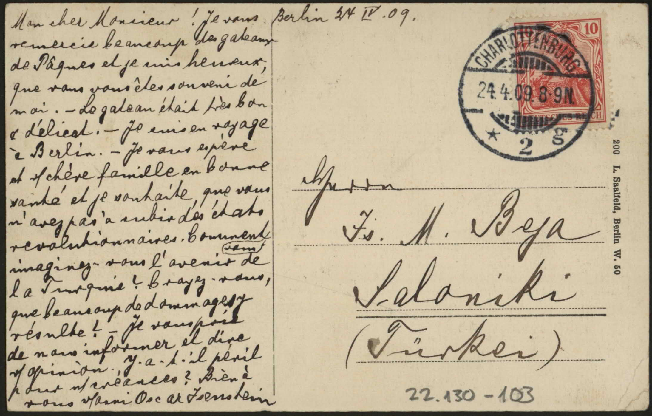| dc.description | From Isac to Mons. Is. M. Beja, Salonique, Turquie. "Caro Alfredo, esparo meldarvos (?) con estima, Isac, 3/8/09. Me topa aki dio de alier tadre el lugar es magnifico. Me topa en buena comp. ardi de partio esta tadre por Vienna. Esto muy encuy dado par el partire por Leskoratz (Serbia)". | |