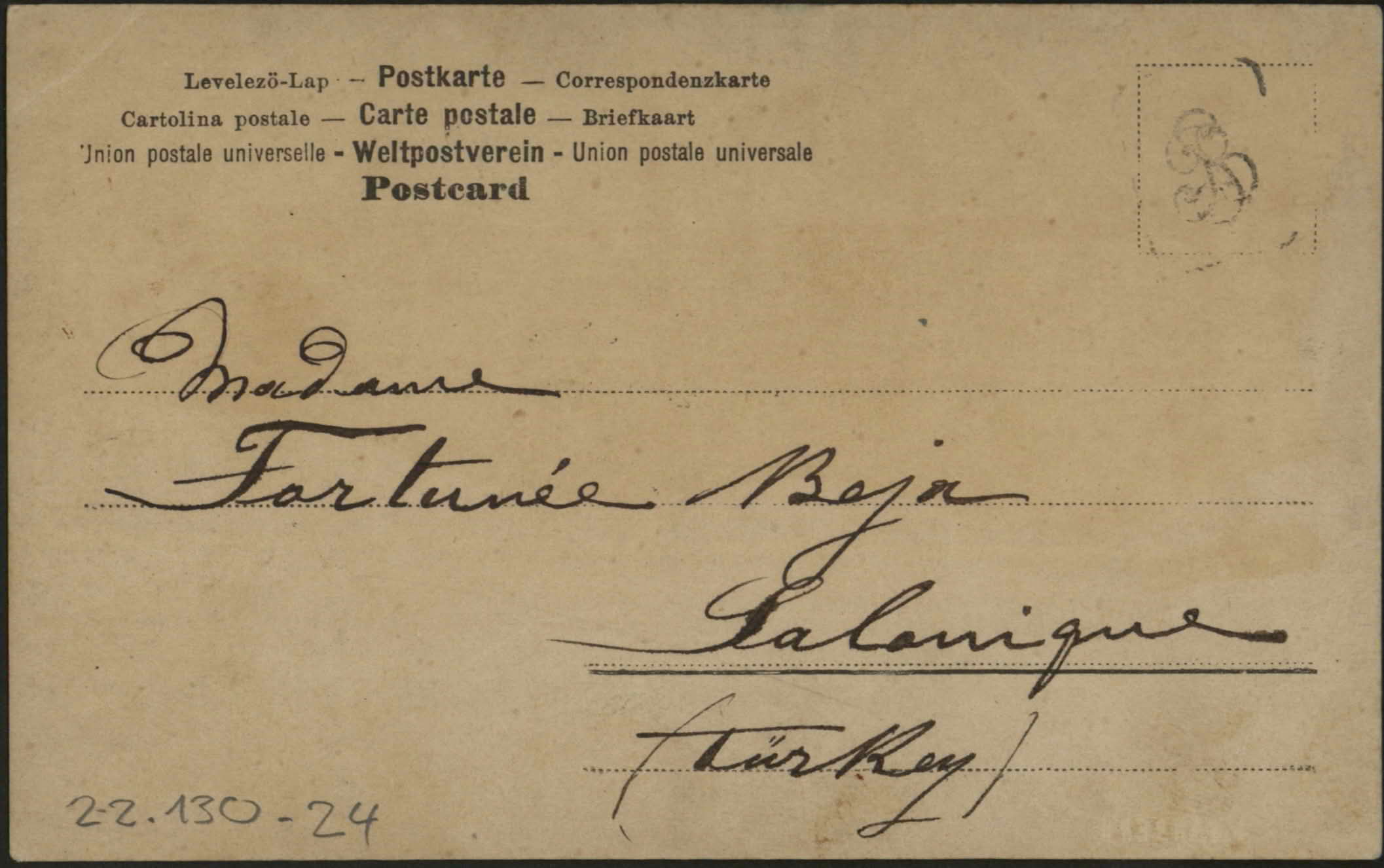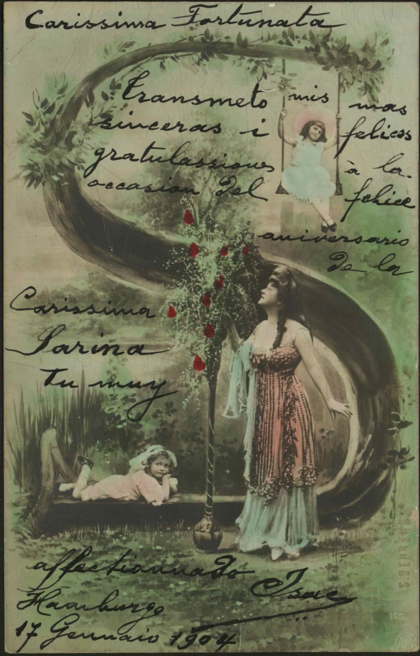 A montage depicting women and two girls in an imaginary garden. From Isac to Madame Fortunee Beja, Salonica, Turkey. "Carissima Fortunata, transmeto mis mas sinceras i feliers (?) gratulassiones a la occasion del fehier (?) aniversario de la Carissima Sarina Tu muy affectionnado, Isac, Hamburgo, 17 Gennaio 1904".