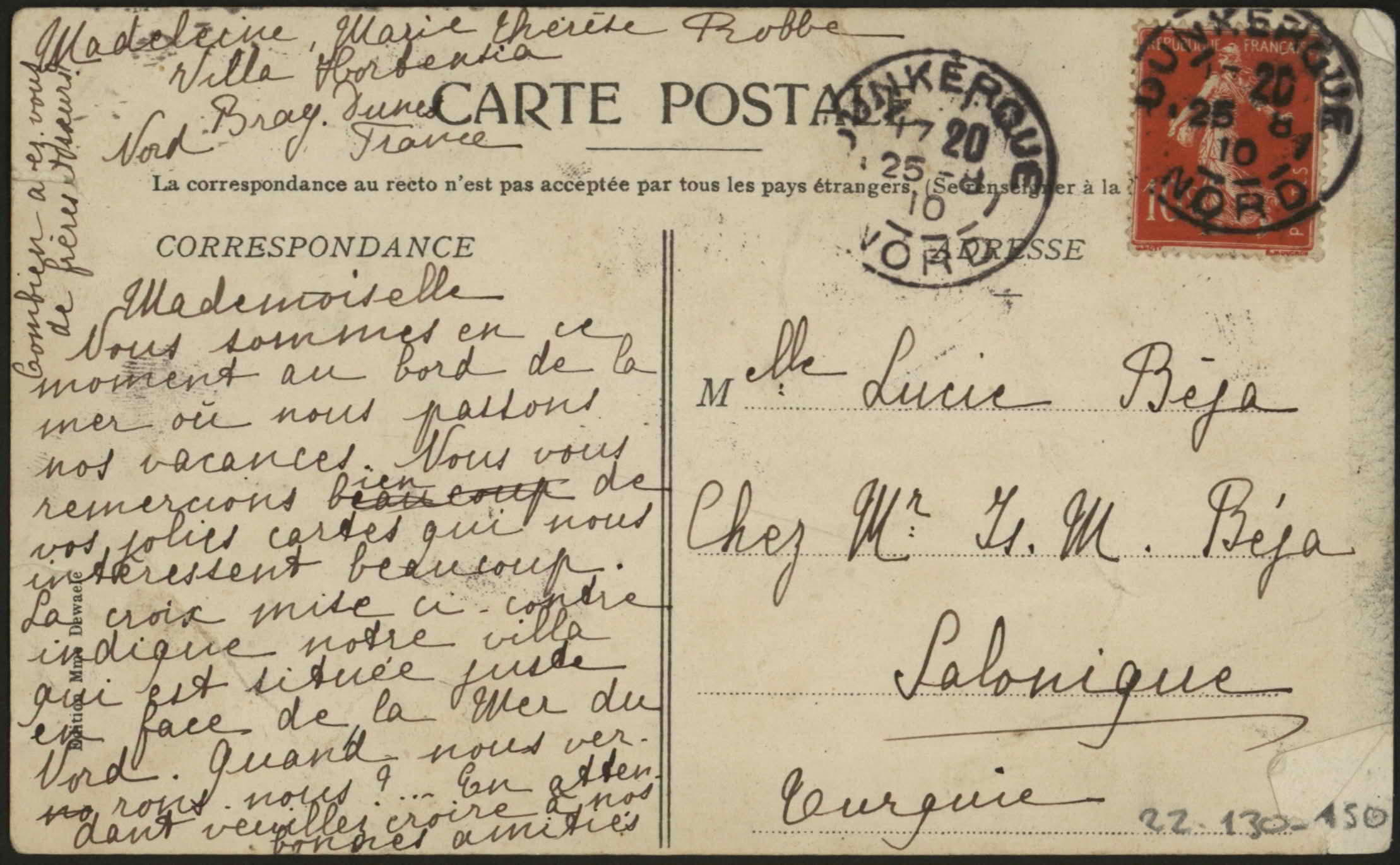 To Illustrissimo Signor Is. M. Beja, Representante, Salonique. "Roma, Agusto, Car. Fr., Ritornando di viaggio trovo la sua cartolina graziosa, chi mi prova che lu non ha dementicuto ancora le qualche ore passate insume. Spero sempre di rincontrare di nuovo le persone simpaticissime delle missione Givrani Turchi. Denotissimo, …".