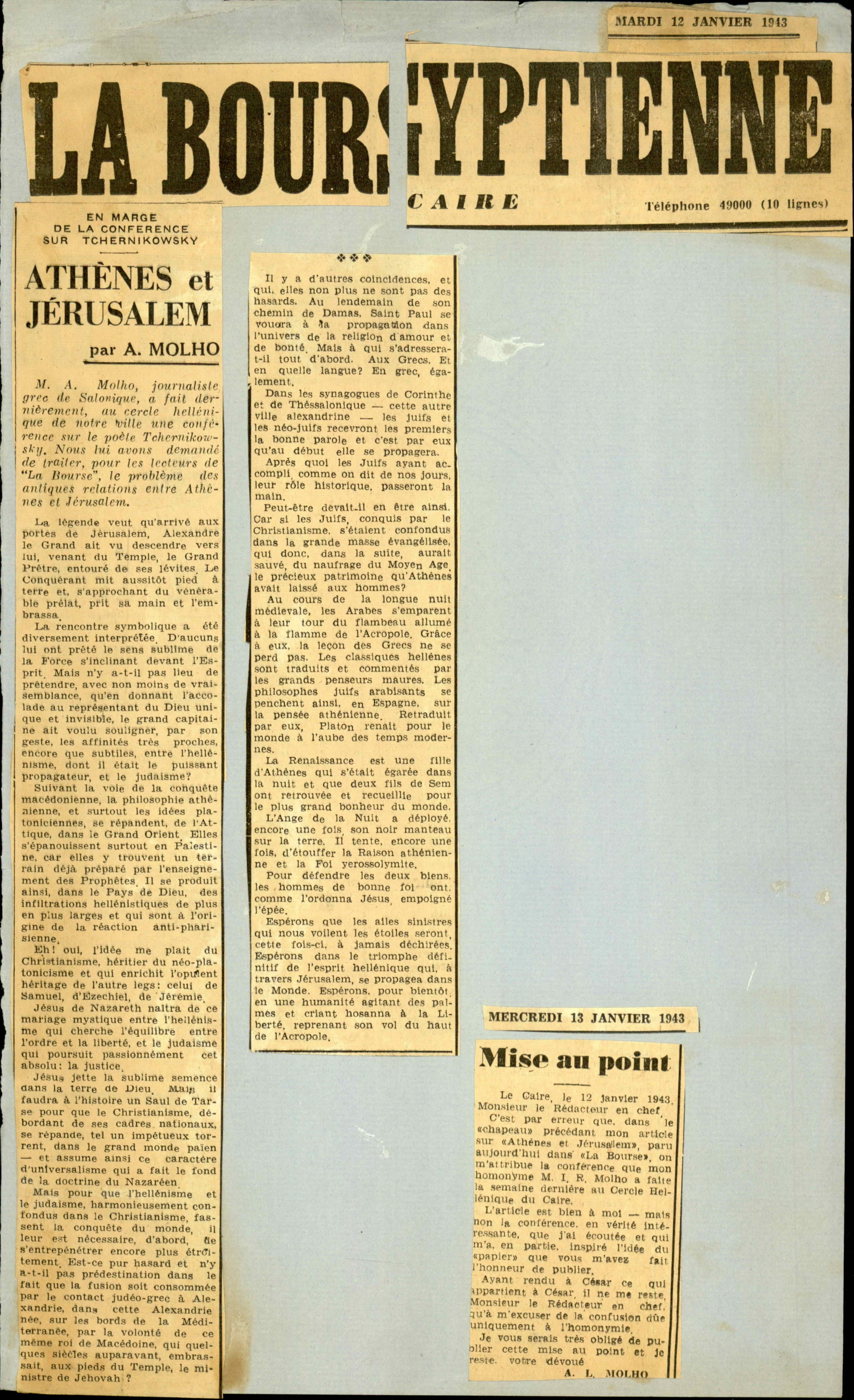 "La bourse égyptienne" newspaper clippings, attached on paper, with articles titled "En Marge de la Conférence sur Tchernikowsky: Athènes et Jérusalem", January 12th, 1943 and "Mise au point", January 13th, 1943, both written by A.L. Molho.
