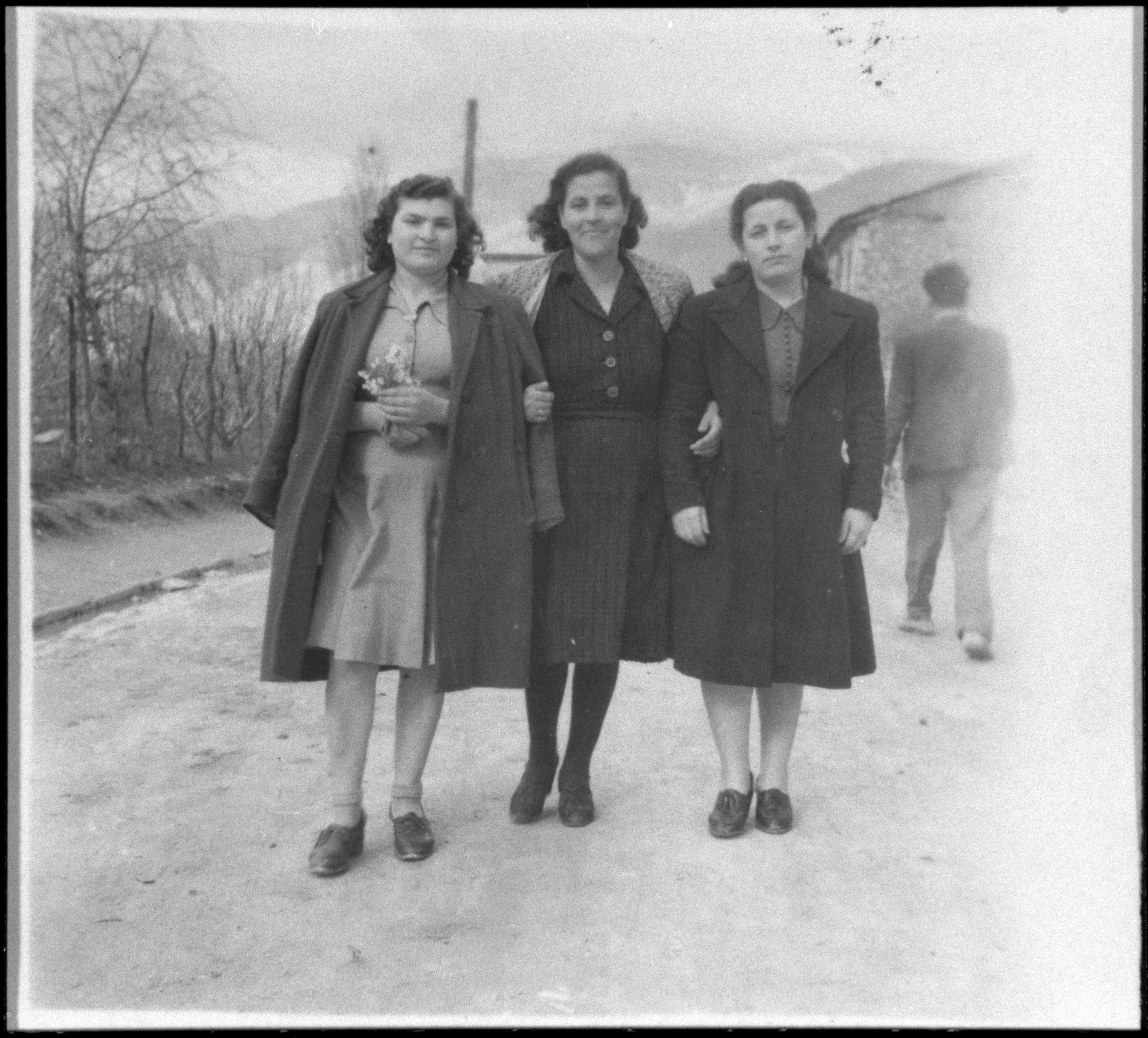 Three Jewish women from Ioannina on a street in Ioannina. From left: Esther Giosekou, Nina Battinou, Rachel…? (donated by Joseph Battinou)