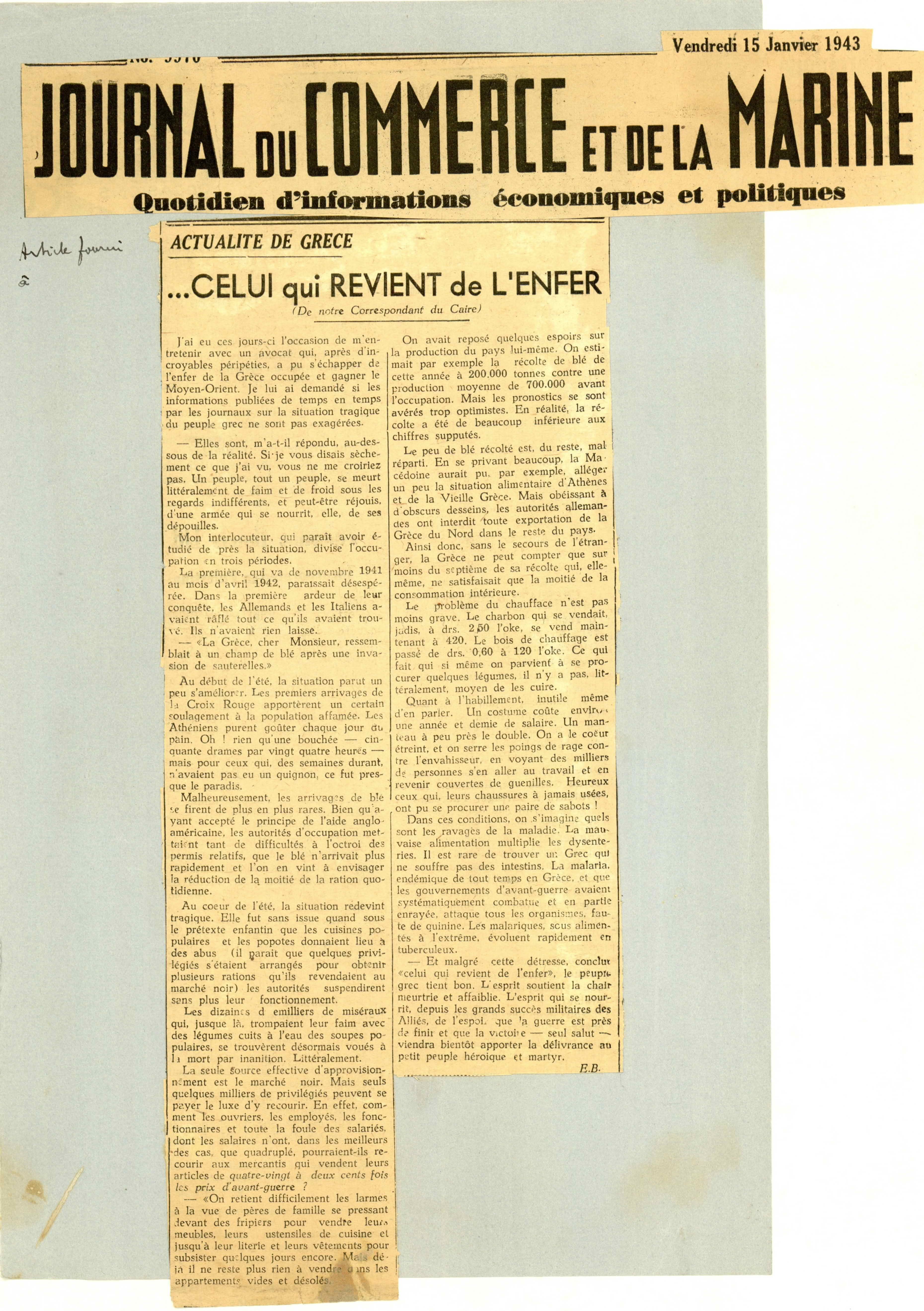 "Le journal du Commerce et de la Marine" newspaper clippings, attached on paper, with article titled "Actualité de Grèce: Celui qui Revient de l'Enfer", January 15th, 1943.