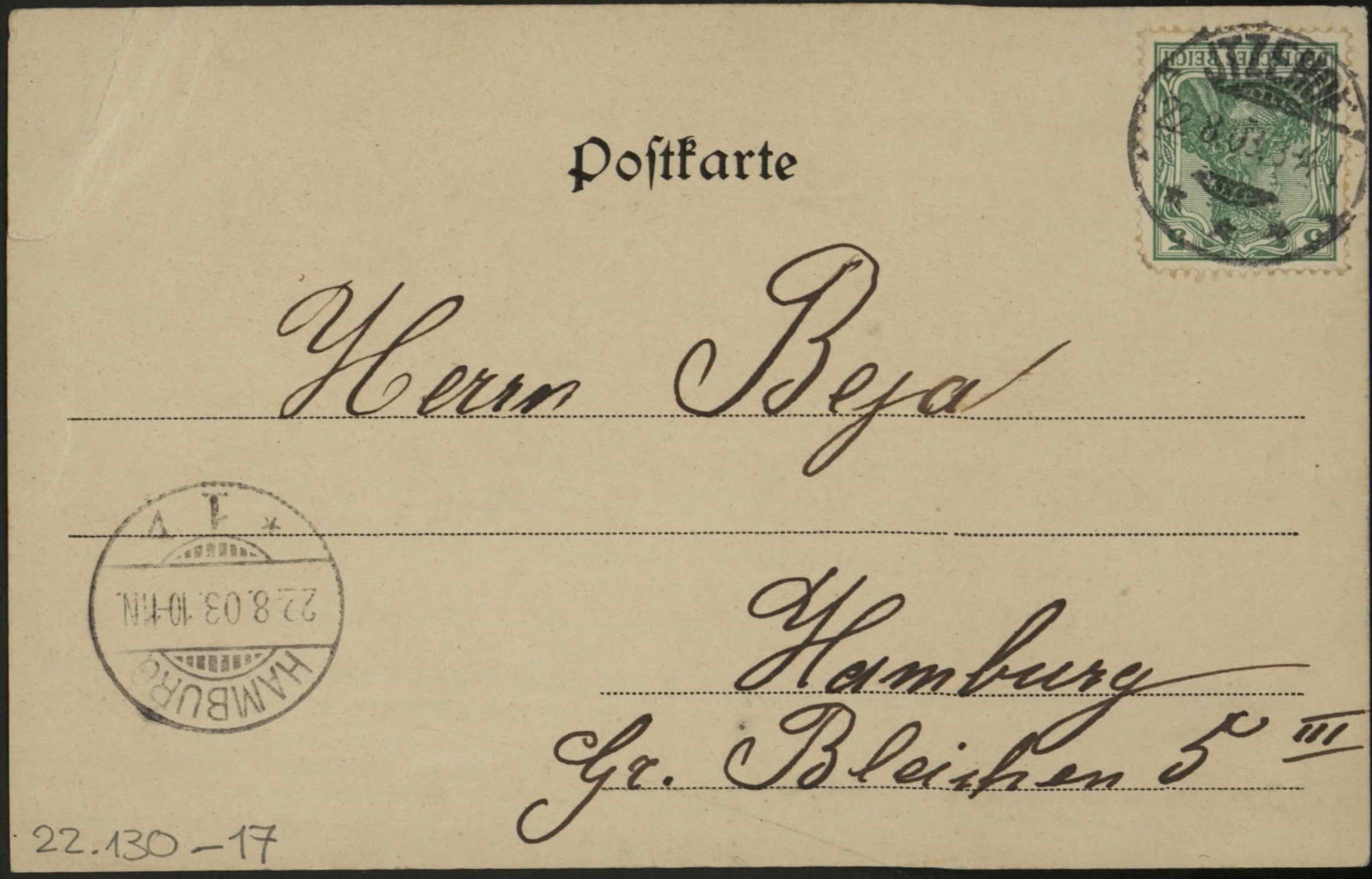 To Herrn Beja, Hamburg, Gr. Bleichen 5 III. "21. August. "Freundliche Gruesse … Frieder."