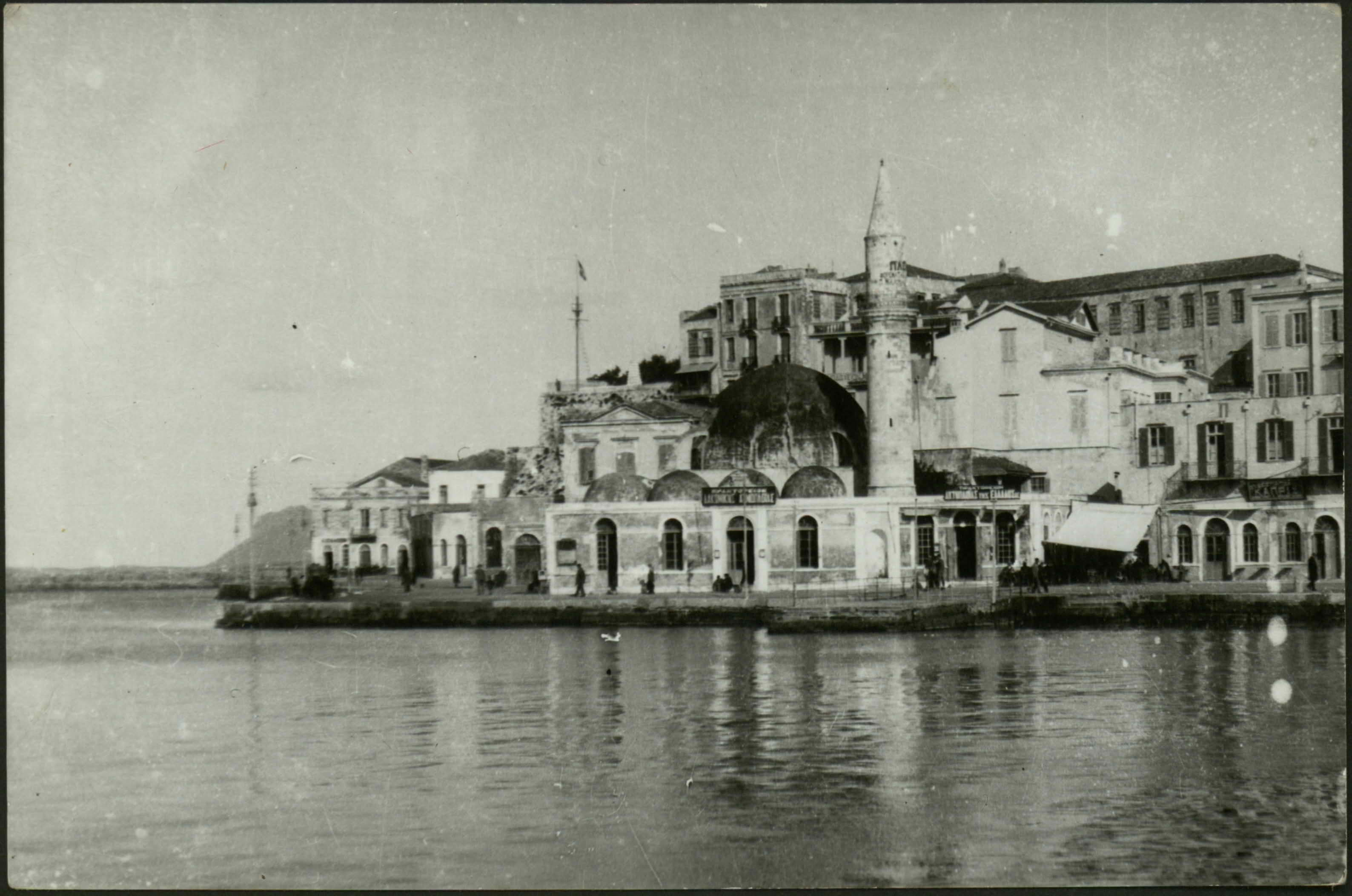 B/w picture of the port of Chania, Crete and the Yali Tsamissi Mosque.