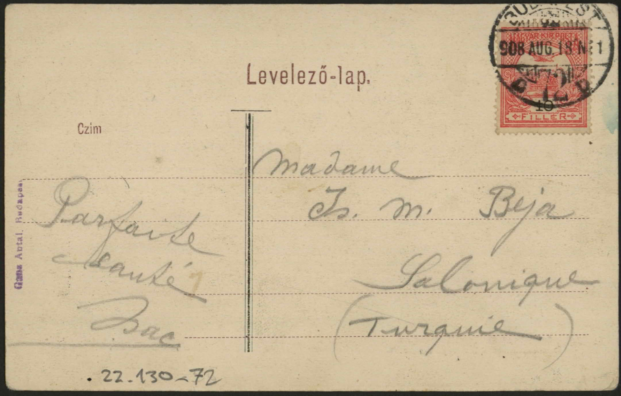 From Isac to Mme. Is. M. Beja, Salonique, Turkey. "Cara Fortunata, Vine par reposame los diaz, as un lugar manifico con luges de faras teros, i esmasos passeios, ma esta agiendo luvia, parto por Cologna, Te saludo ginuto los ojos, Isac. 24/08/08".