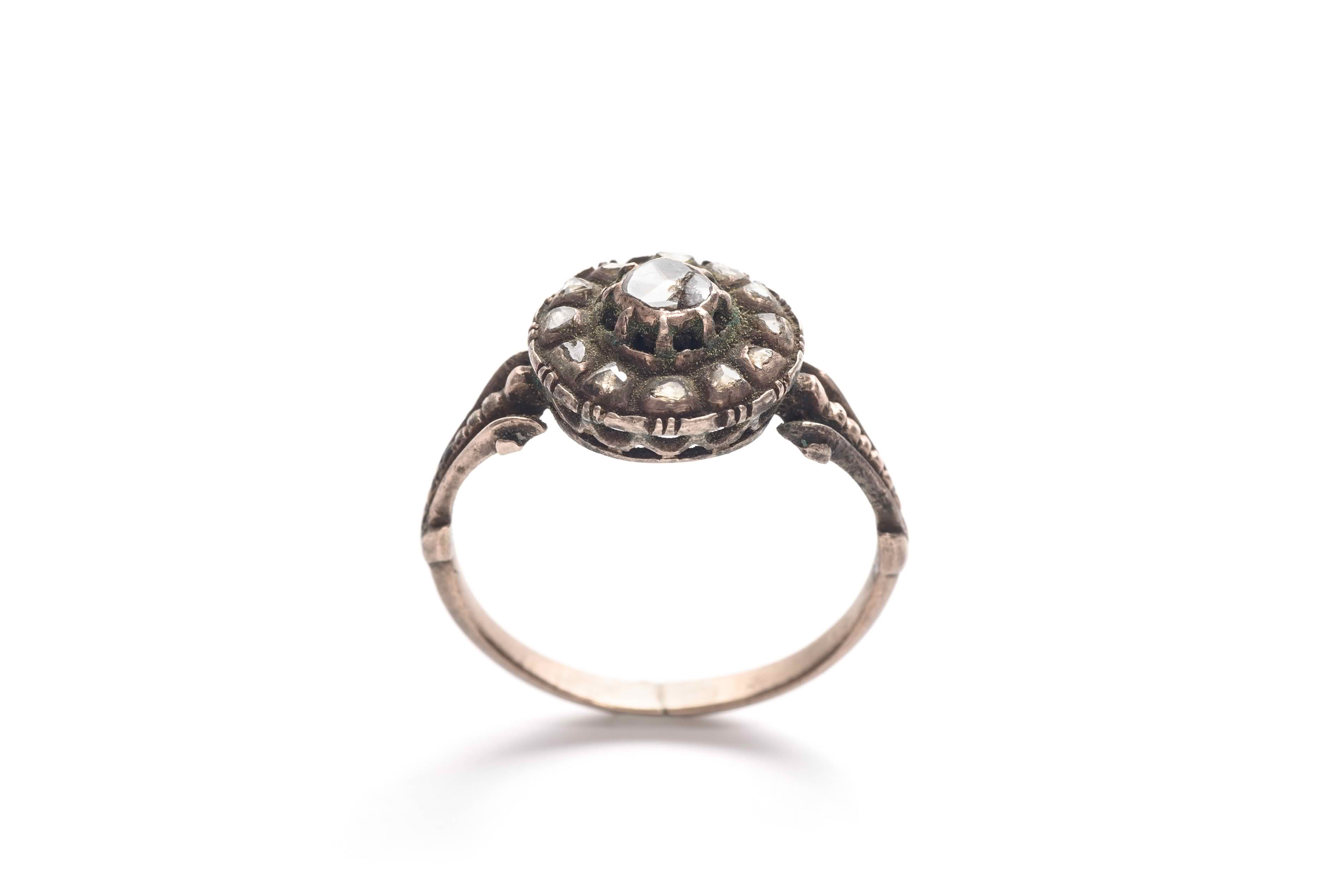 Woman's gold ring, openwork bezel with cluster setting, central diamond surrounded by twelve diamonds (rosette).