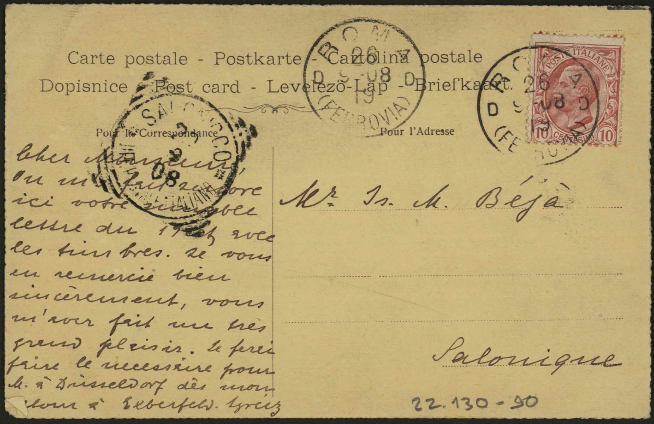 From Isac to Mme. Is. M. Beja, Salonick, Eur. Tuerkey. "Parfaite sante, part pour la Belgique, Isac, 27/8/08".