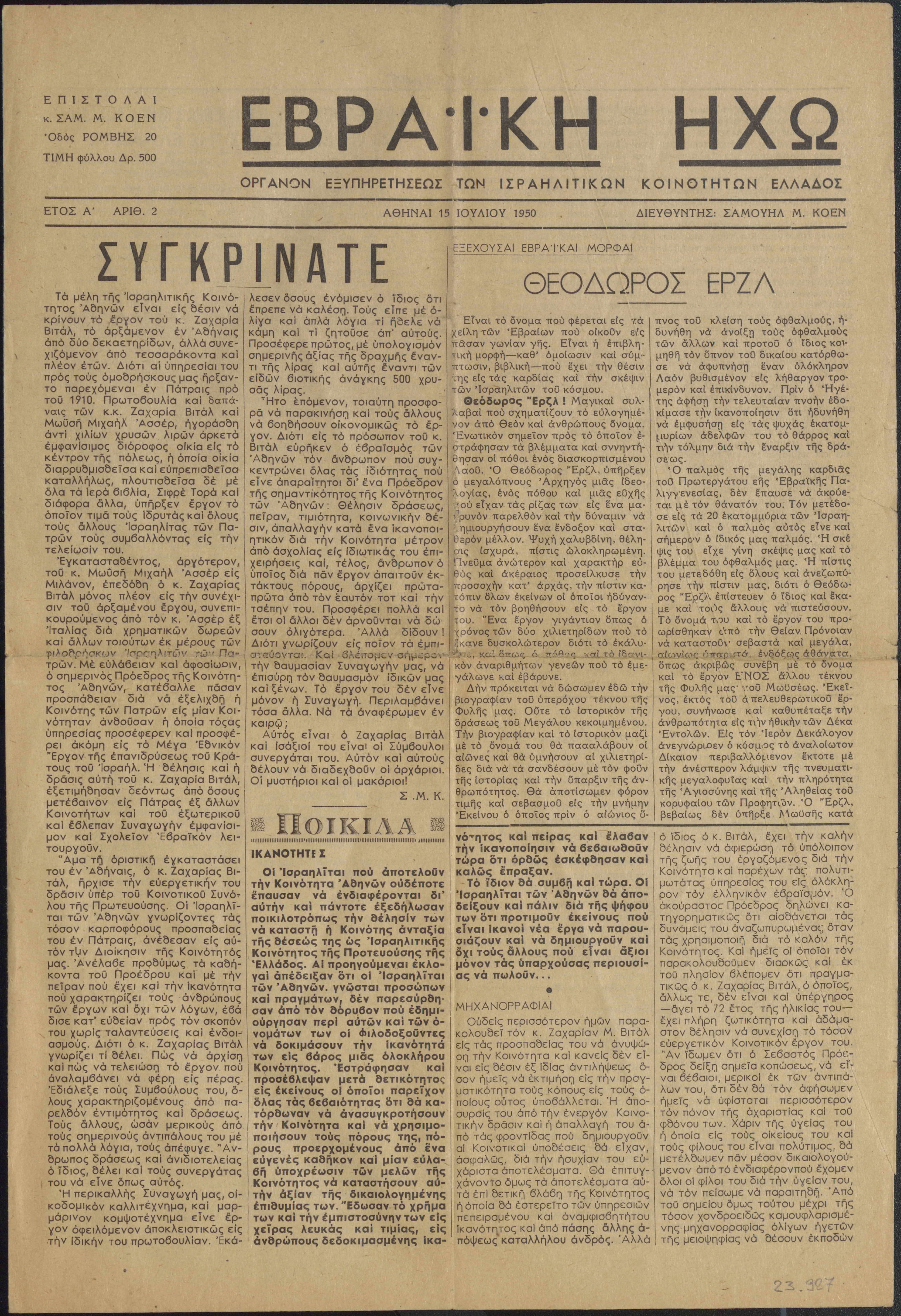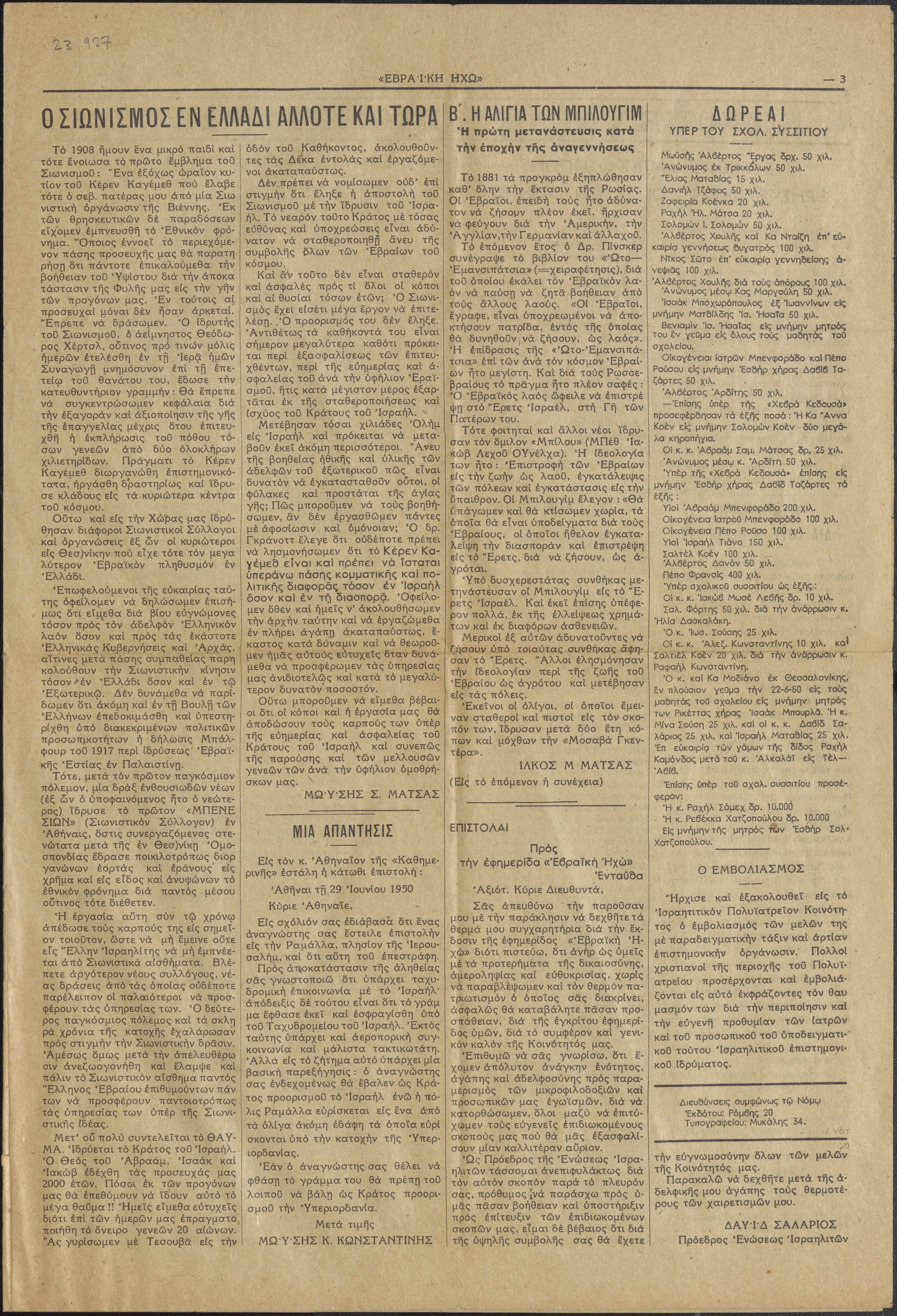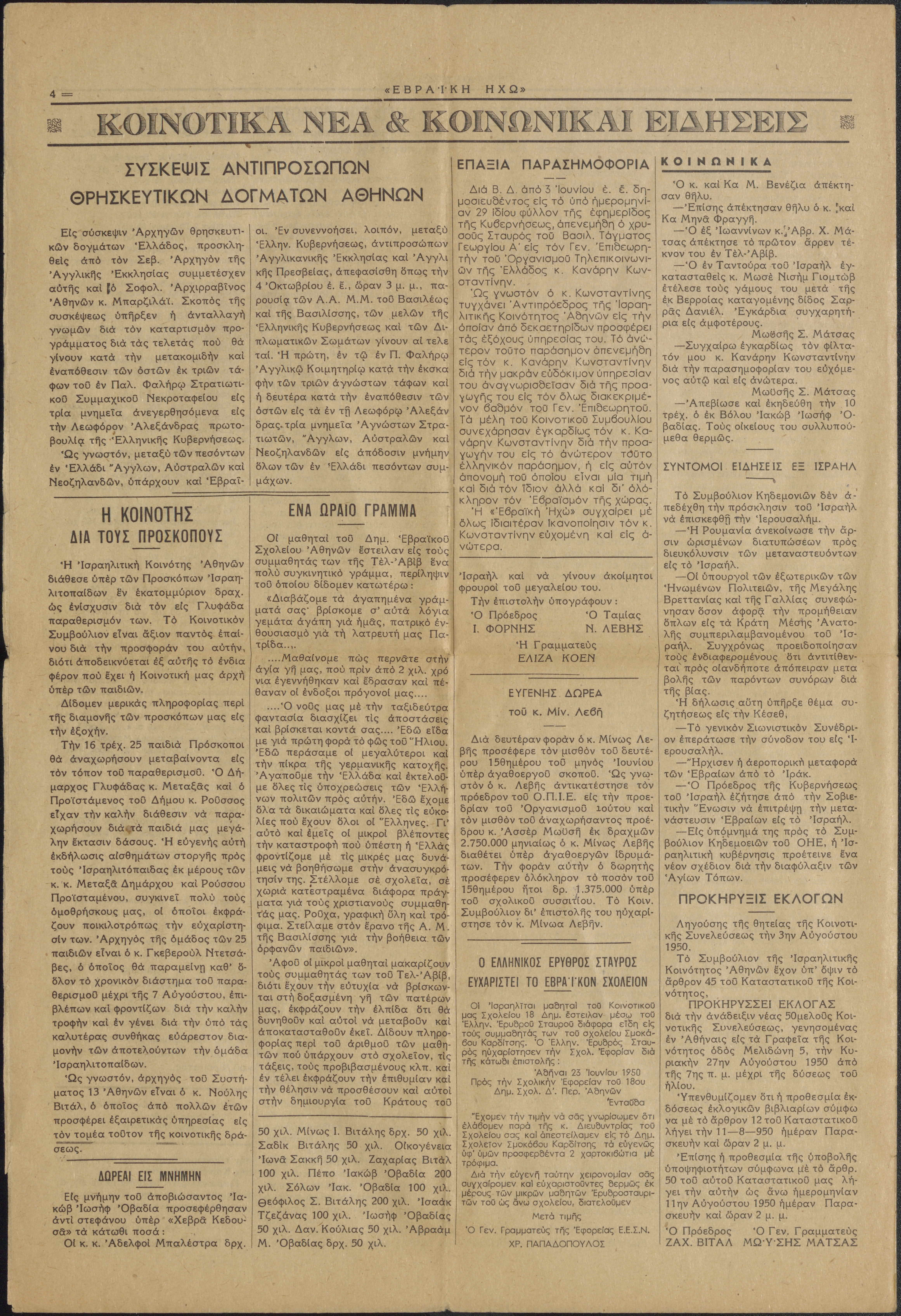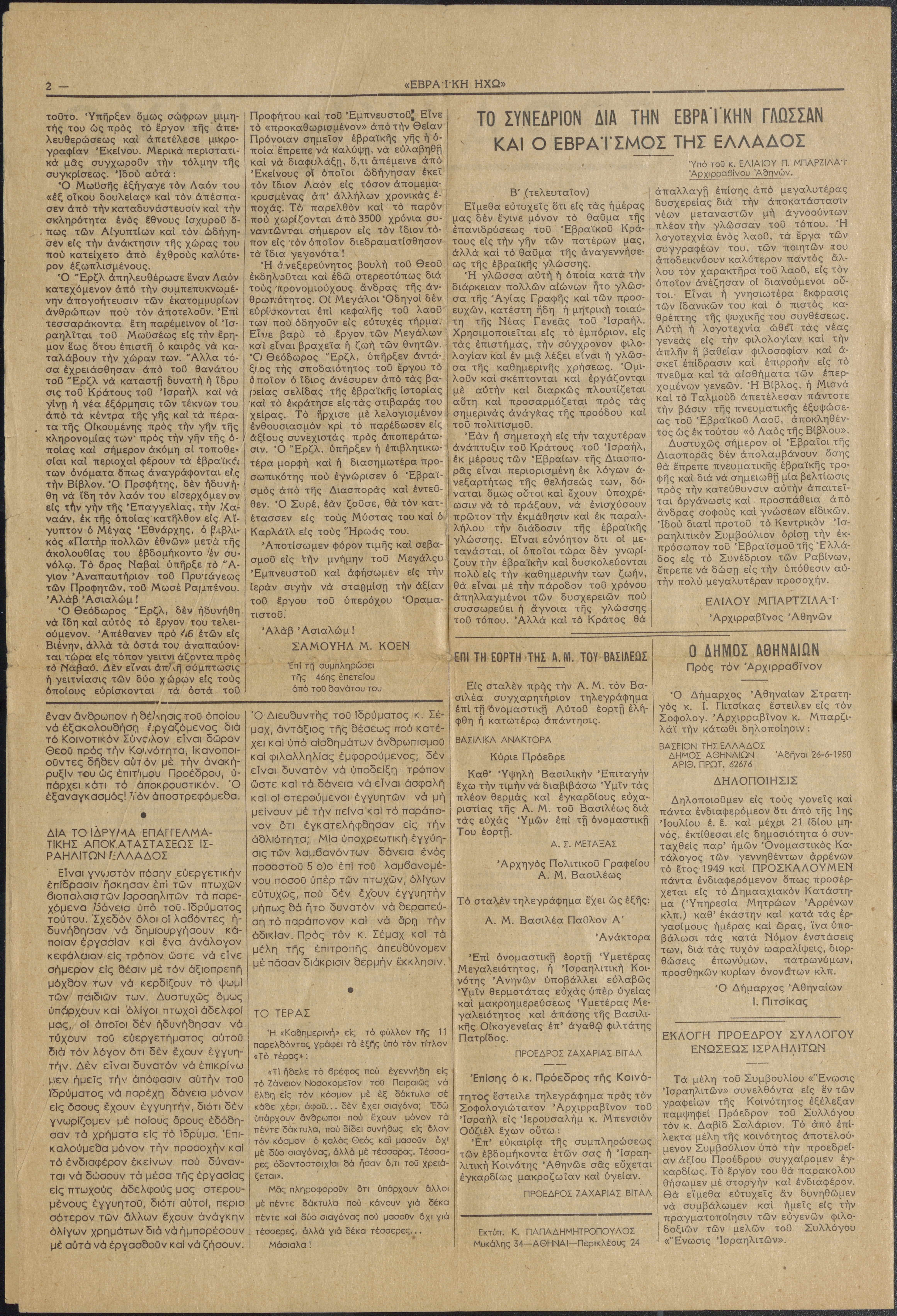 Fortnightly review of the Jewish Community of Athens. The newspaper had no advertisments or photographs.
