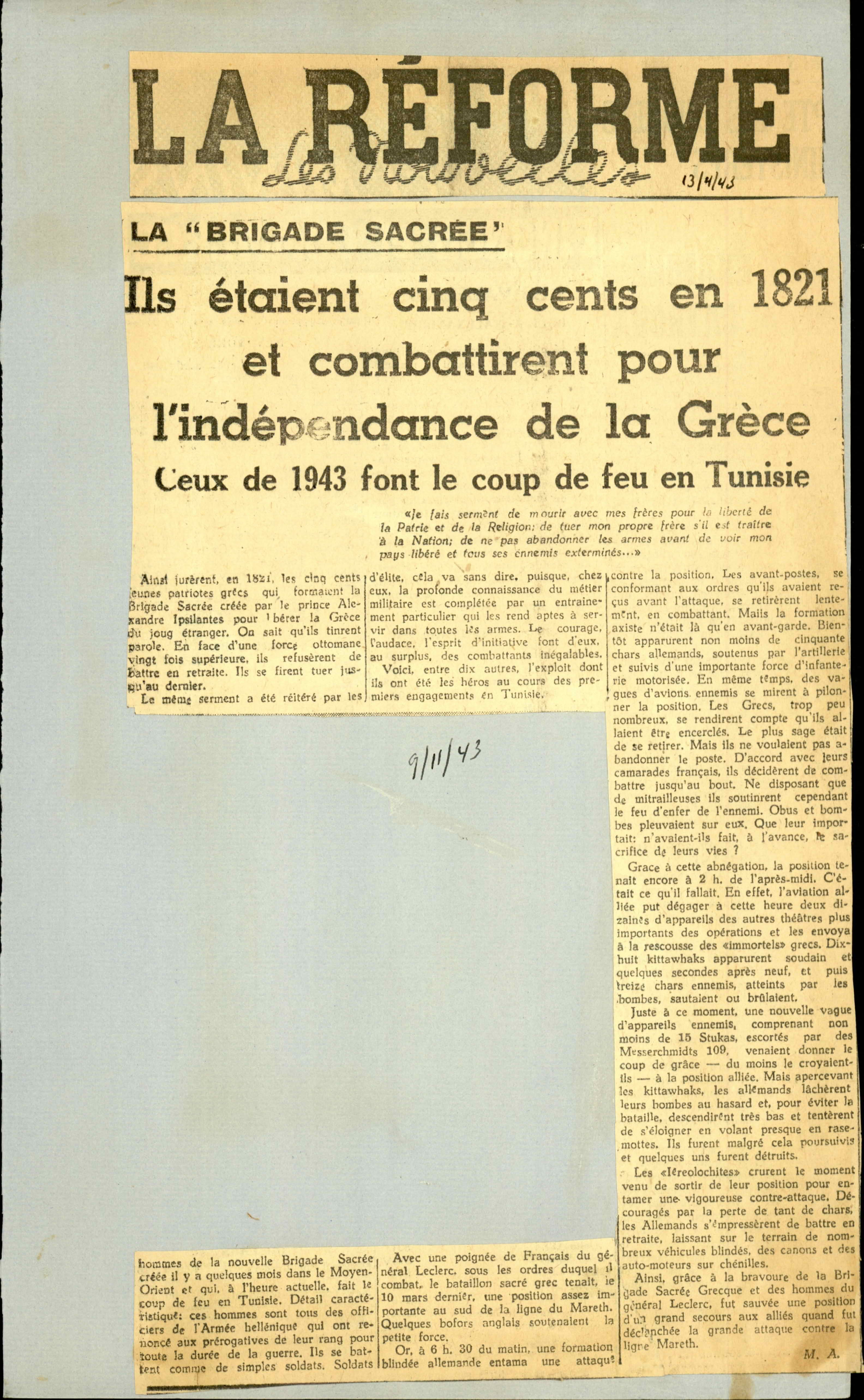 "La Réforme" newspaper clippings, attached on paper, with article titled "La "Brigade Sacrée". Ils étaient cinq cents en 1821 et combattirent pour l'indépendance de la Grèce" by A. Molho, April 13th, 1943.
