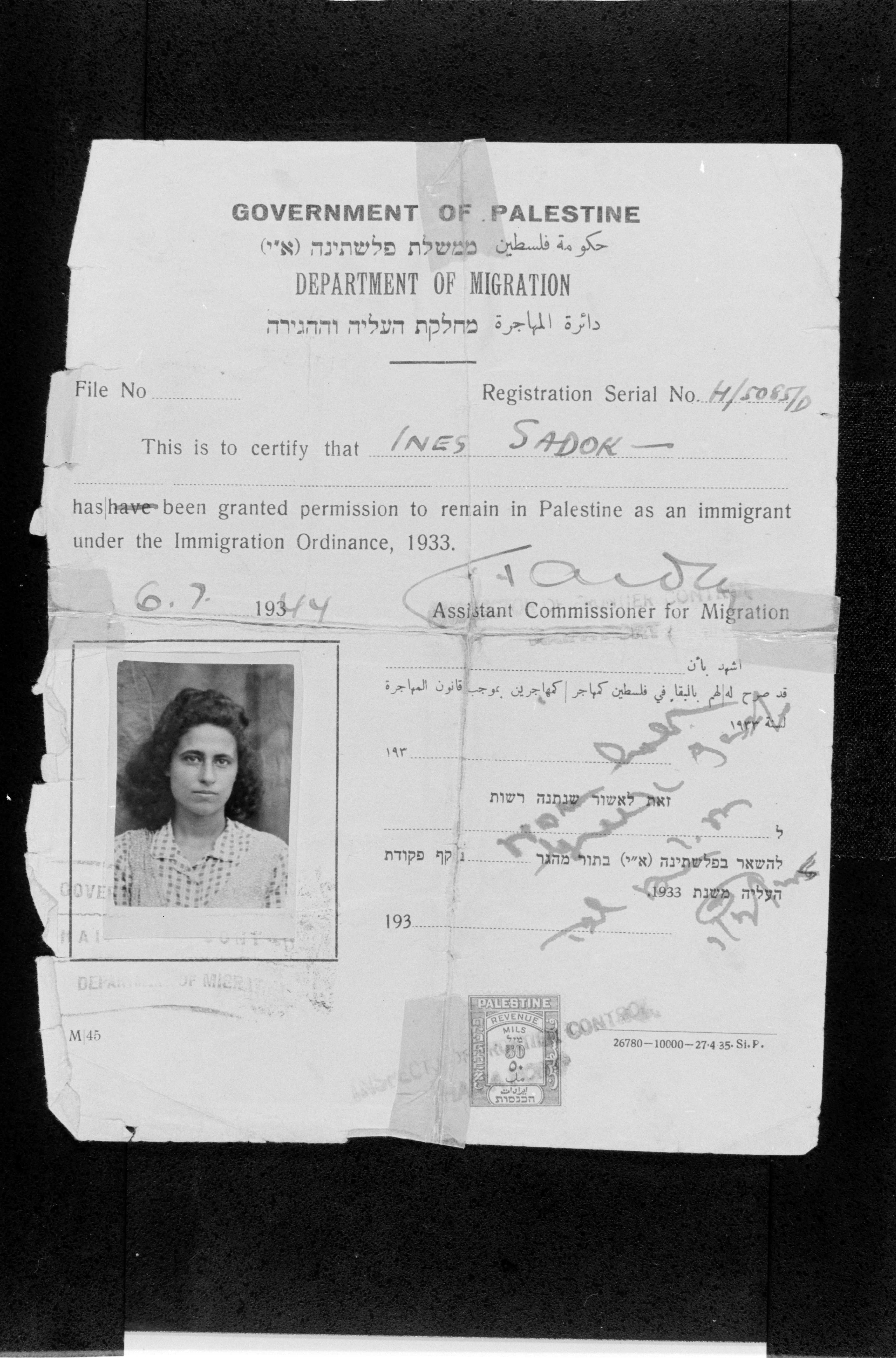 Residence permit in Palestine for Ines Sadok, issued in Haifa in 1944
