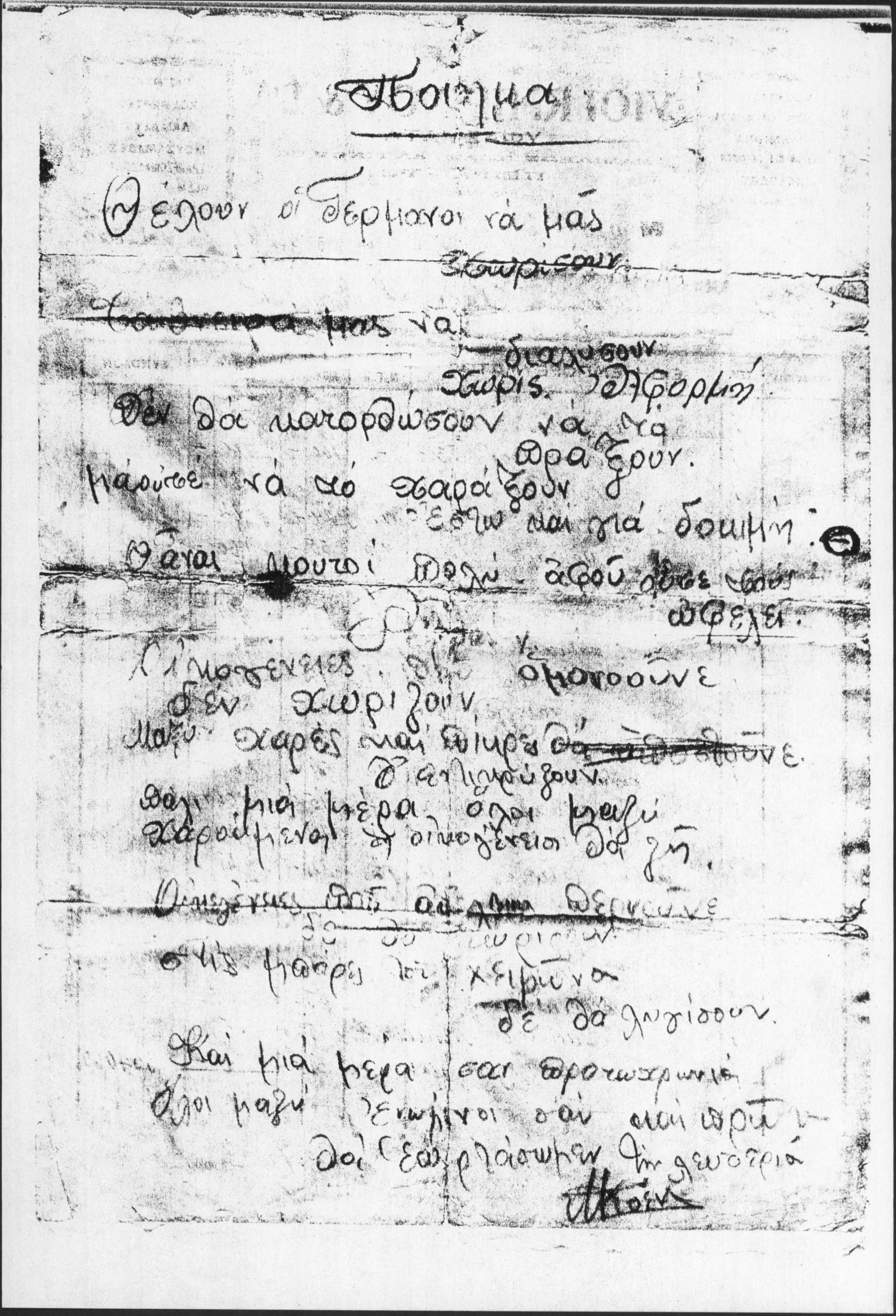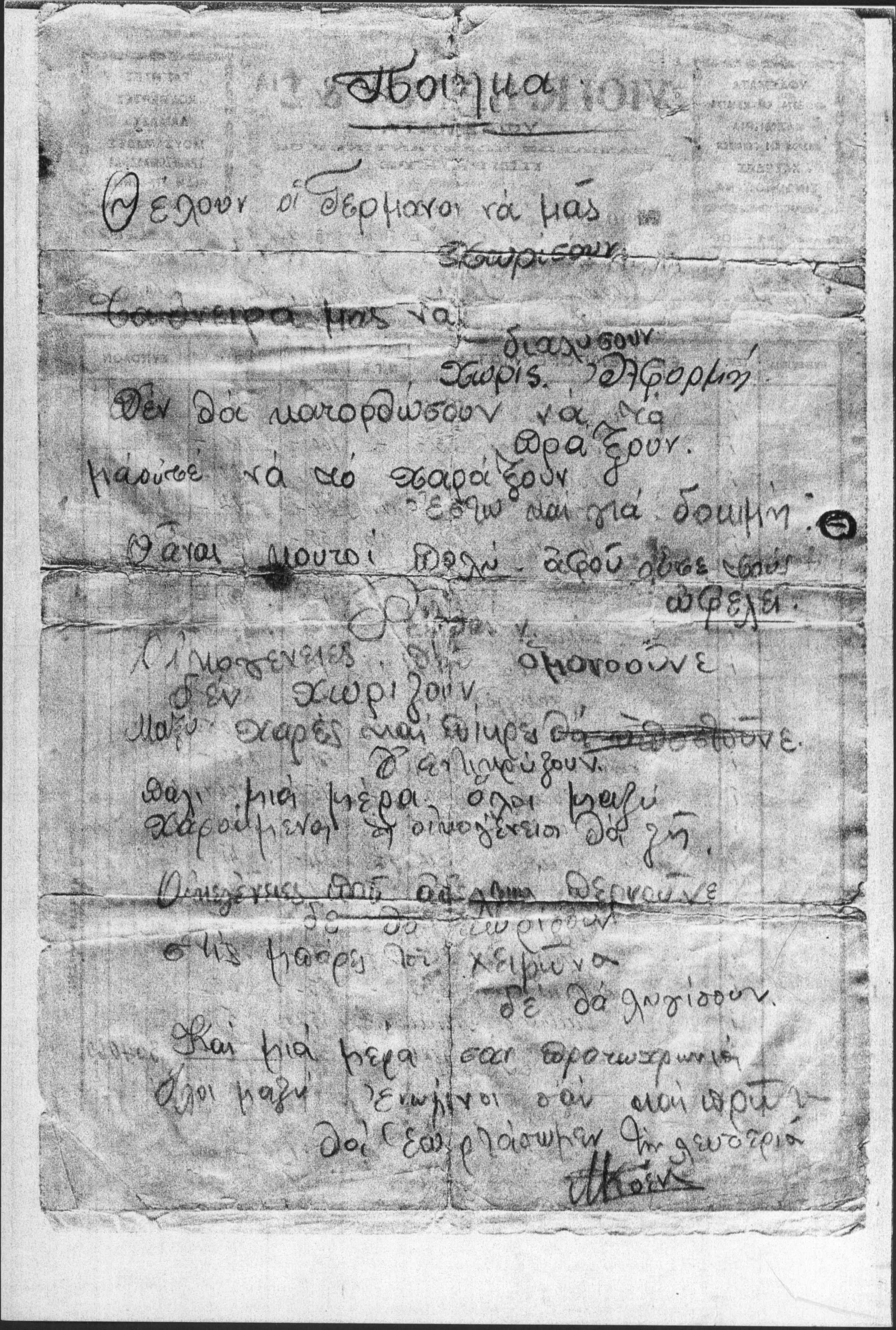 Photocopy of a liturgical poem, Piyyut, written during the occupation by Mantaio (Mathaios) Michael Cohen