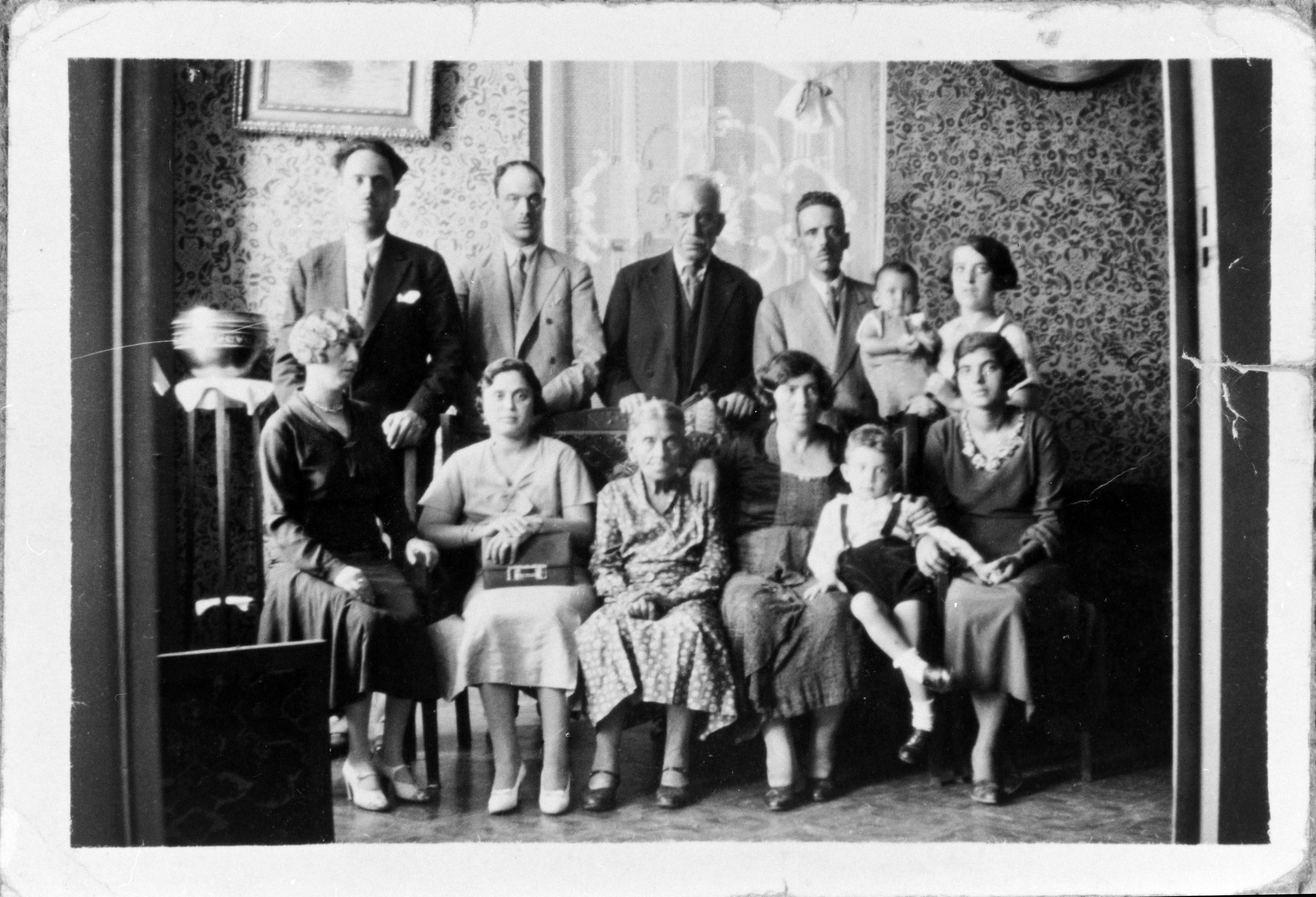 Photograph of a family at their home on Palamido Street: standing from left, Moses' uncles, Alekos and Raphael, David's grandfather, Kanaris' father with little Moses in his arms. Seated in front from left, his aunts Jeanette and Donna, his grandmother Eutychia, his mother Marie with his brother David, Athens, 1934