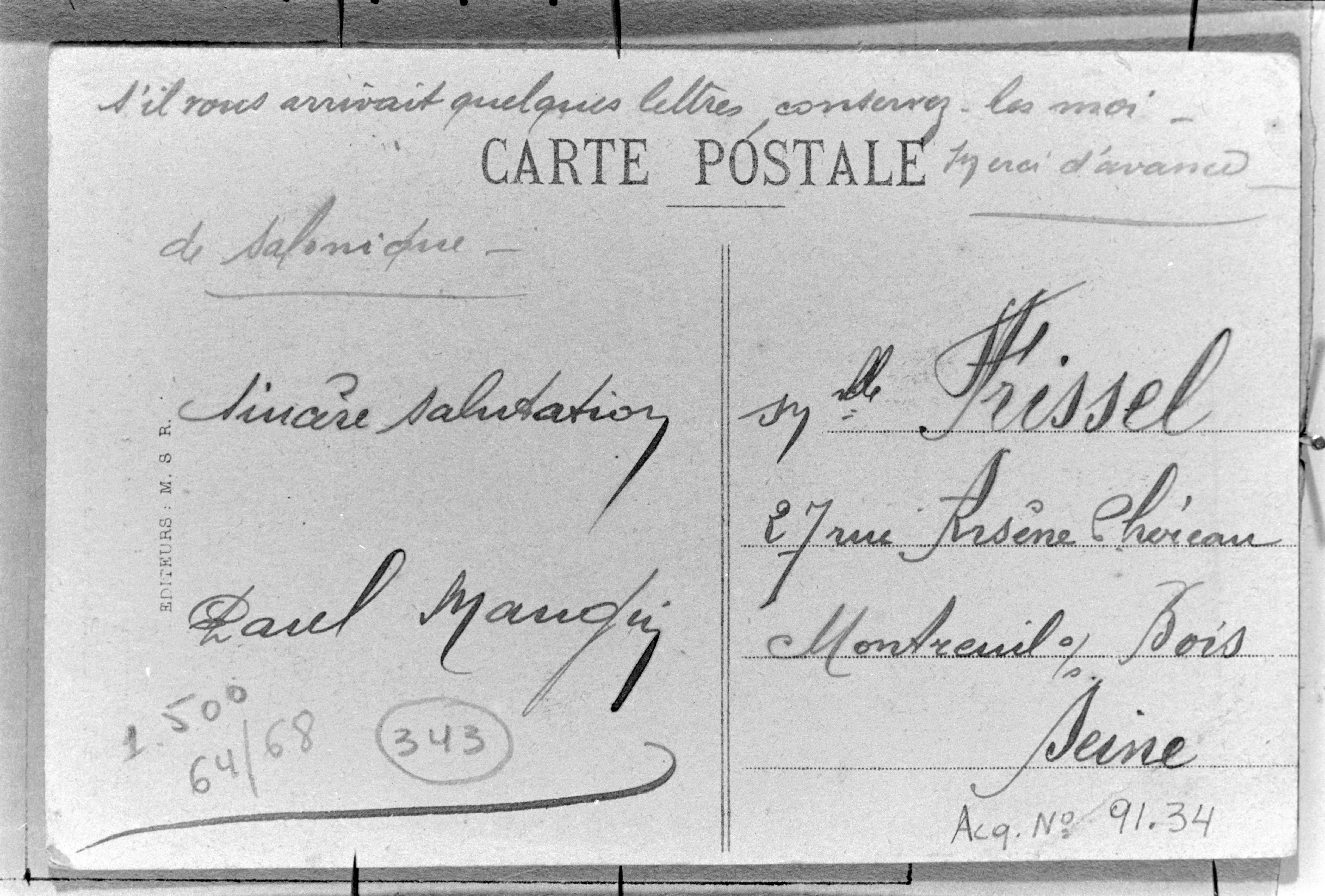 Photograph of a postcard depicting a street in Thessaloniki (backside)