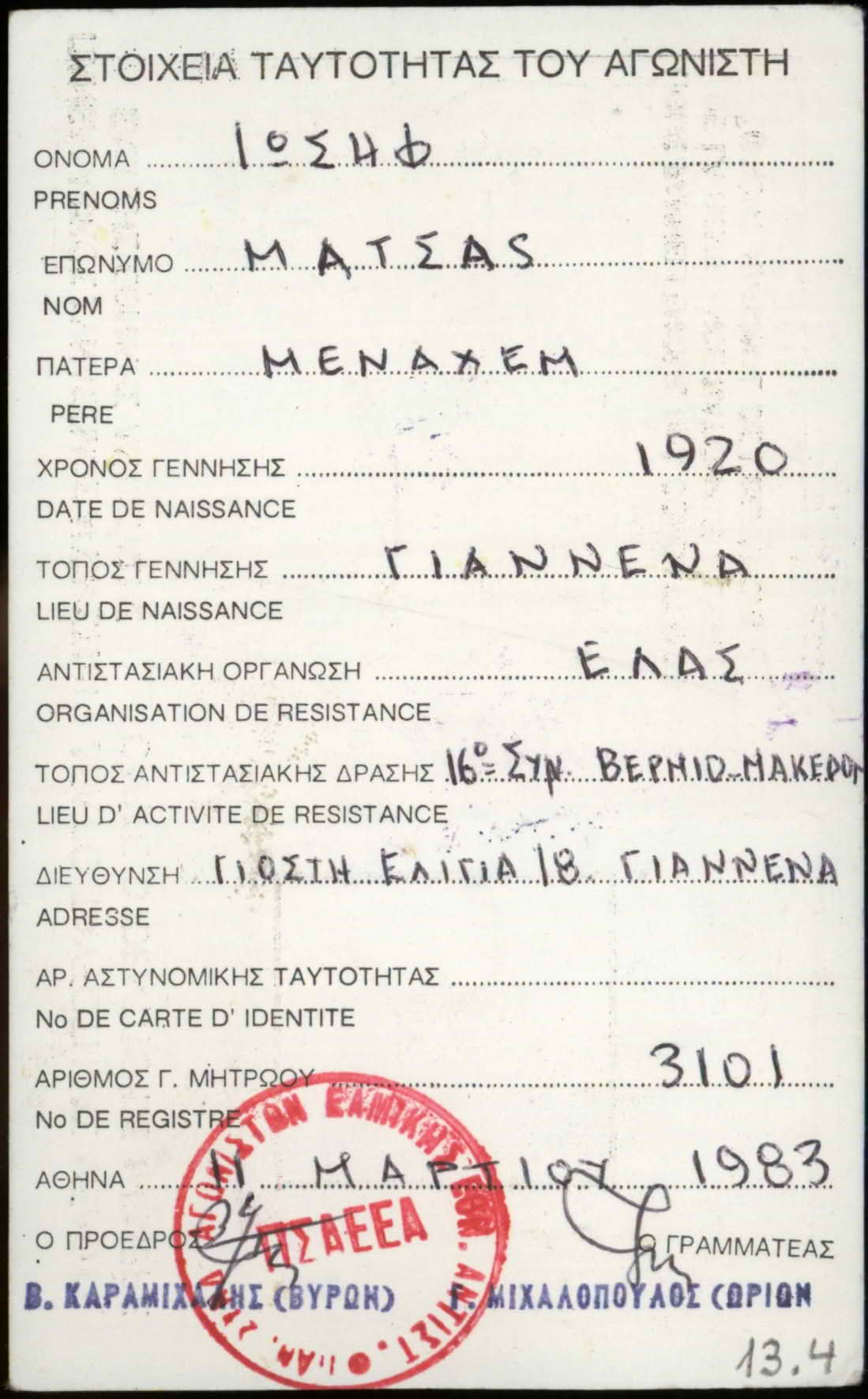 Identity card, issued by the Greek League of Resistance Fighters (1941-44) to Joseph Menahem Matsas, member of the Greek People's Liberation Army.