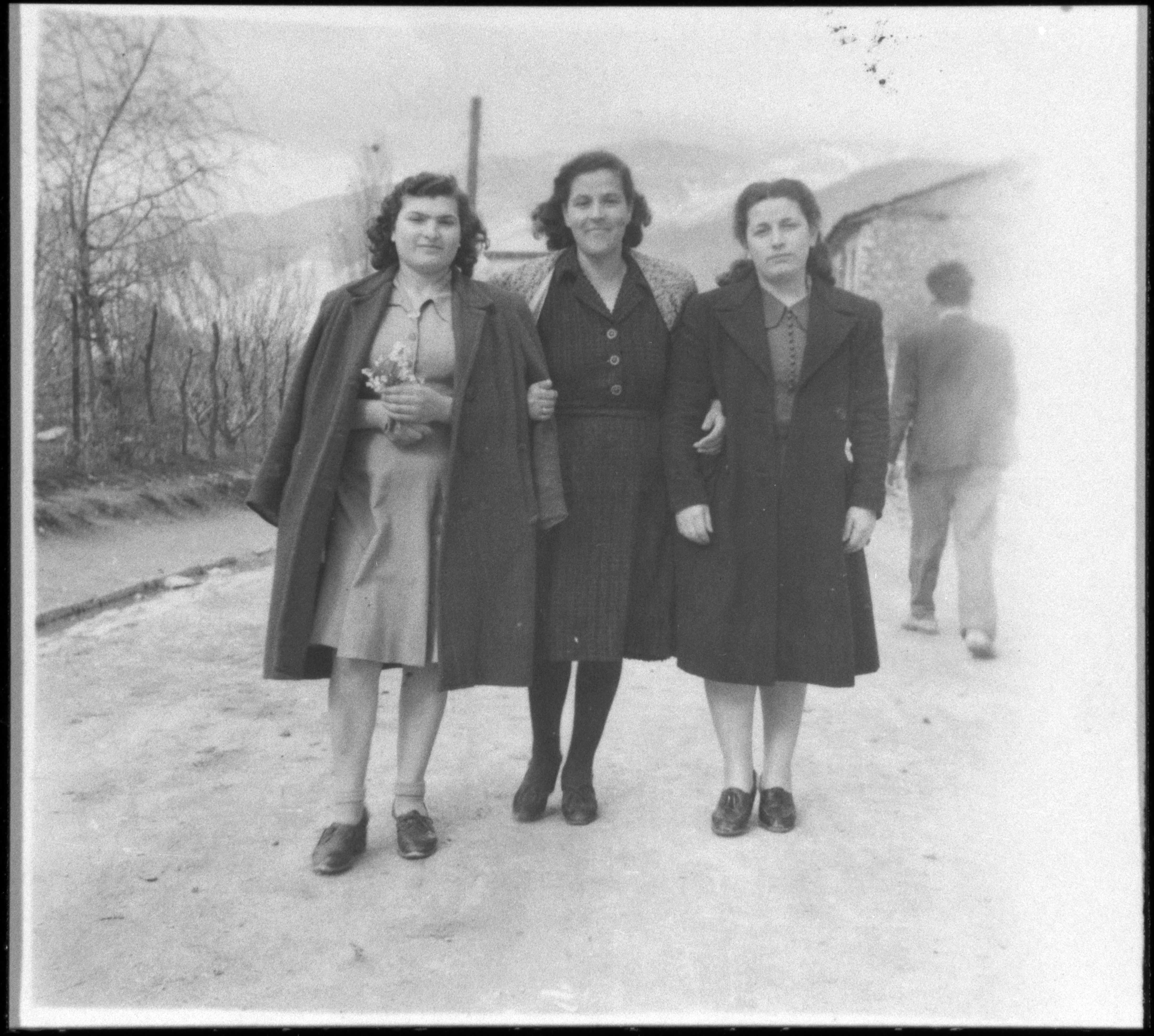 Three Jewish women from Ioannina on a street in Ioannina. From left: Esther Giosekou, Nina Battinou, Rachel…? (donated by Joseph Battinou)