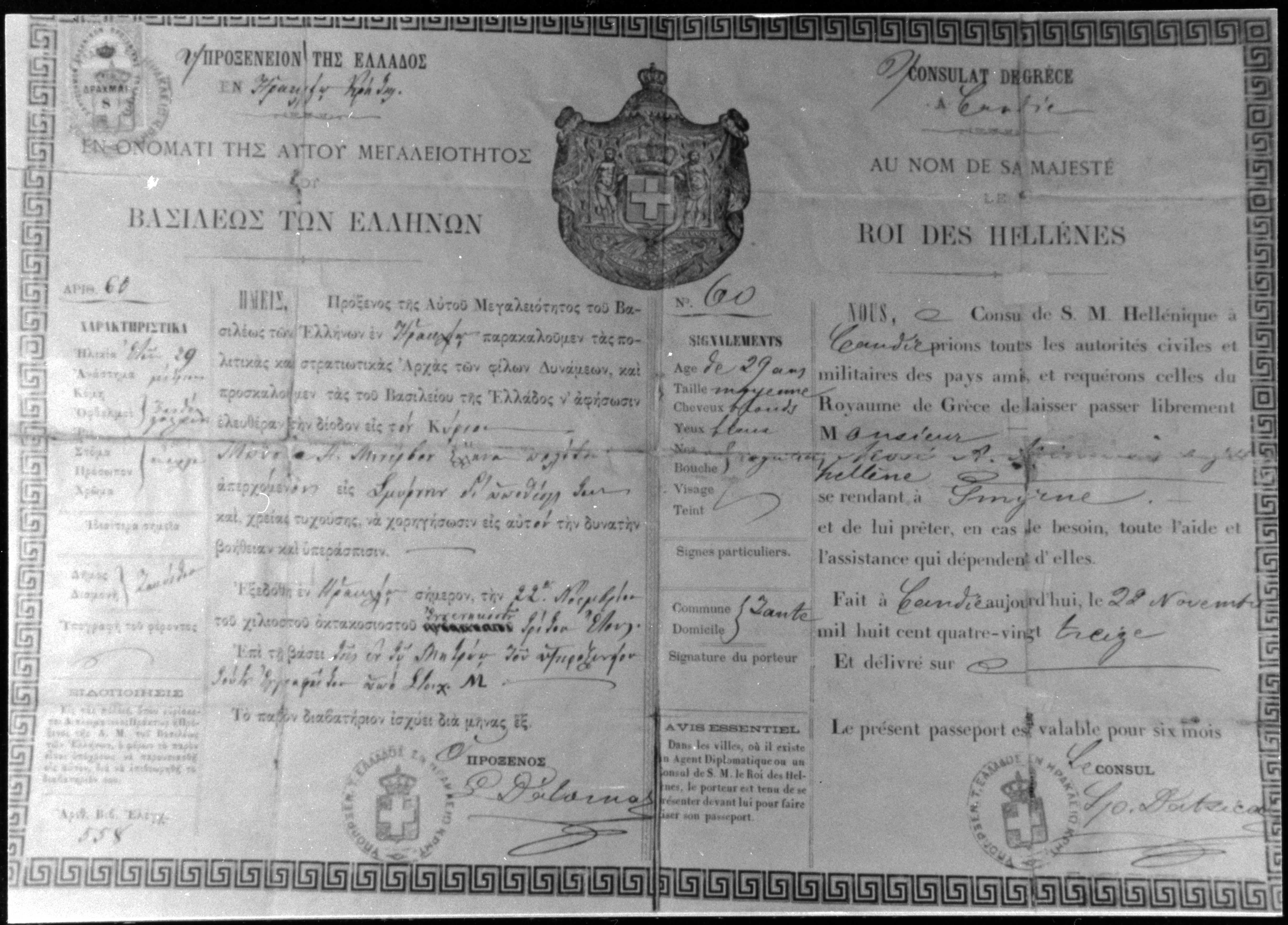 Greek consular permit from Crete and passage to Smyrna of Moses Mindervos, 22/11/1893 (detailed identification…) (donation of Lillian Capon)