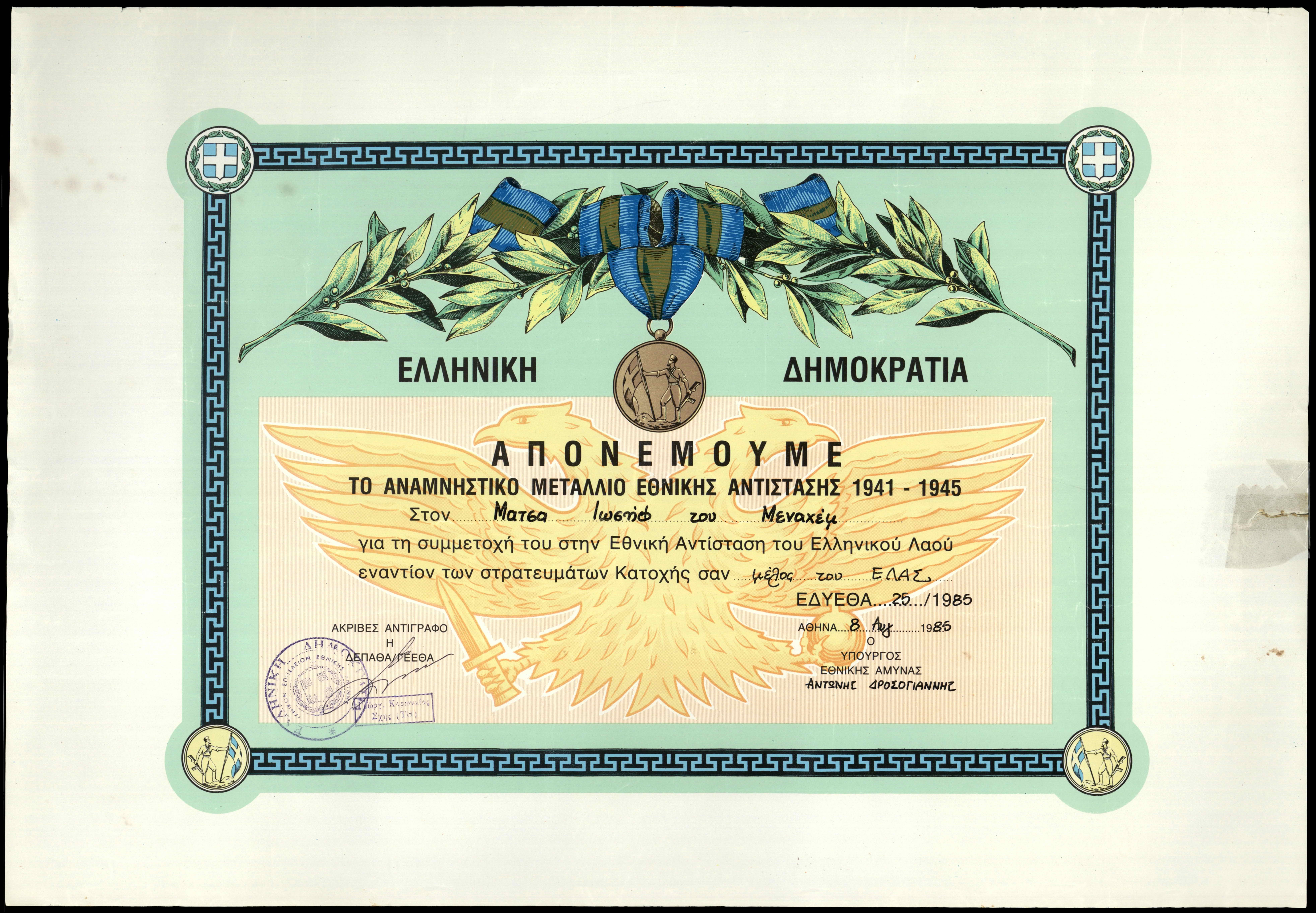 | dc.description | Certificate issued by the Greek Democracy to Joseph Menahem Matsas for his contribution to the Greek National Resistance. | |