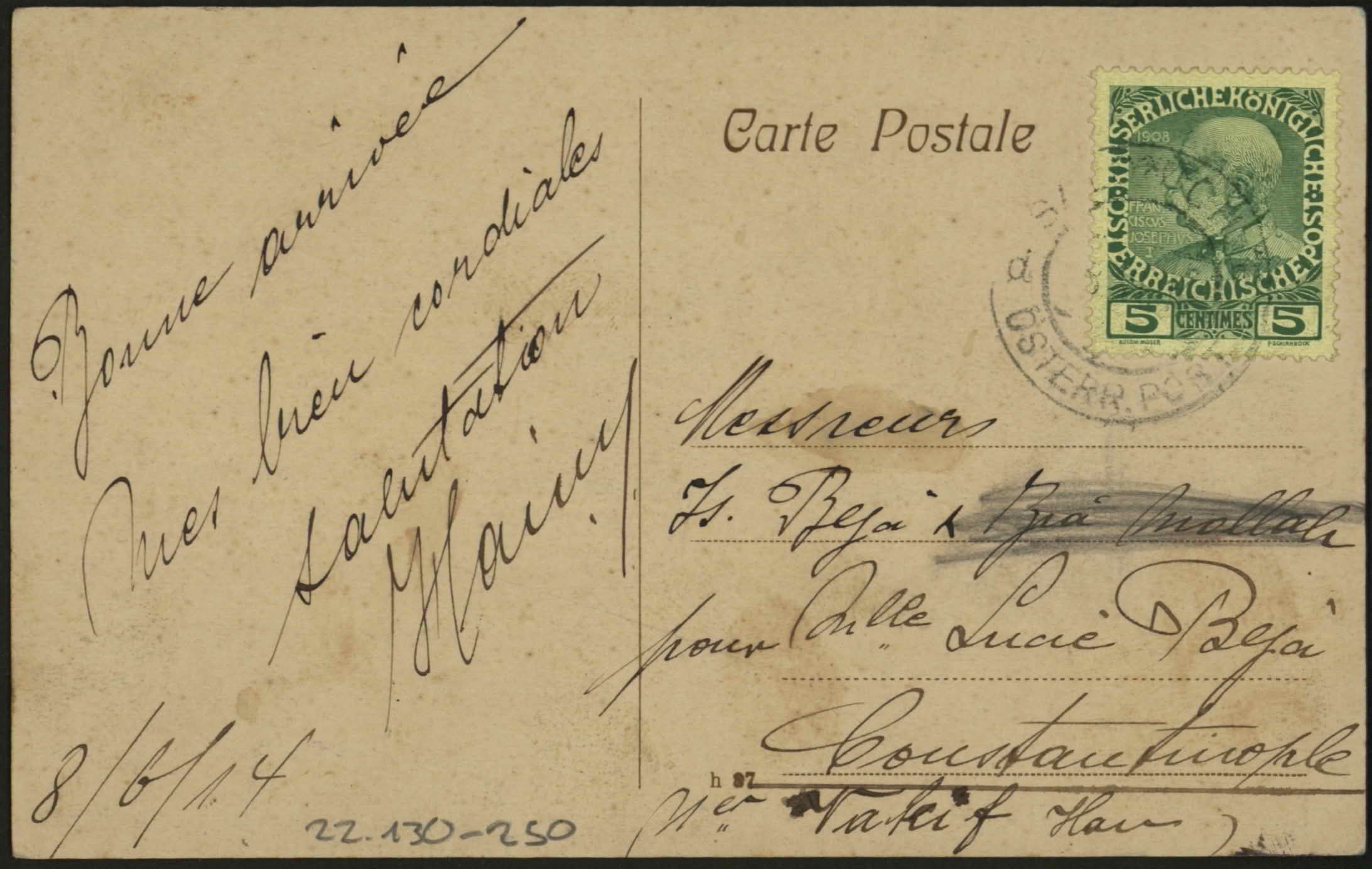 From Madeleine Raland to Mademoiselle Lucie Beja, chez Monsieur I. M. Beja, Salonique, Turquie. "Chere Lucie, remerciements bien sinceres pour la depeche qui nous a beaucoup touches. Nous faisons un delicieux voyage de noces dans le midi de la France ou le pays est tres jolie & visiterons ensuite la … Mon mari se joint a moi pour vous envoyer ainsi qu'a vos parents notre meilleur souvenir avec quelques bons baisers d'une bien sincere. Madeleine Raland".