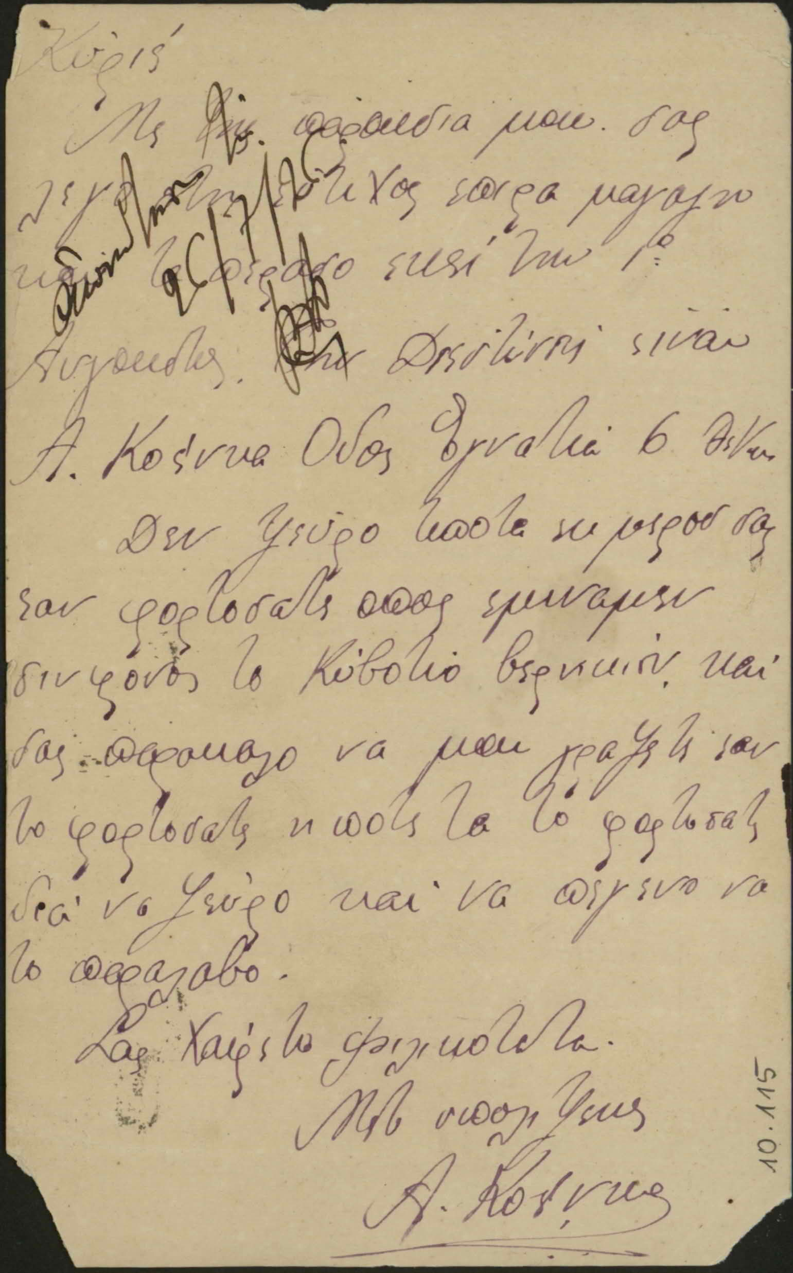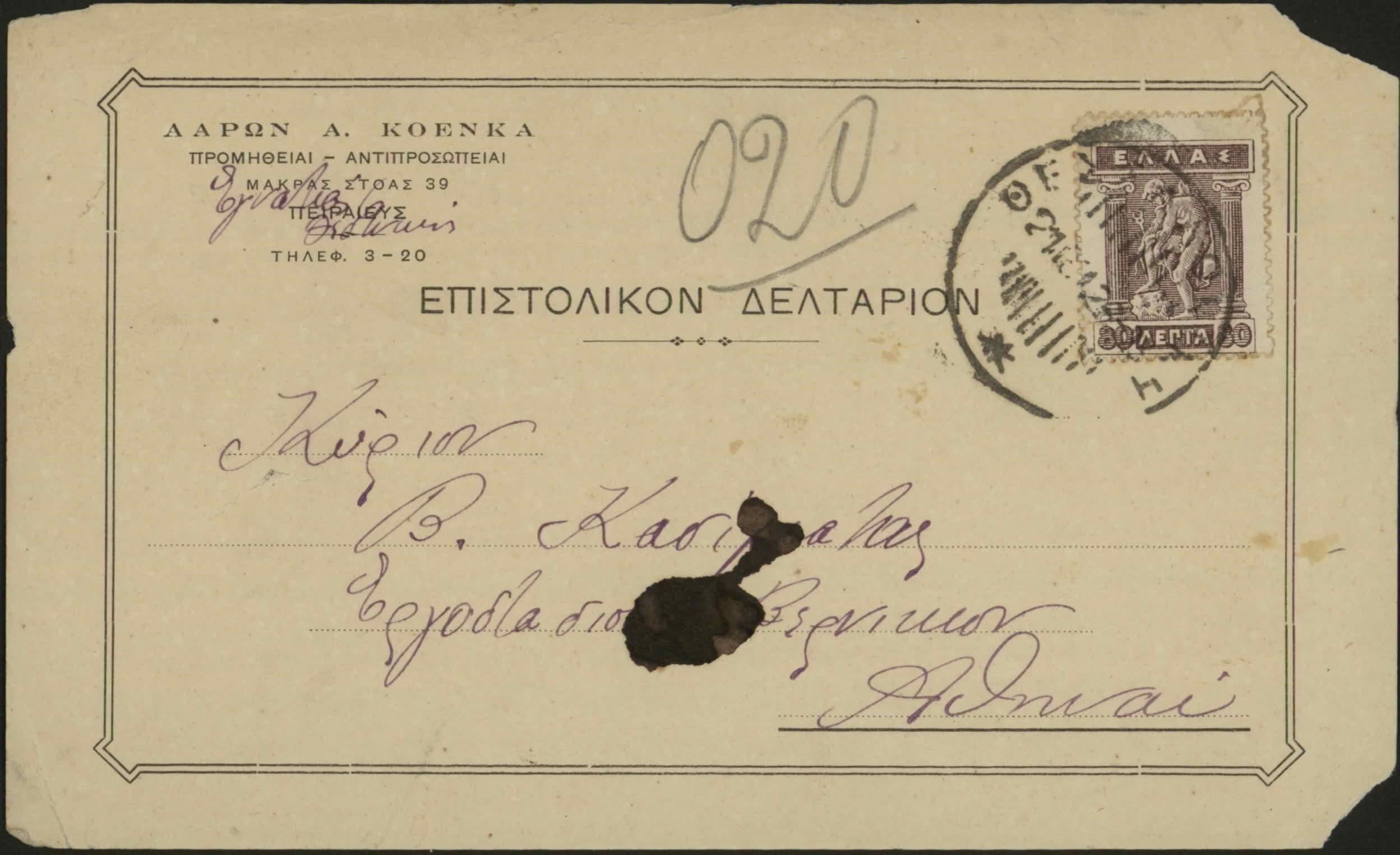 Postcard sent by Aaron A. Koenka, in Salonica, to B. Kasimatas, in Athens, on July 21st, 1926.