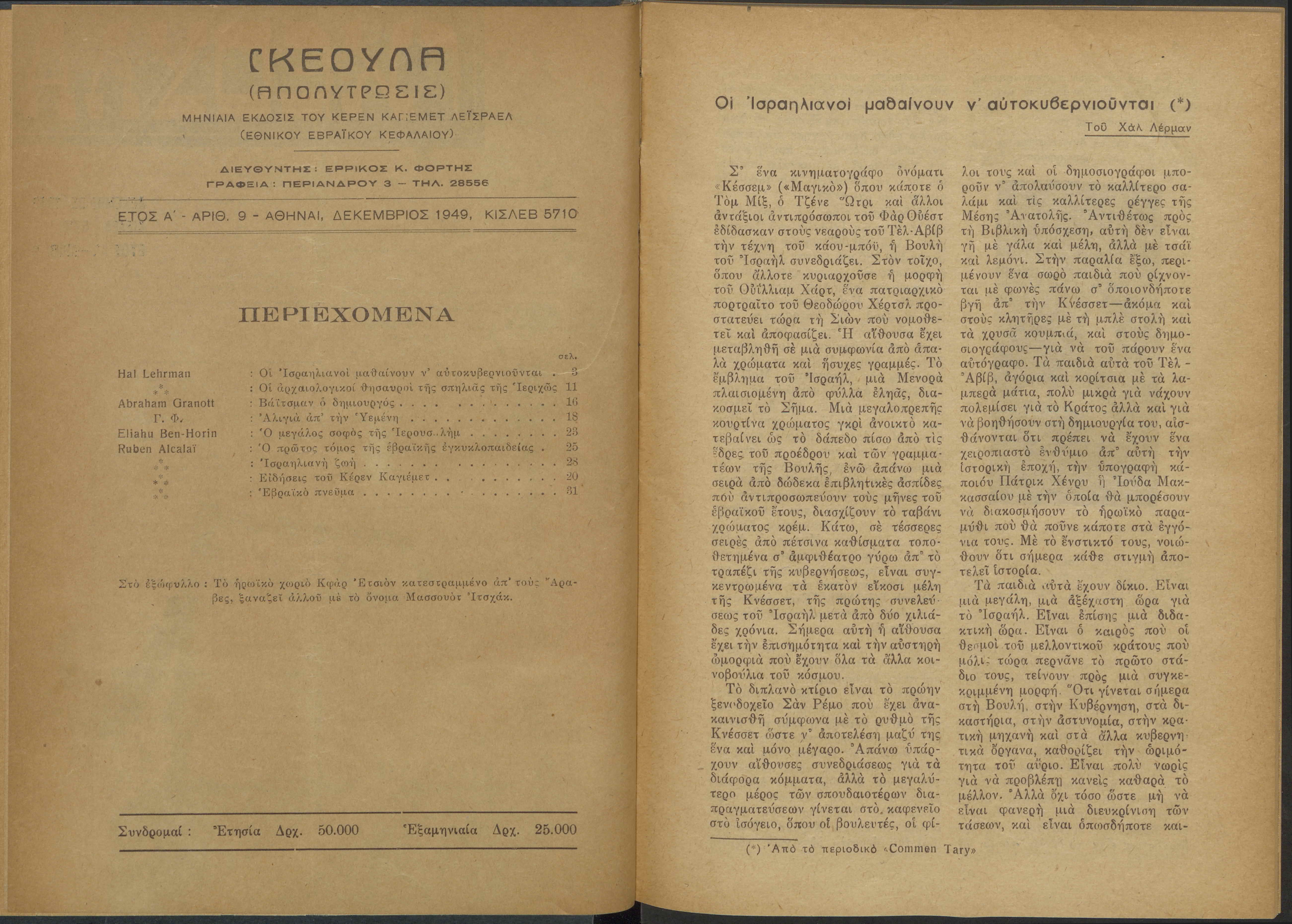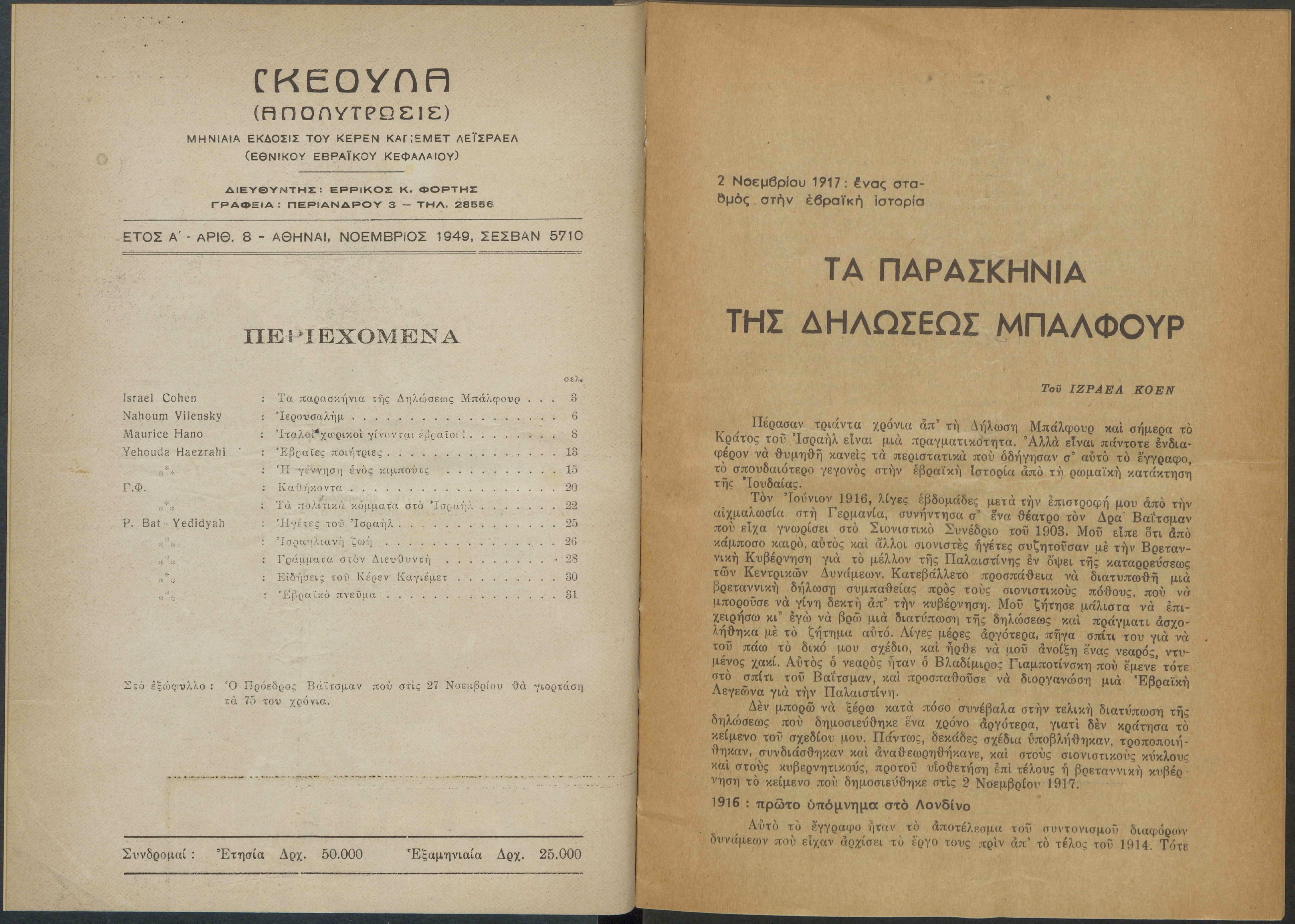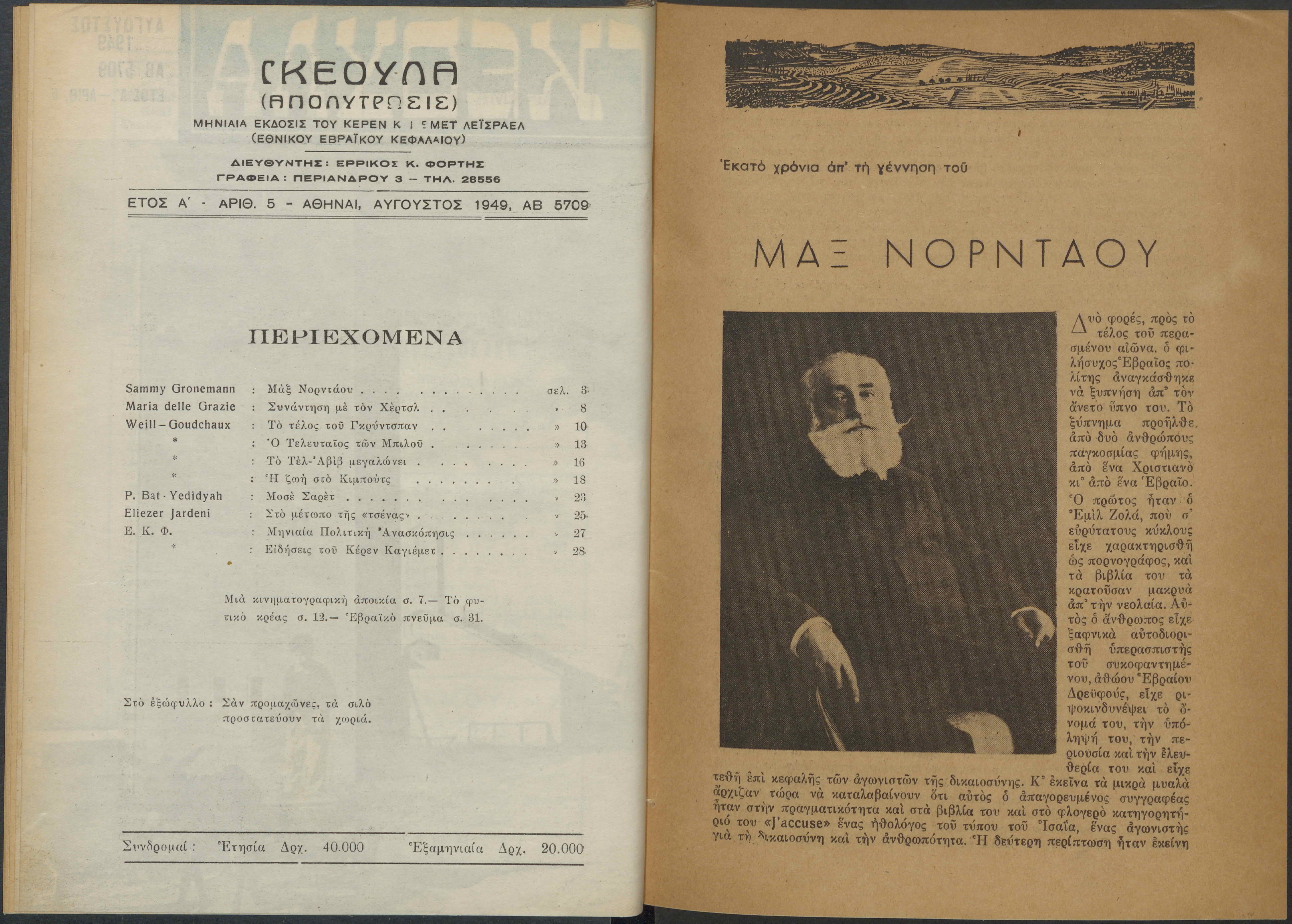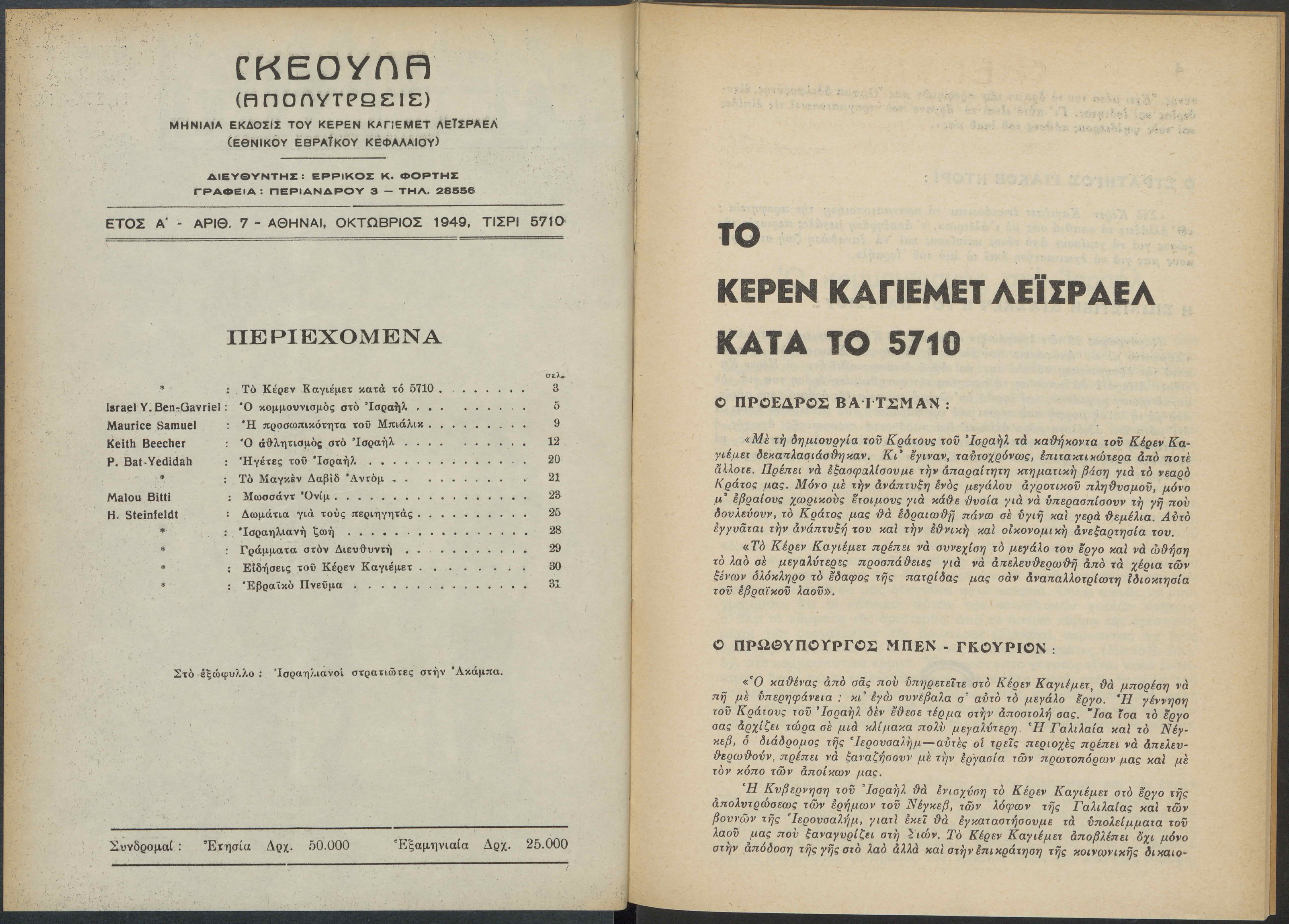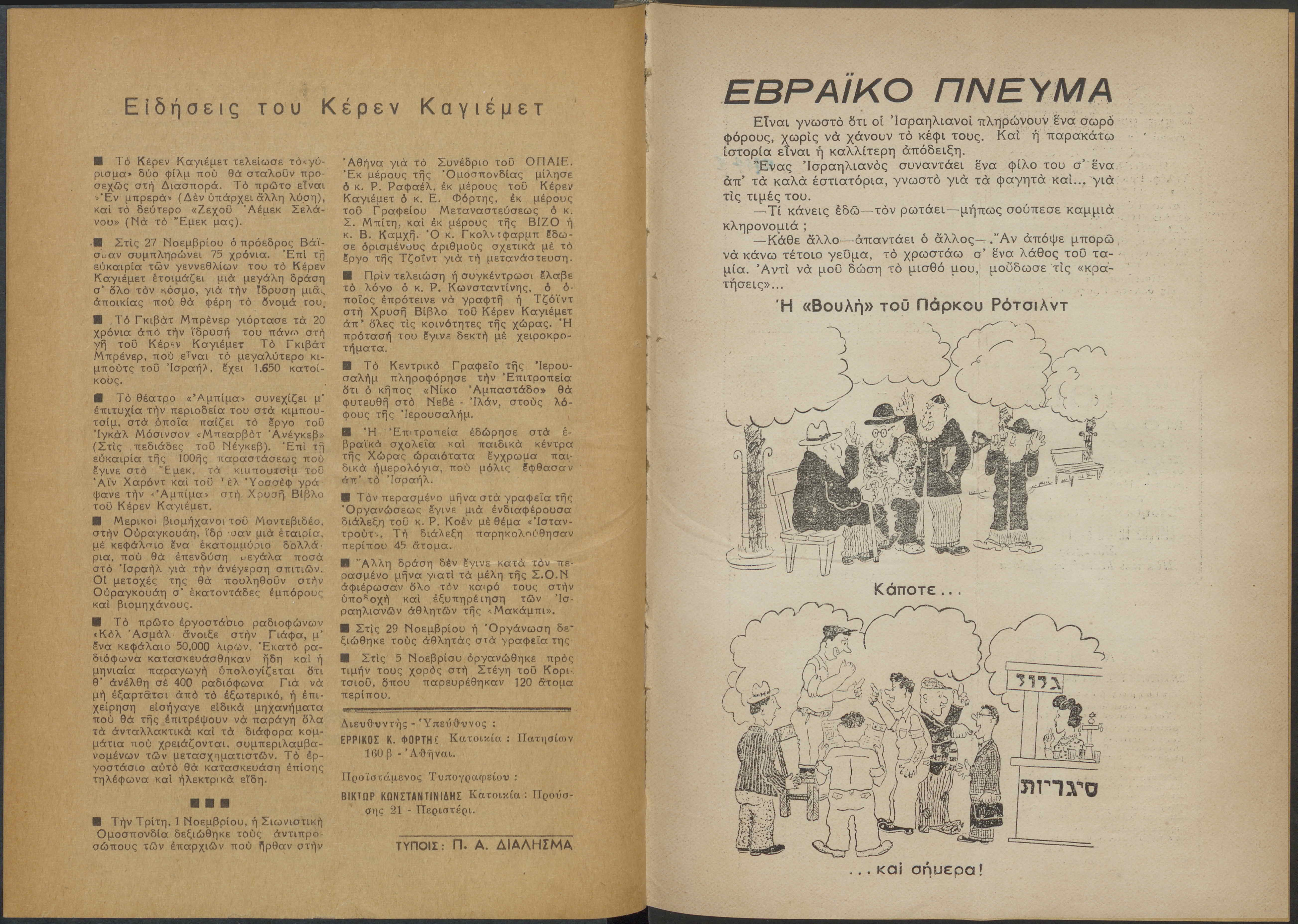 Monthly publication of Keren Kayemeth LeIsrael (Jewish National Fund/Εθνικό Εβραϊκό Κεφάλαιο), 12 issues bound in book form, 116 pages.