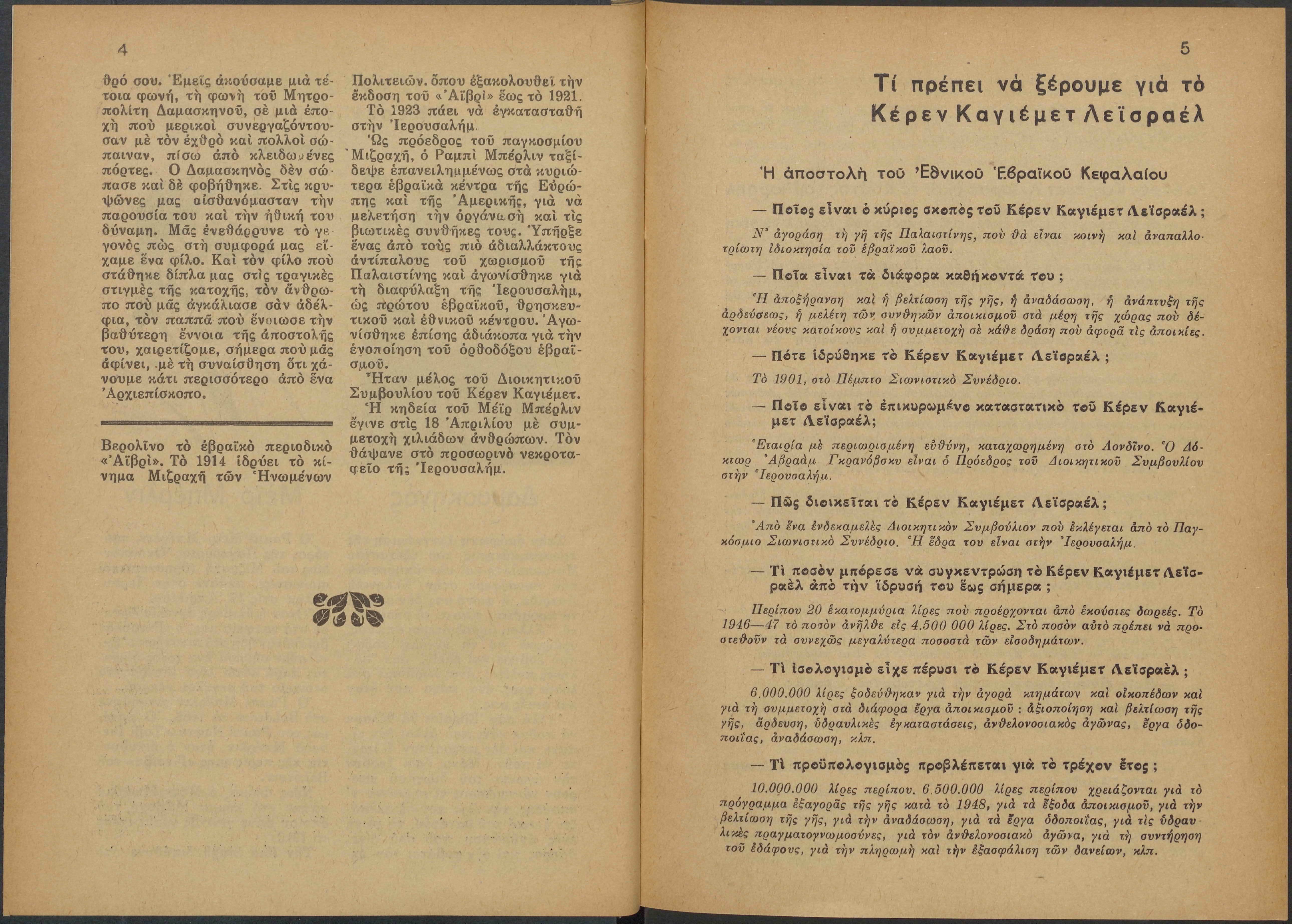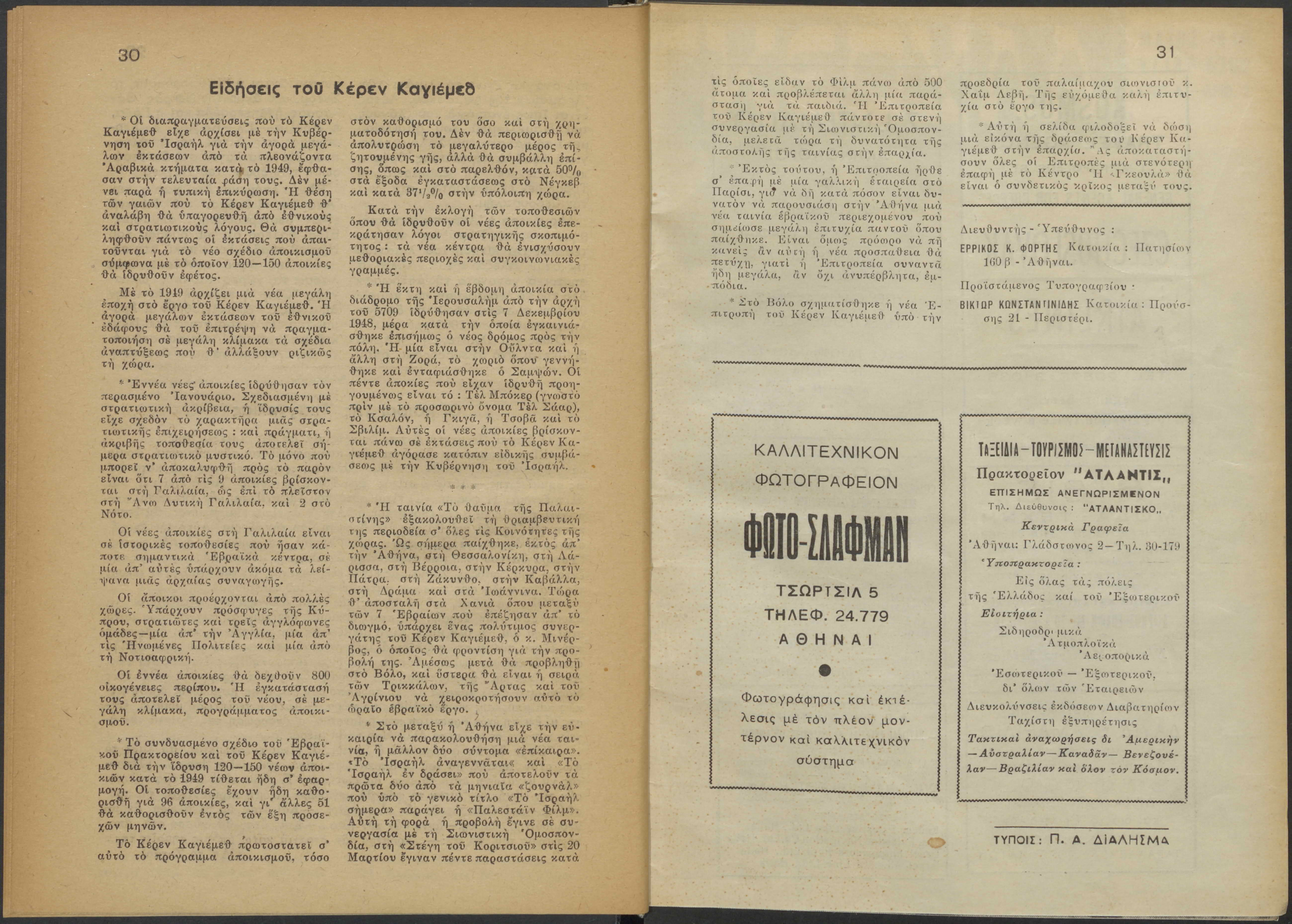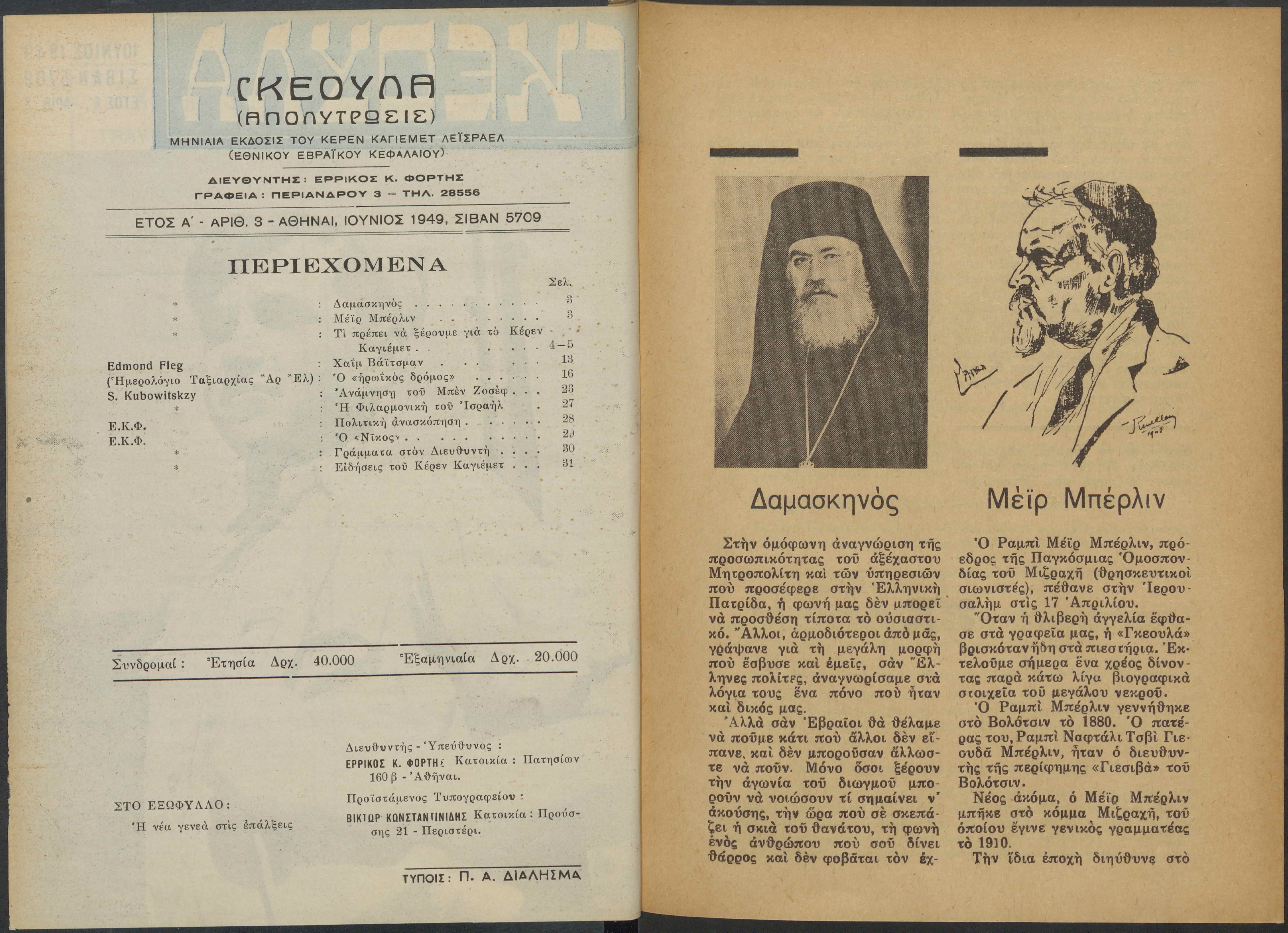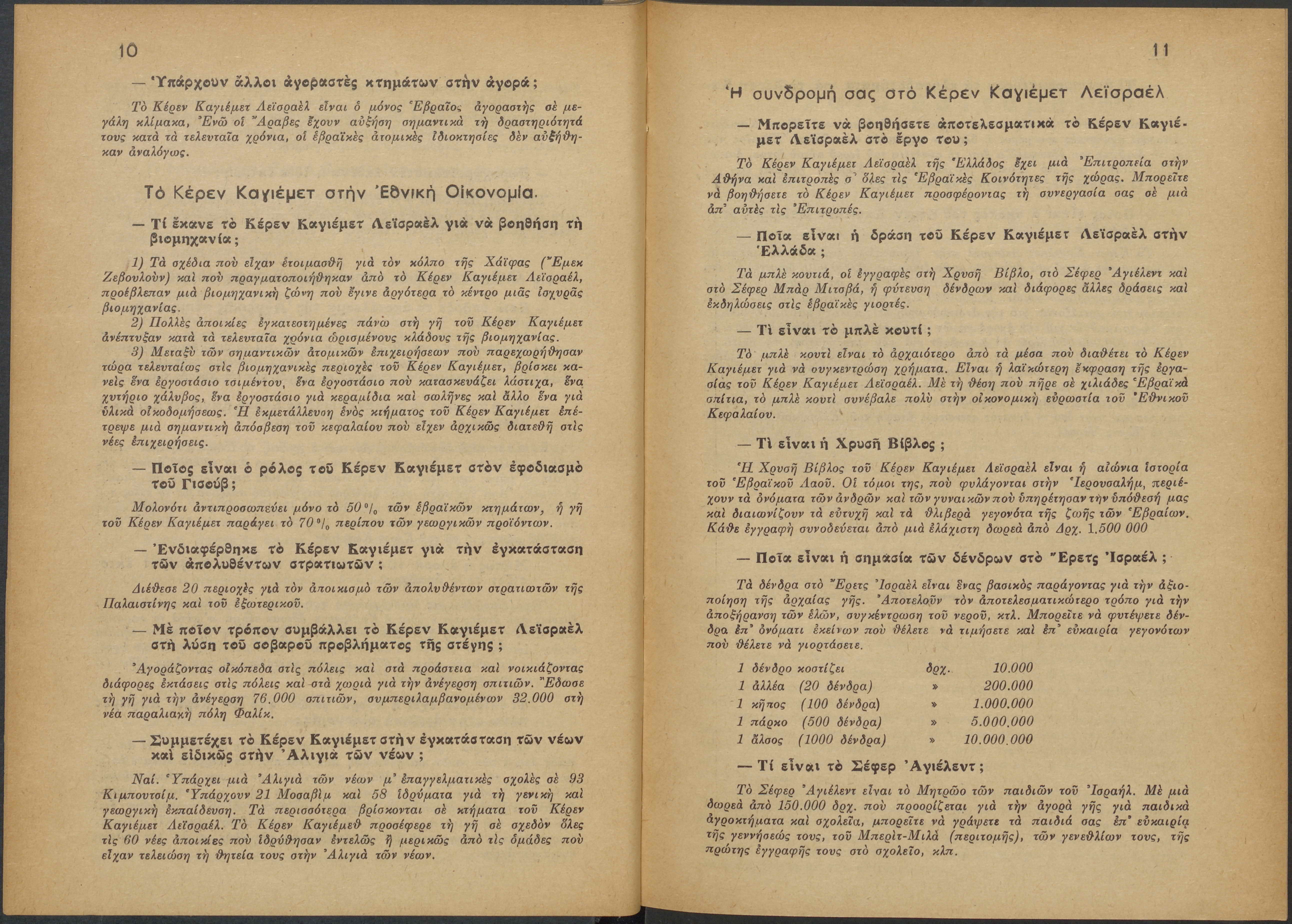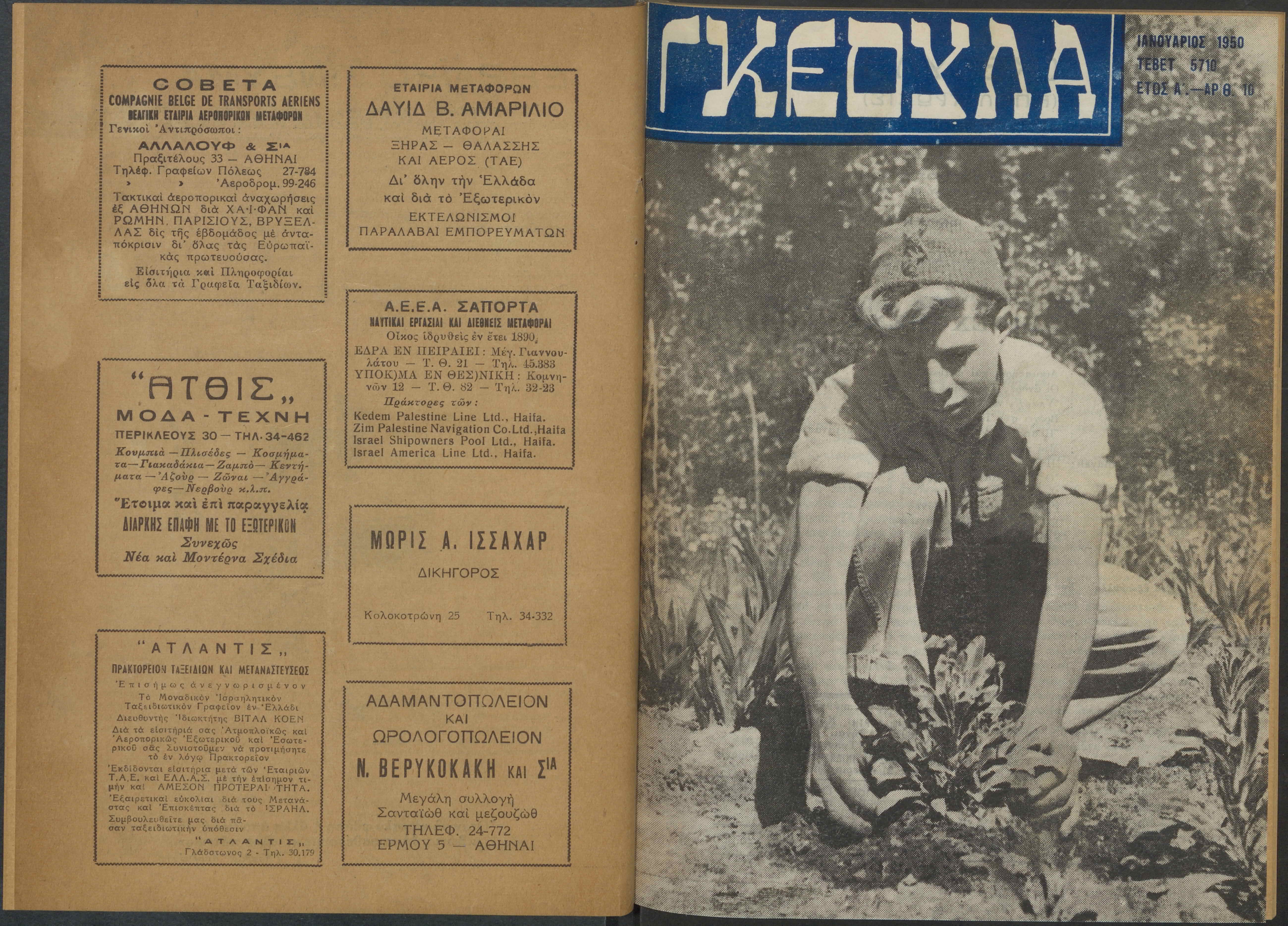 Monthly publication of Keren Kayemeth LeIsrael (Jewish National Fund/Εθνικό Εβραϊκό Κεφάλαιο), 12 issues bound in book form, 116 pages.