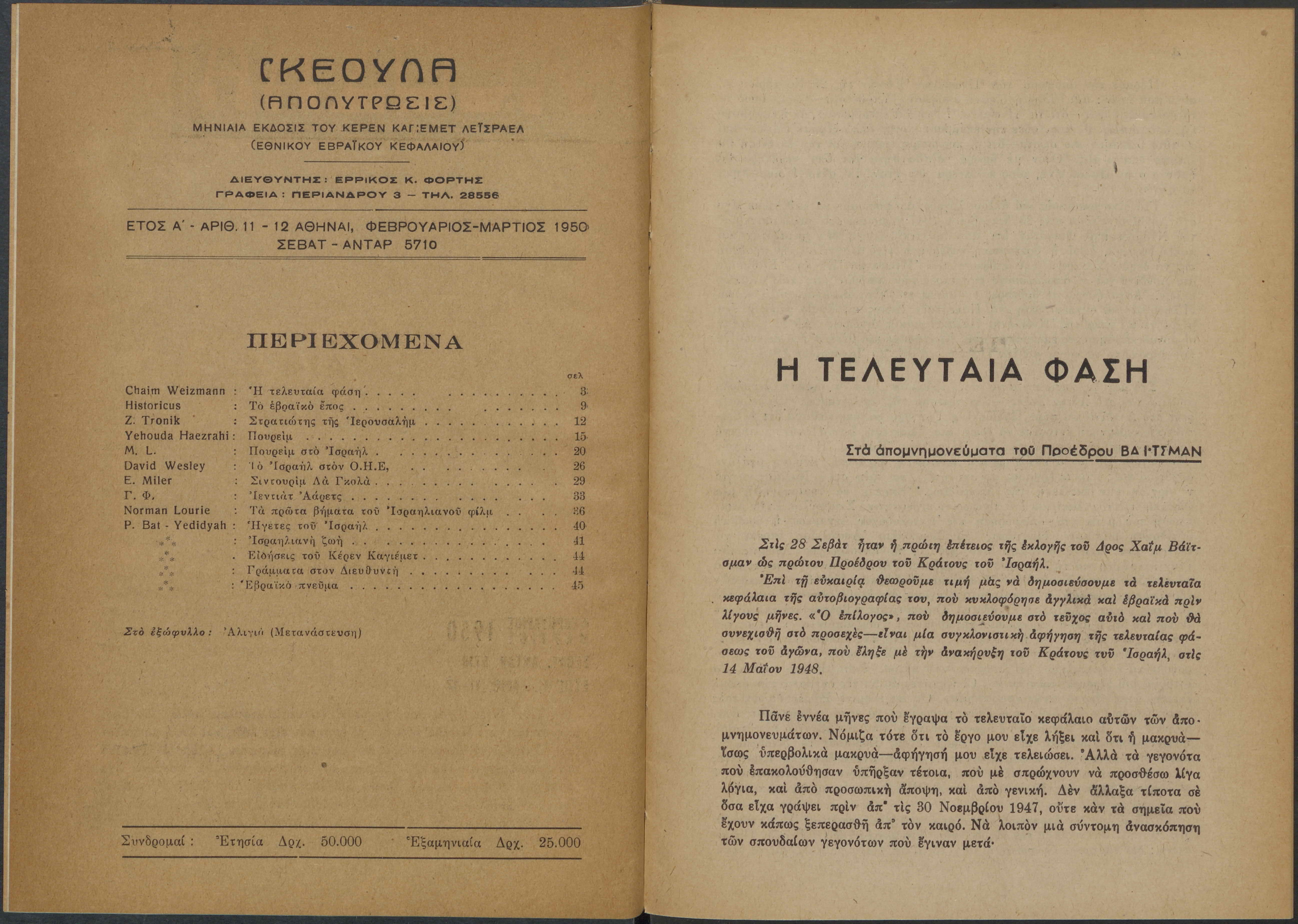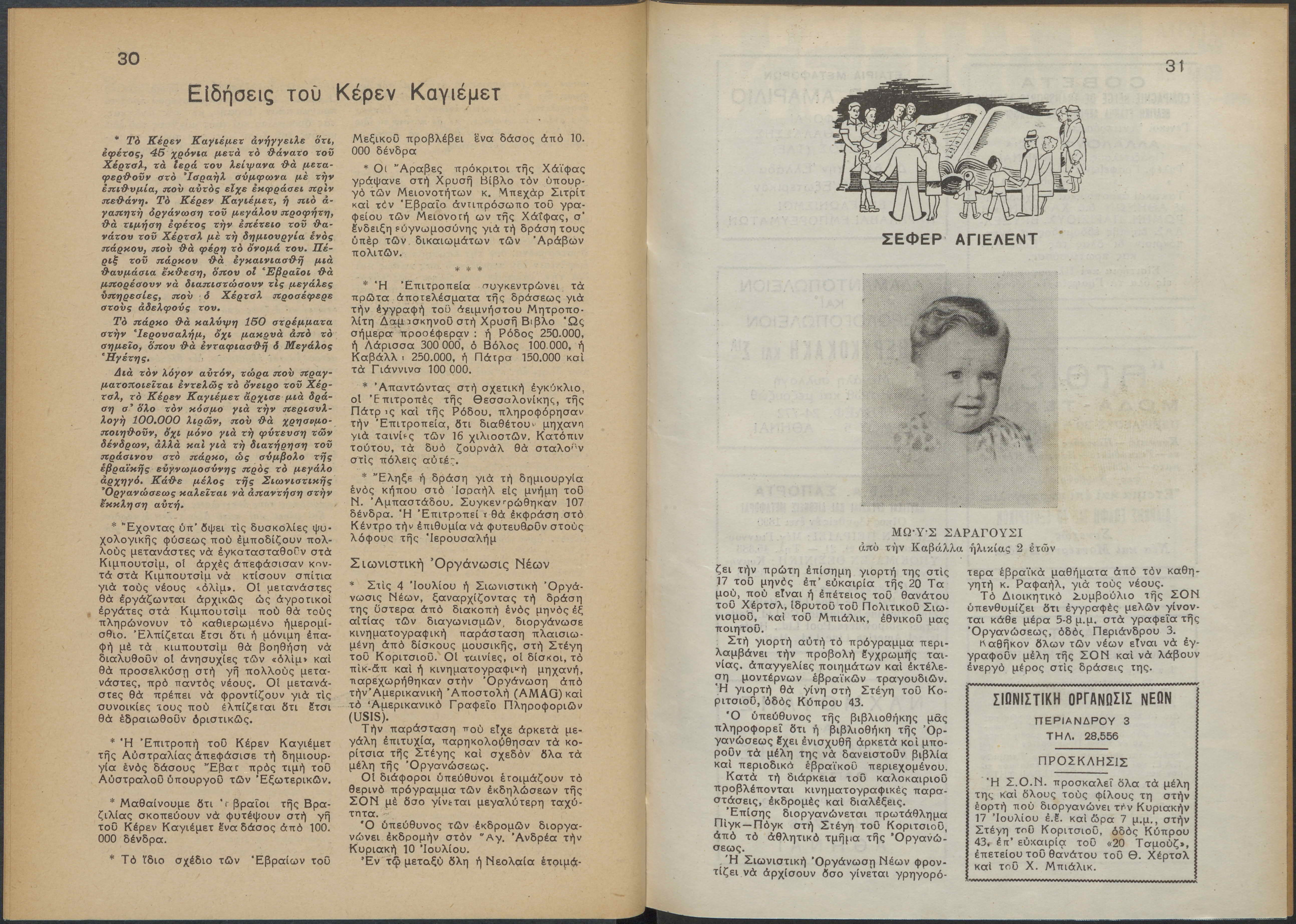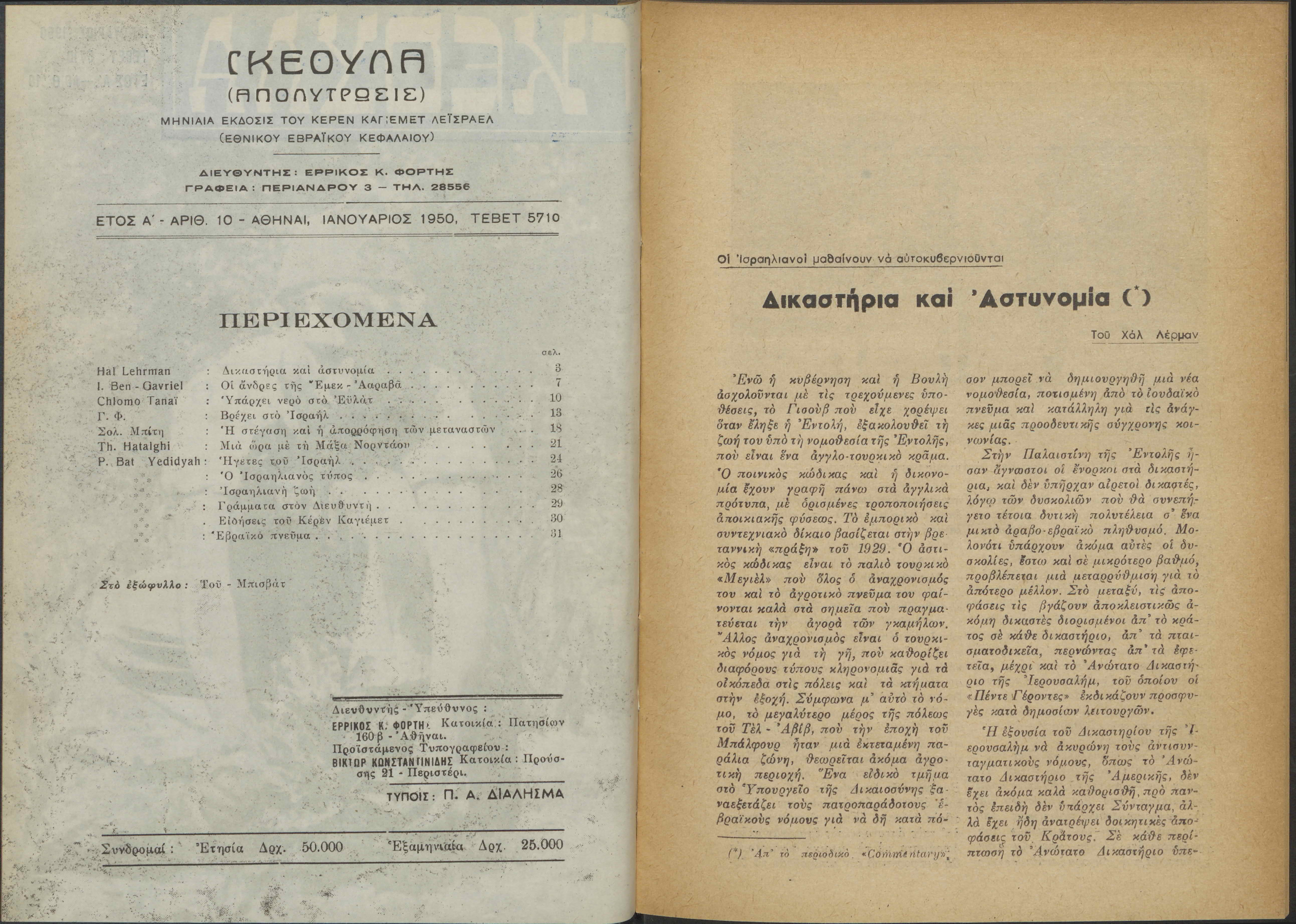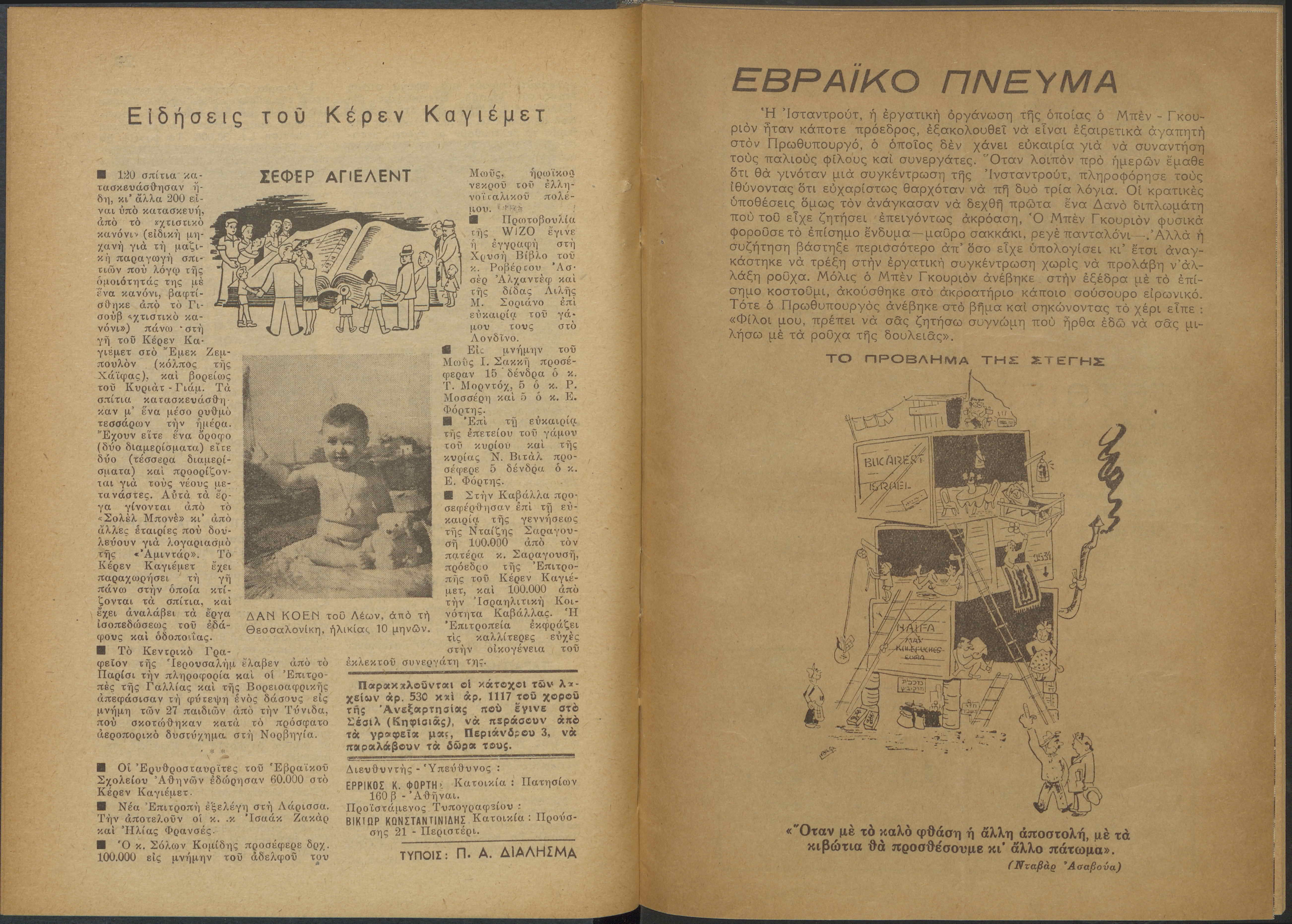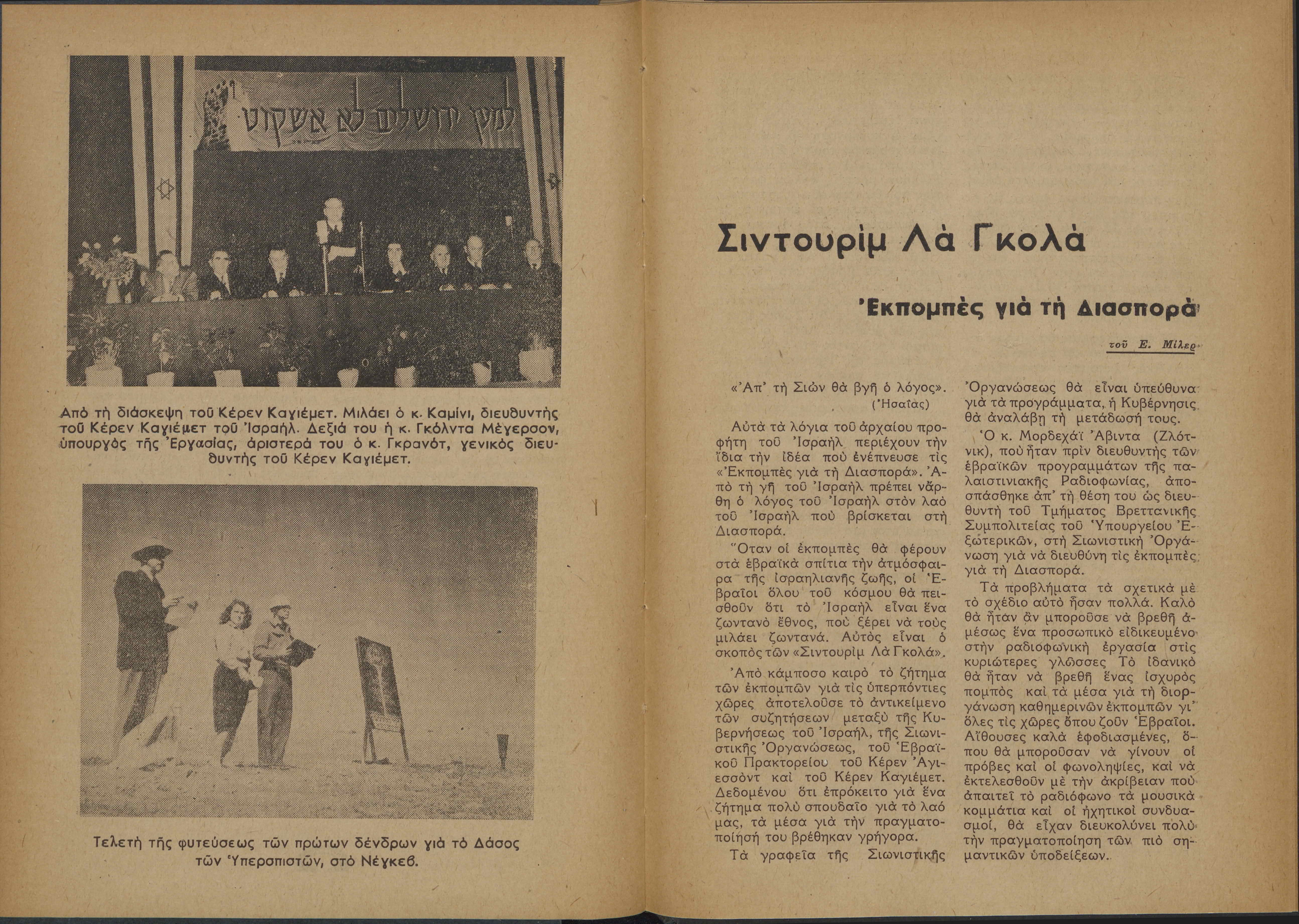 Monthly publication of Keren Kayemeth LeIsrael (Jewish National Fund/Εθνικό Εβραϊκό Κεφάλαιο), 12 issues bound in book form, 116 pages.