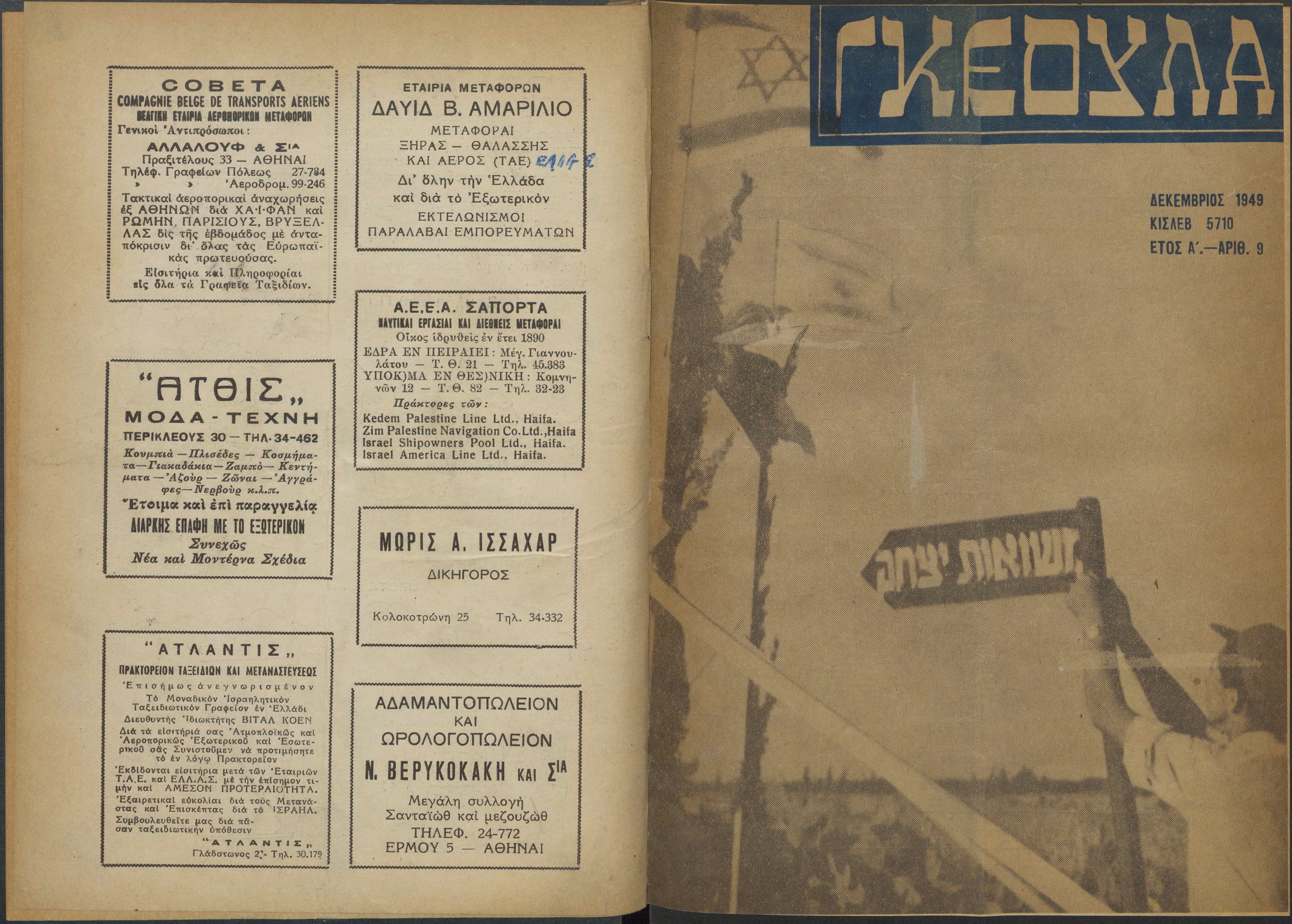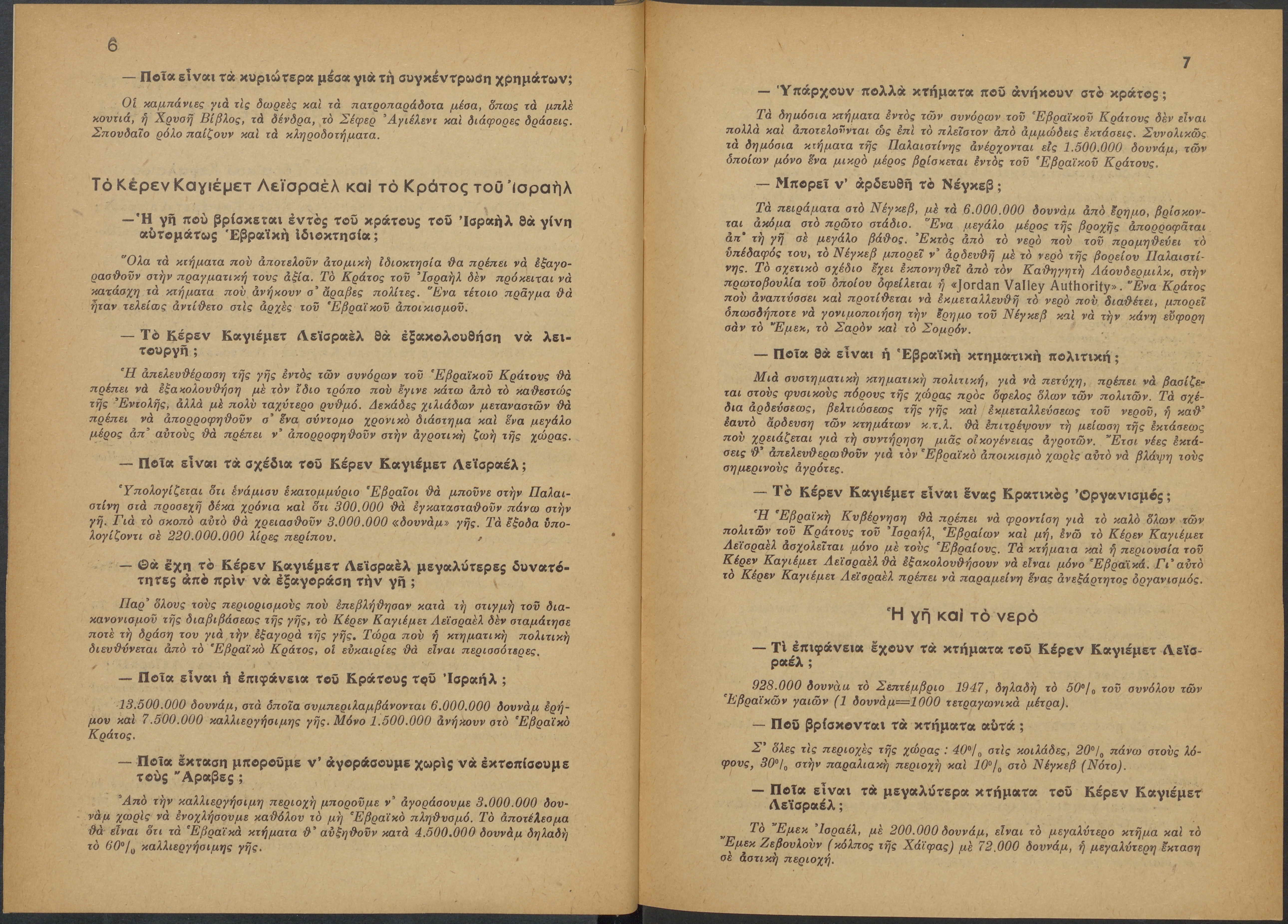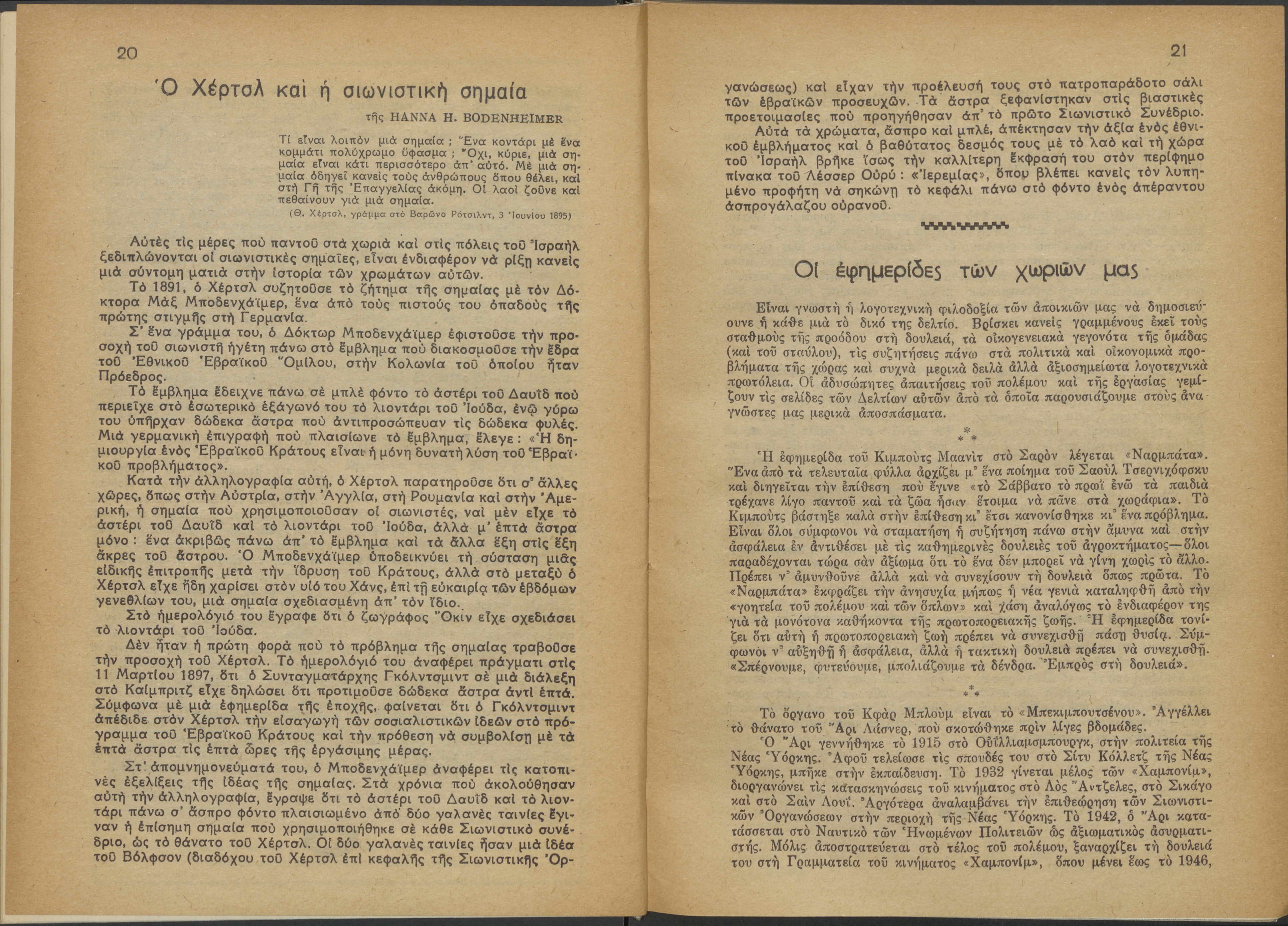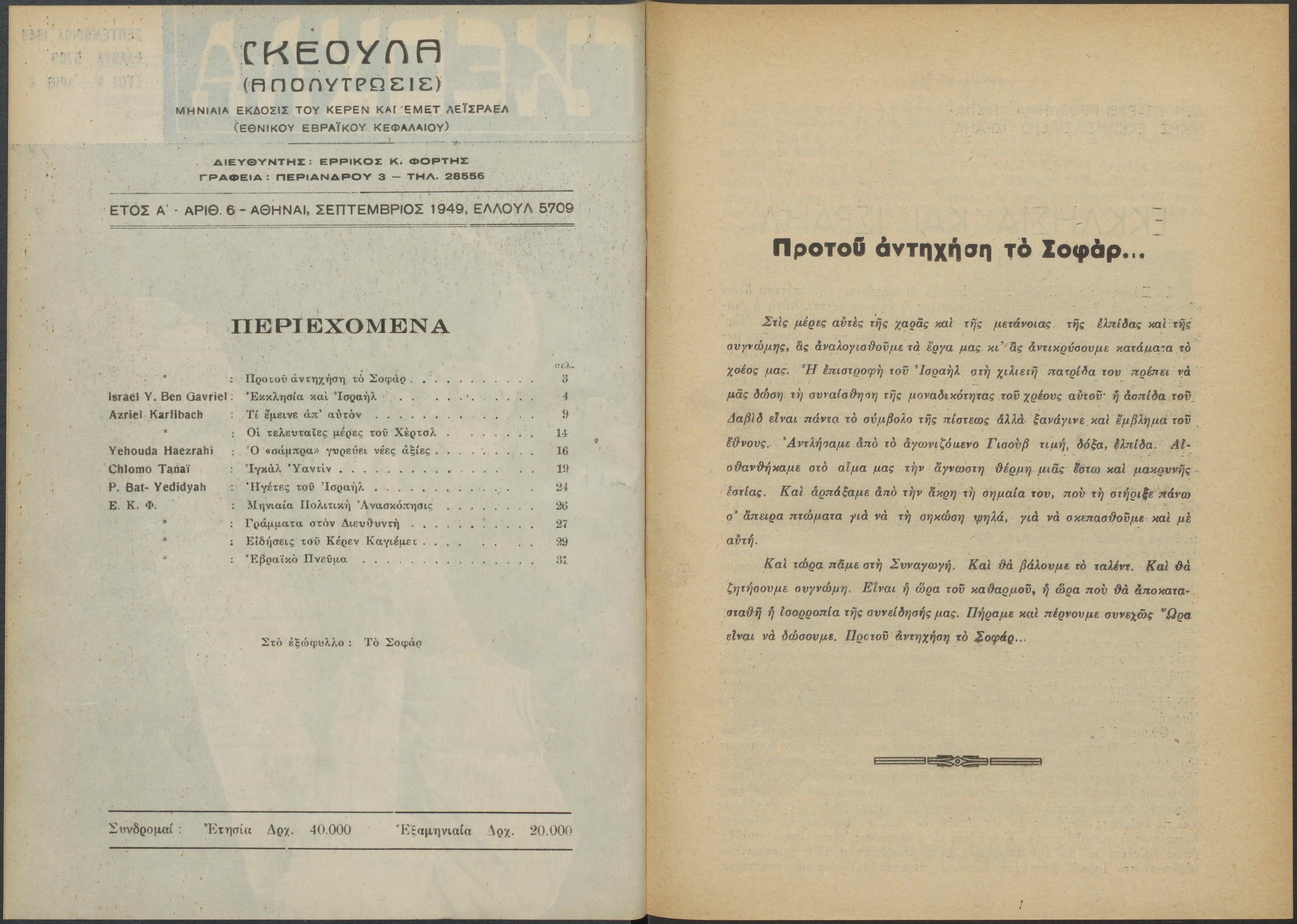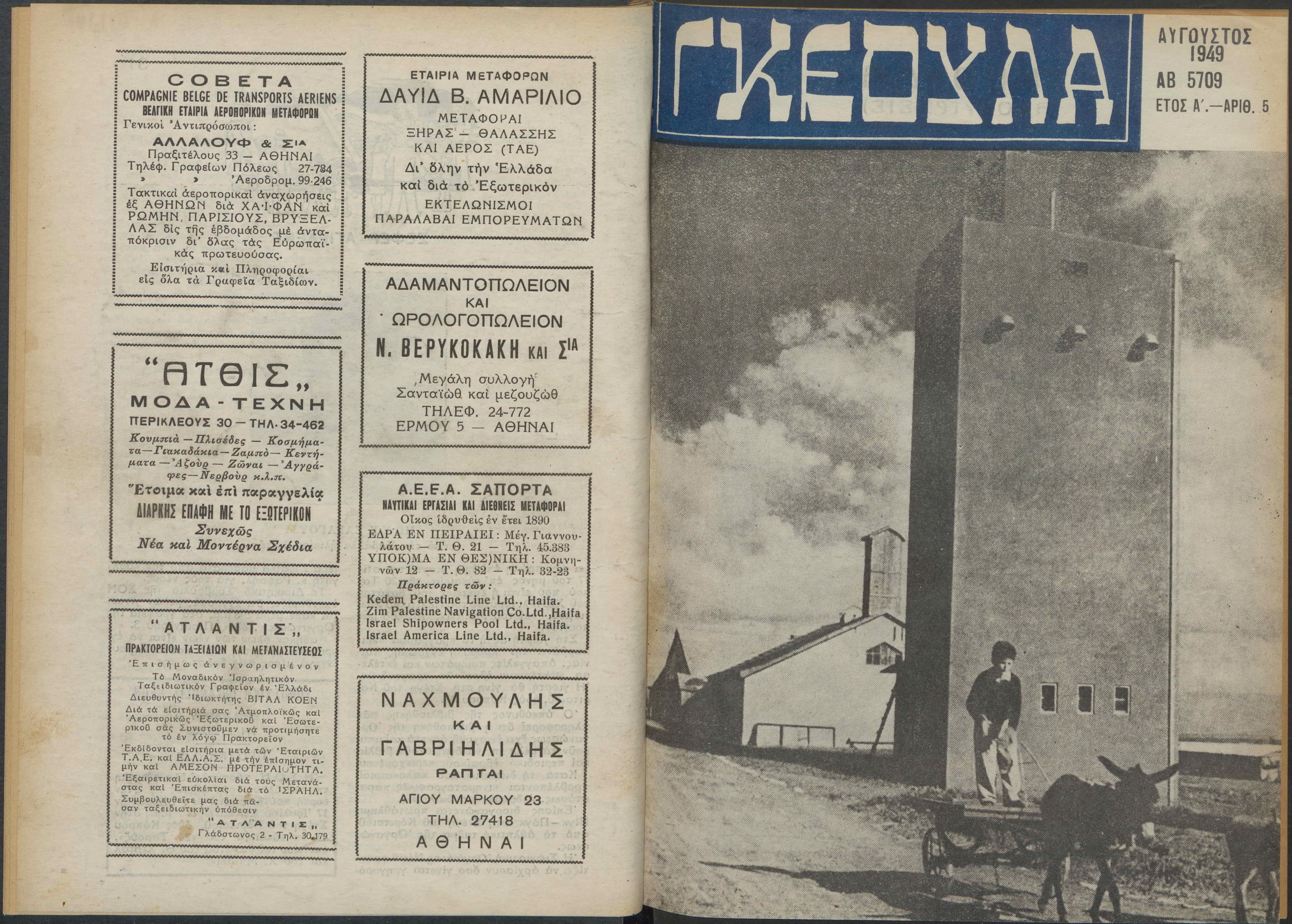 Monthly publication of Keren Kayemeth LeIsrael (Jewish National Fund/Εθνικό Εβραϊκό Κεφάλαιο), 12 issues bound in book form, 116 pages.