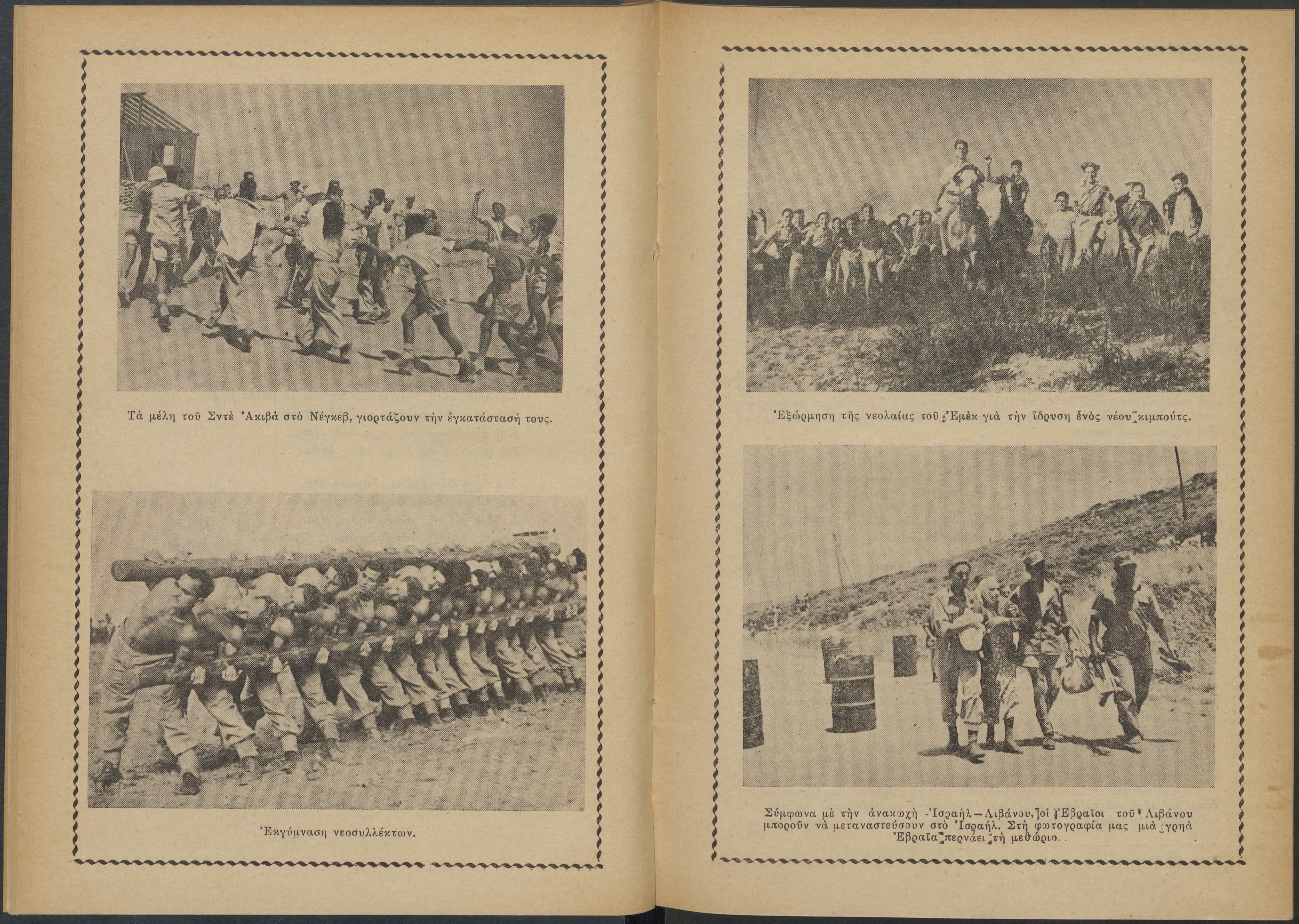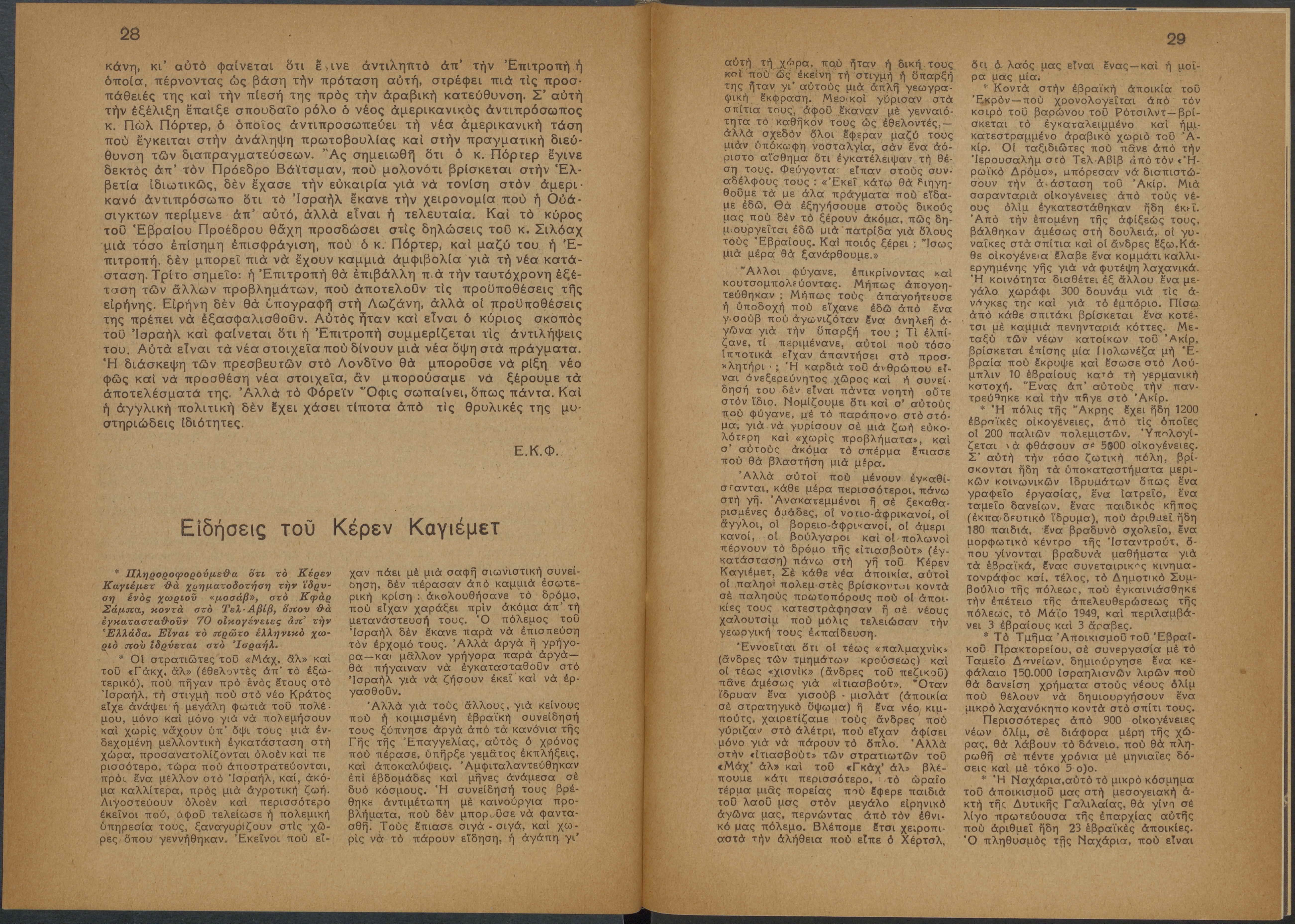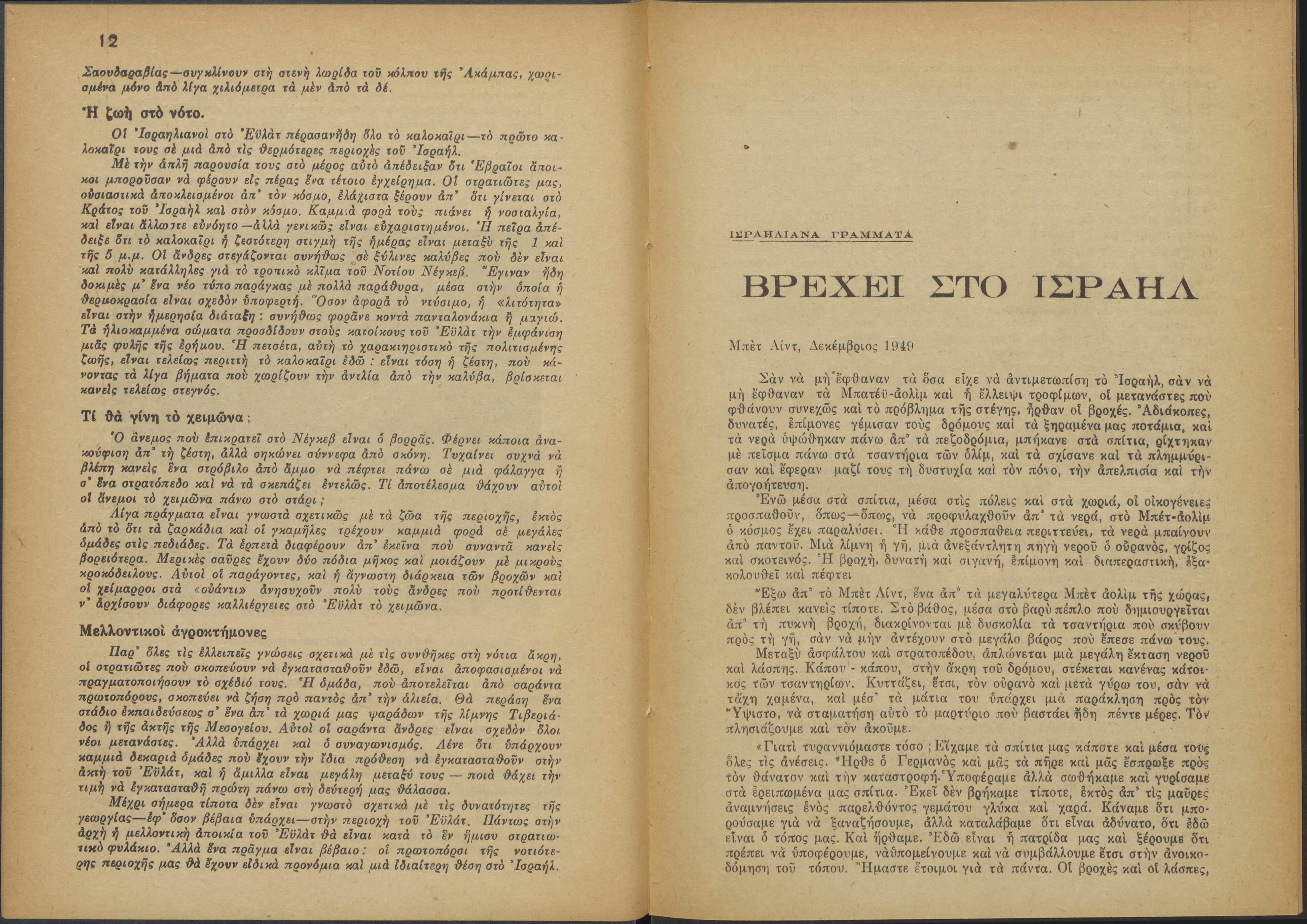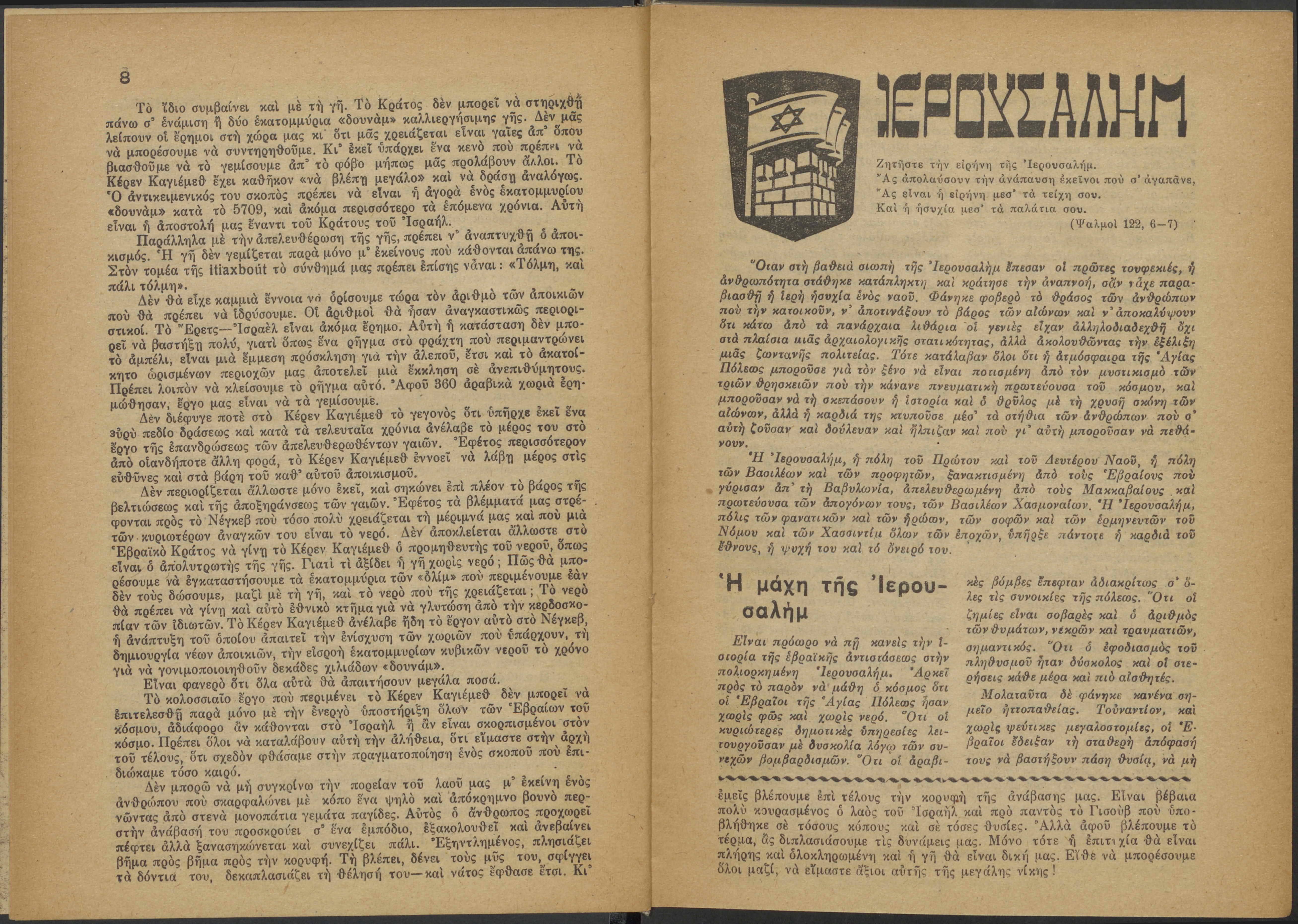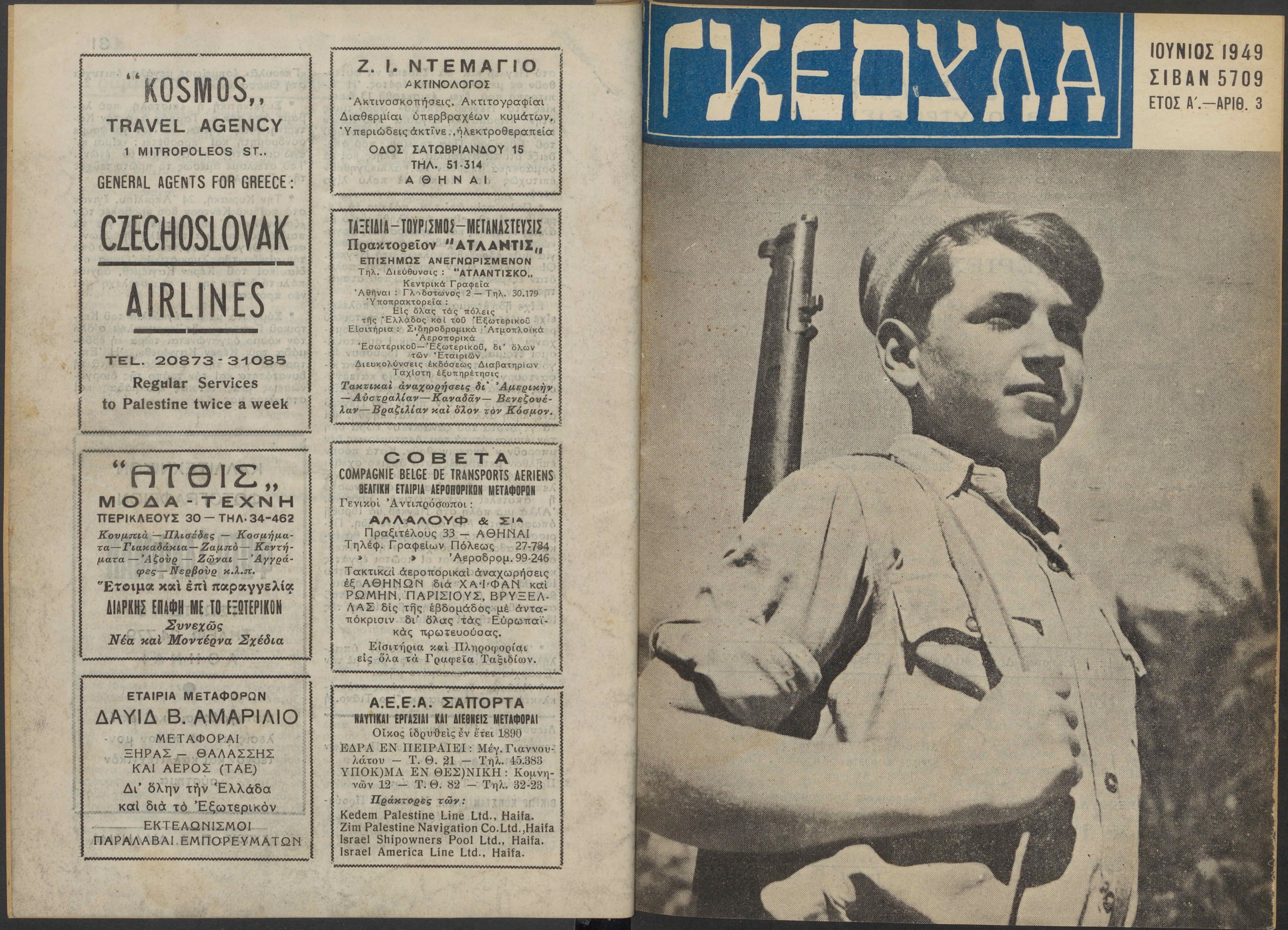 Monthly publication of Keren Kayemeth LeIsrael (Jewish National Fund/Εθνικό Εβραϊκό Κεφάλαιο), 12 issues bound in book form, 116 pages.