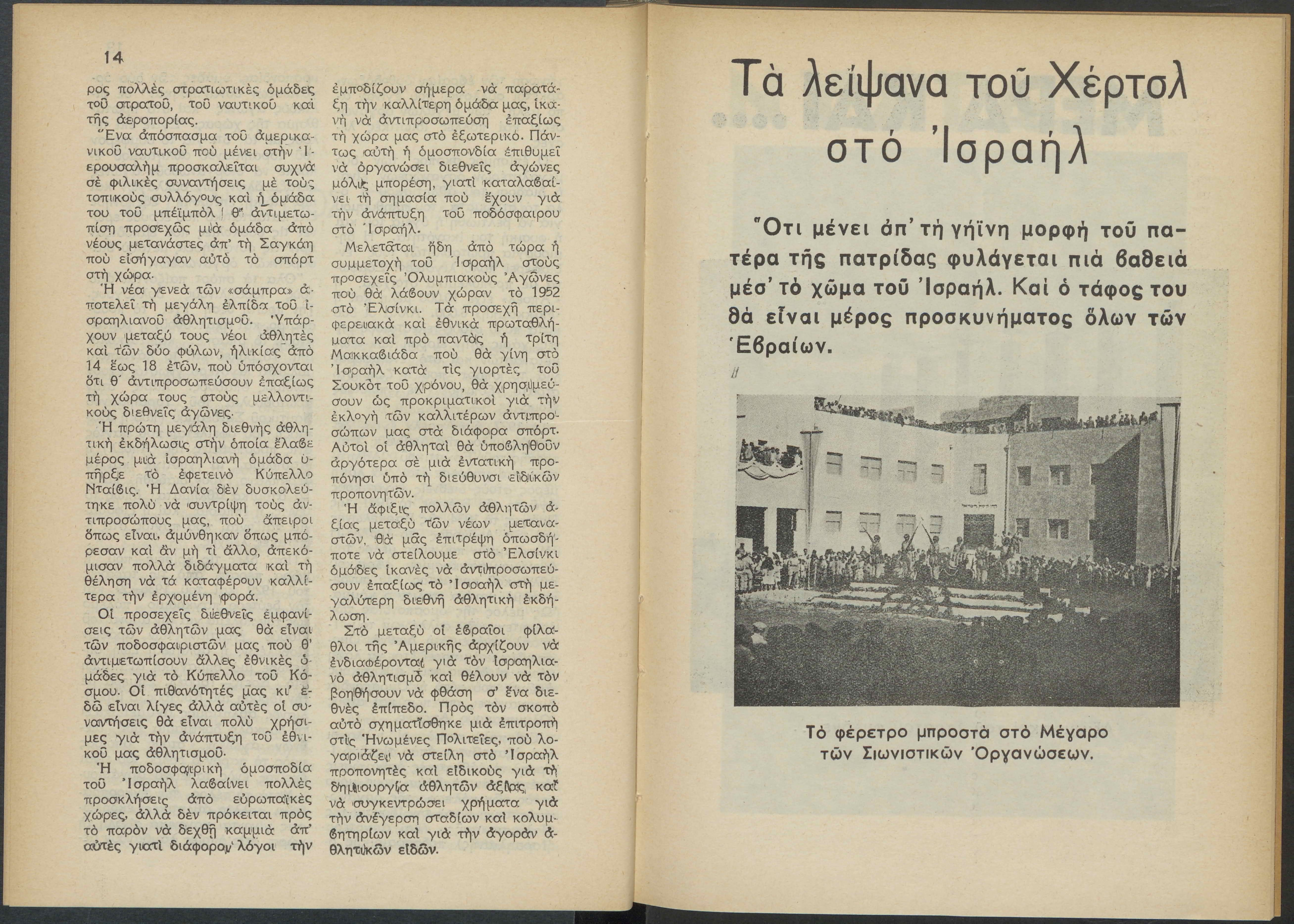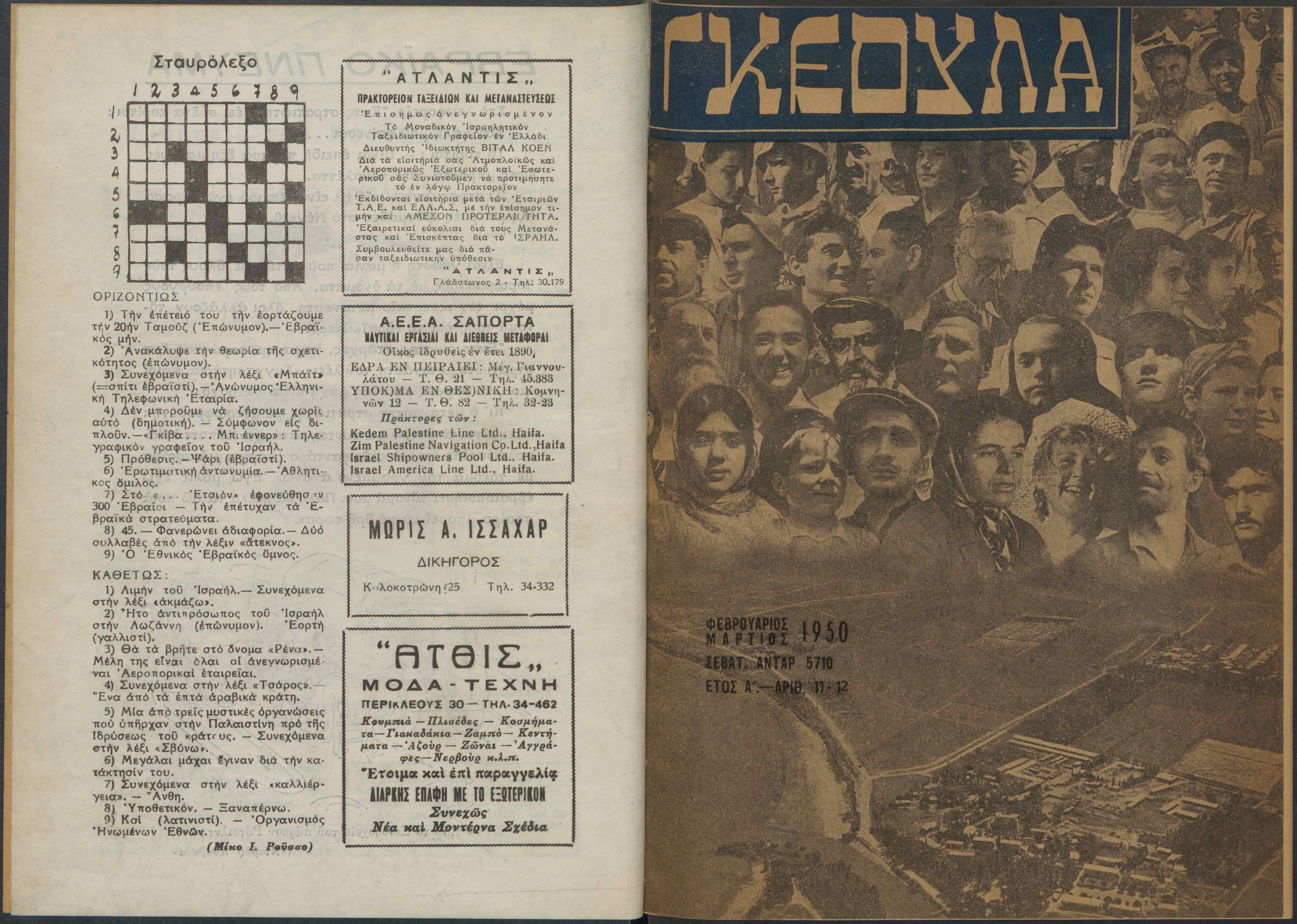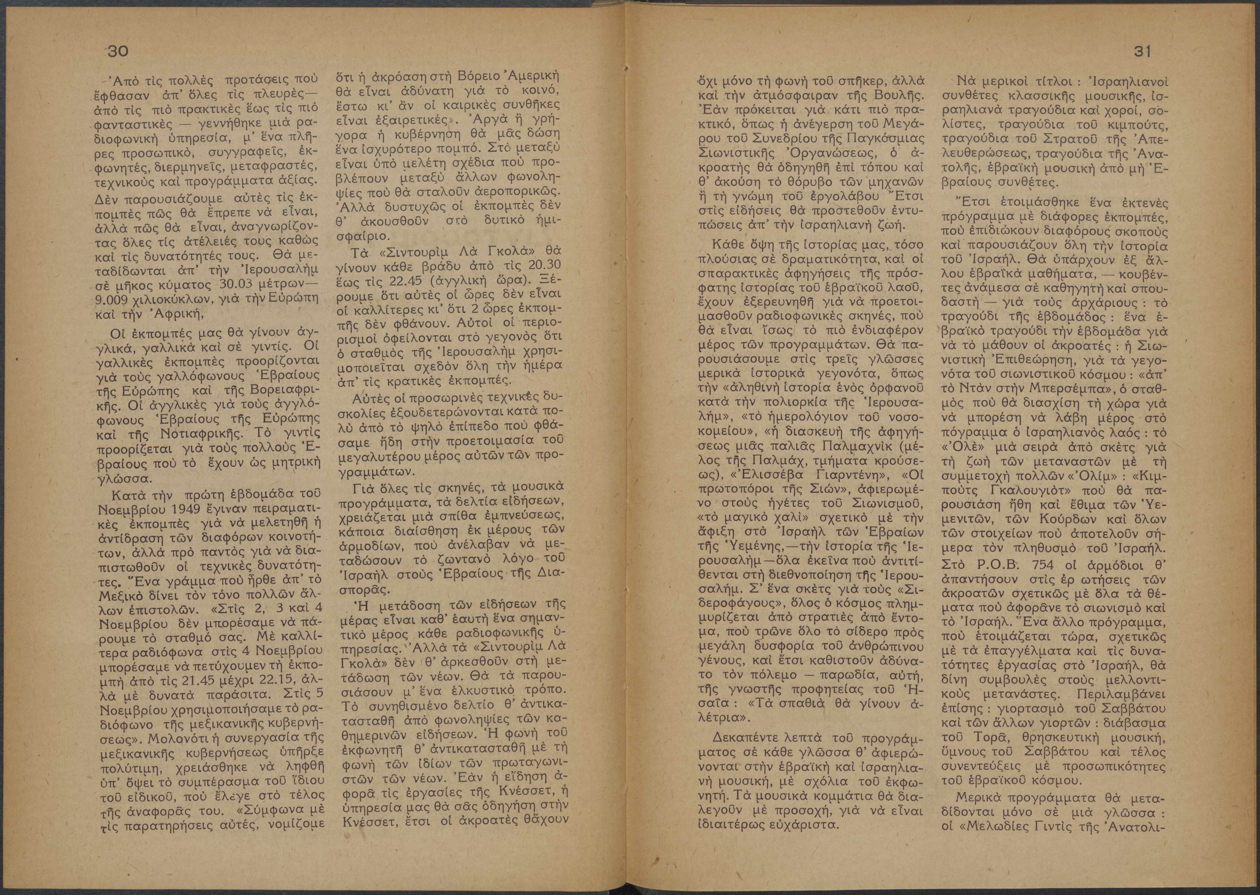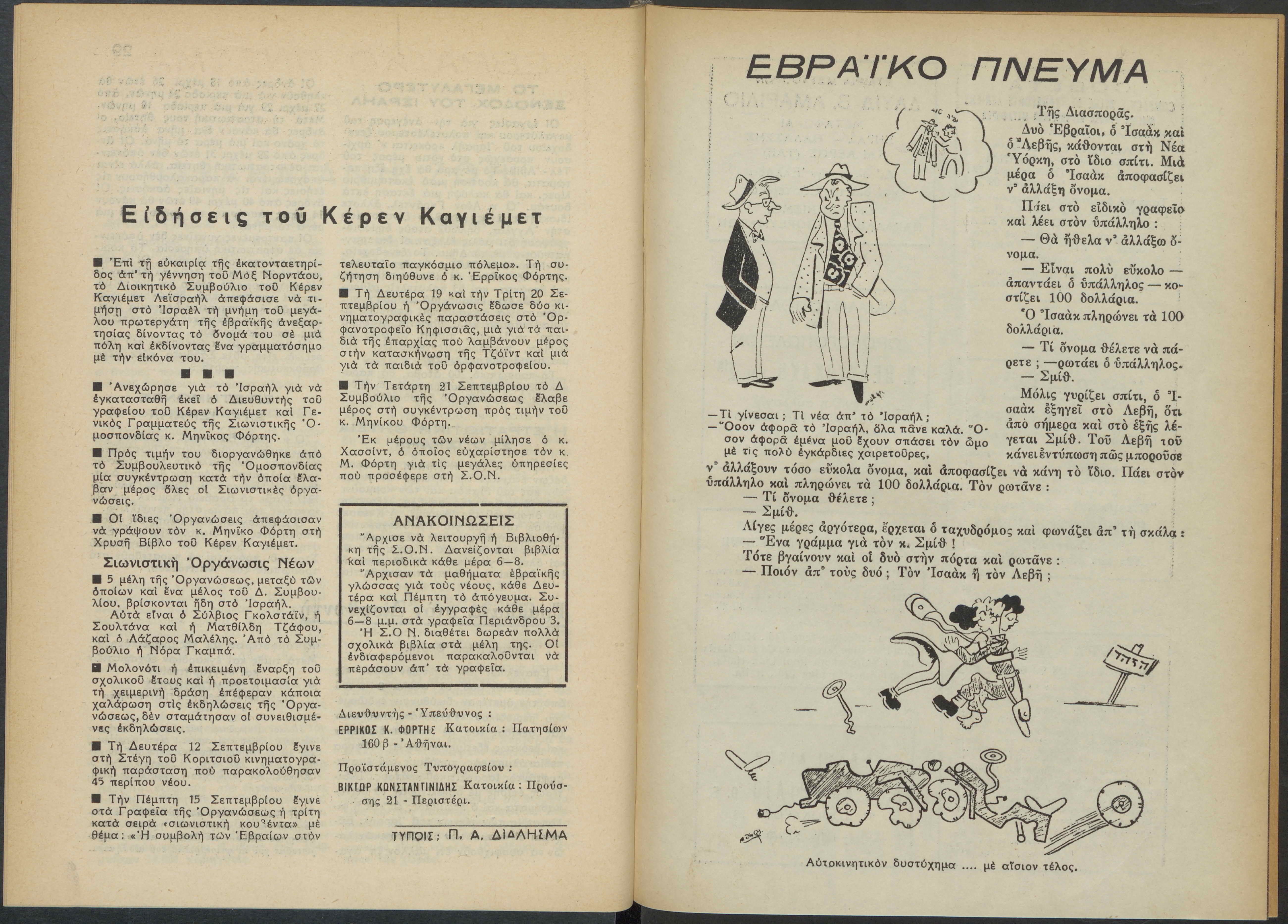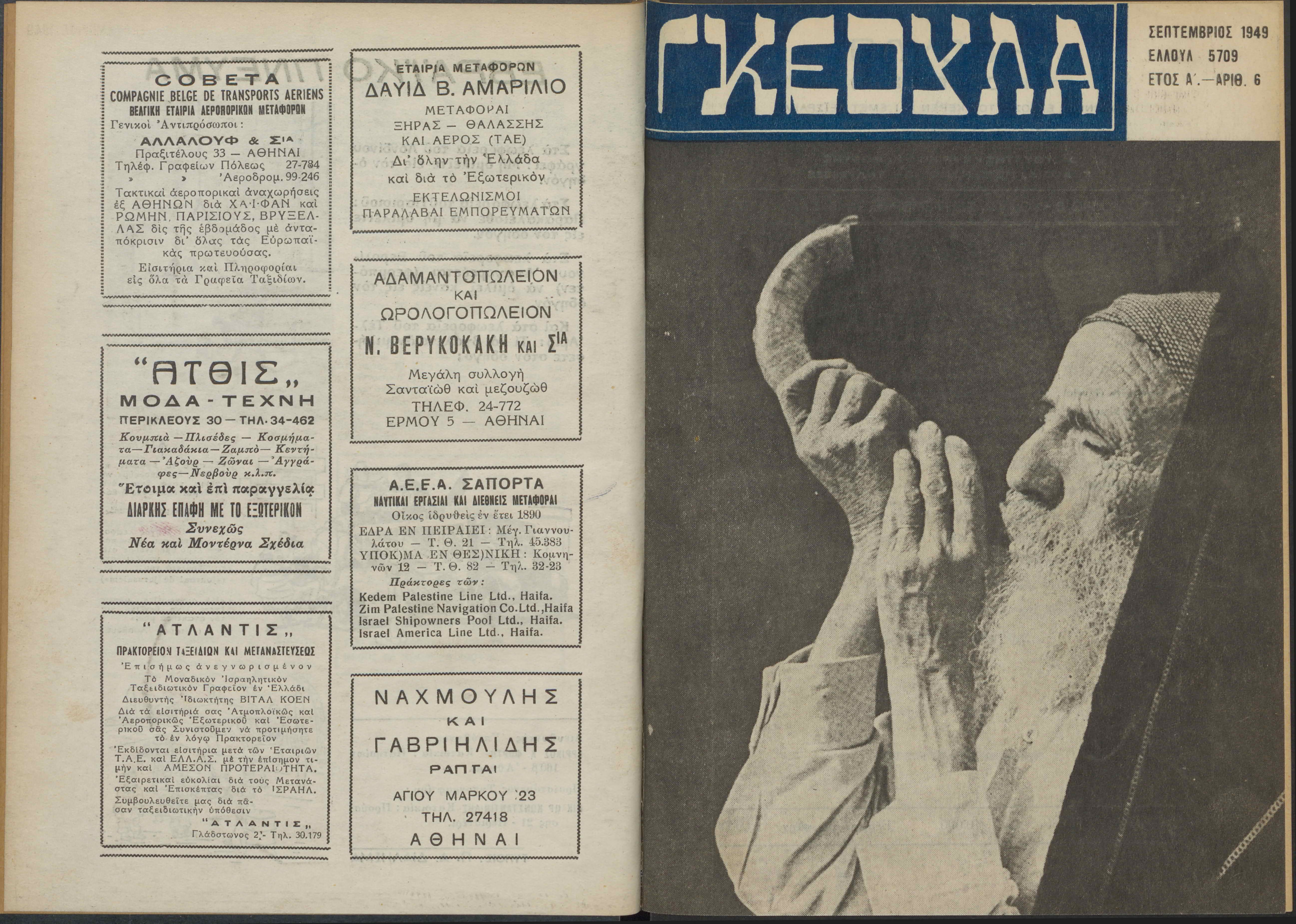 Monthly publication of Keren Kayemeth LeIsrael (Jewish National Fund/Εθνικό Εβραϊκό Κεφάλαιο), 12 issues bound in book form, 116 pages.