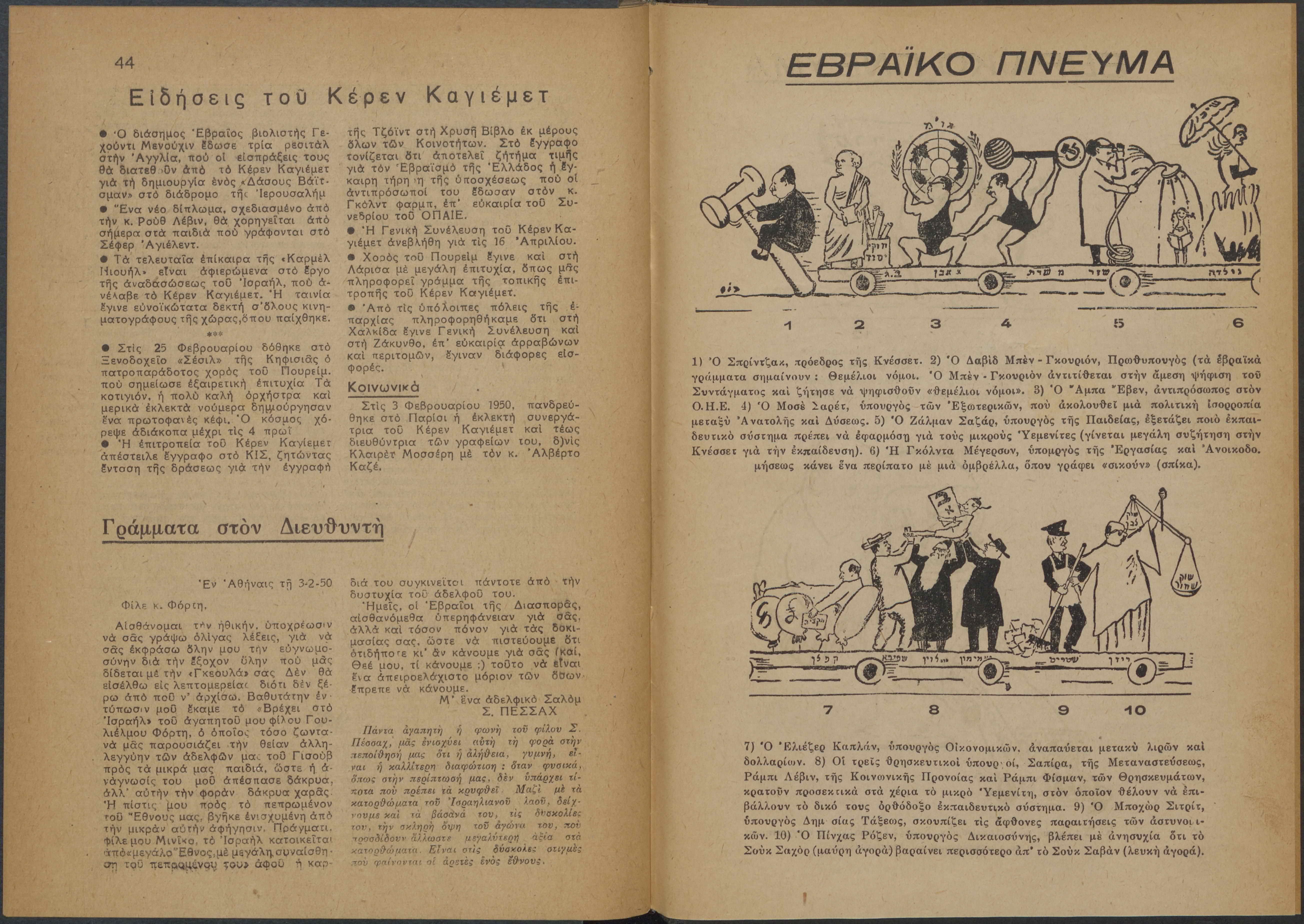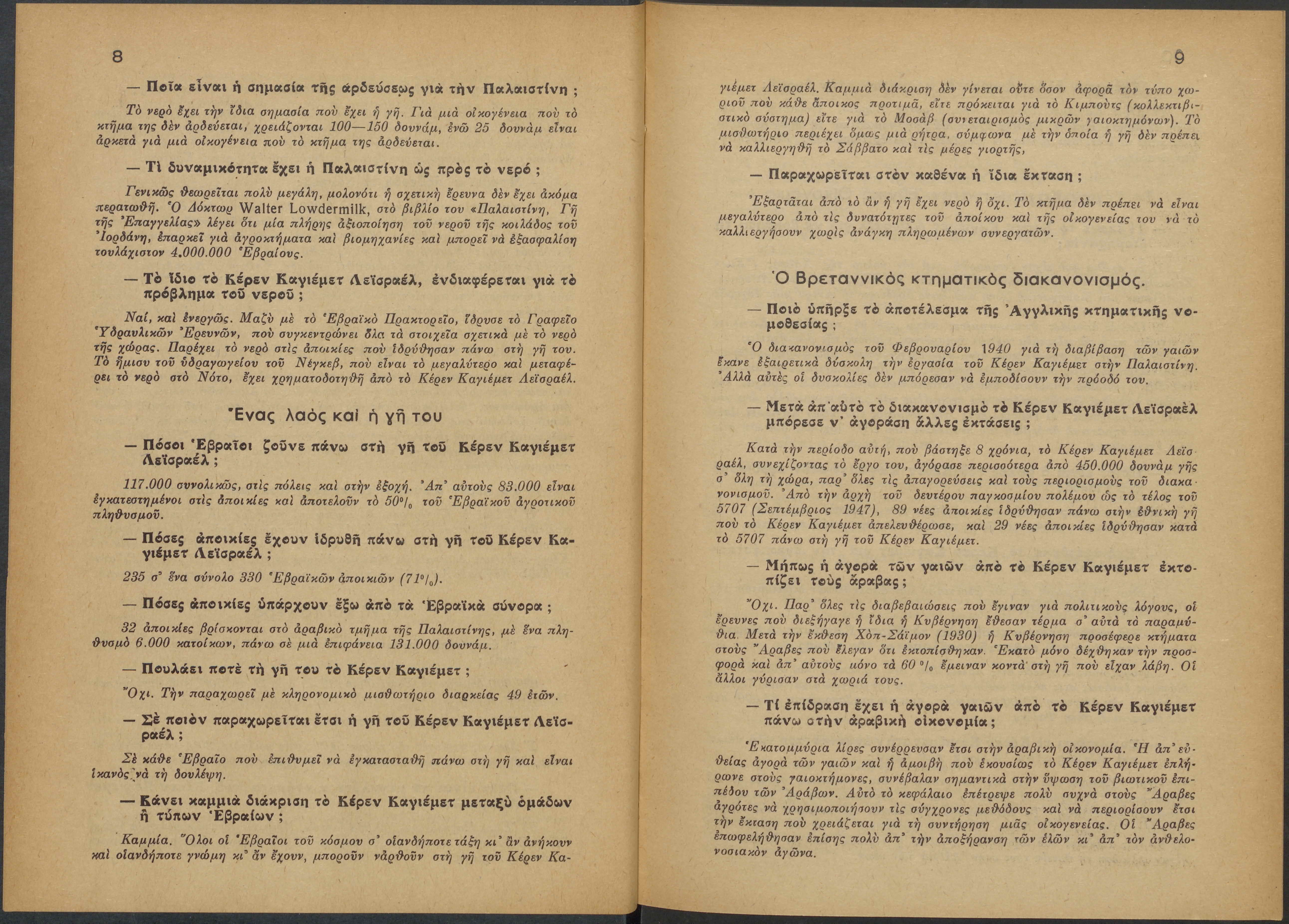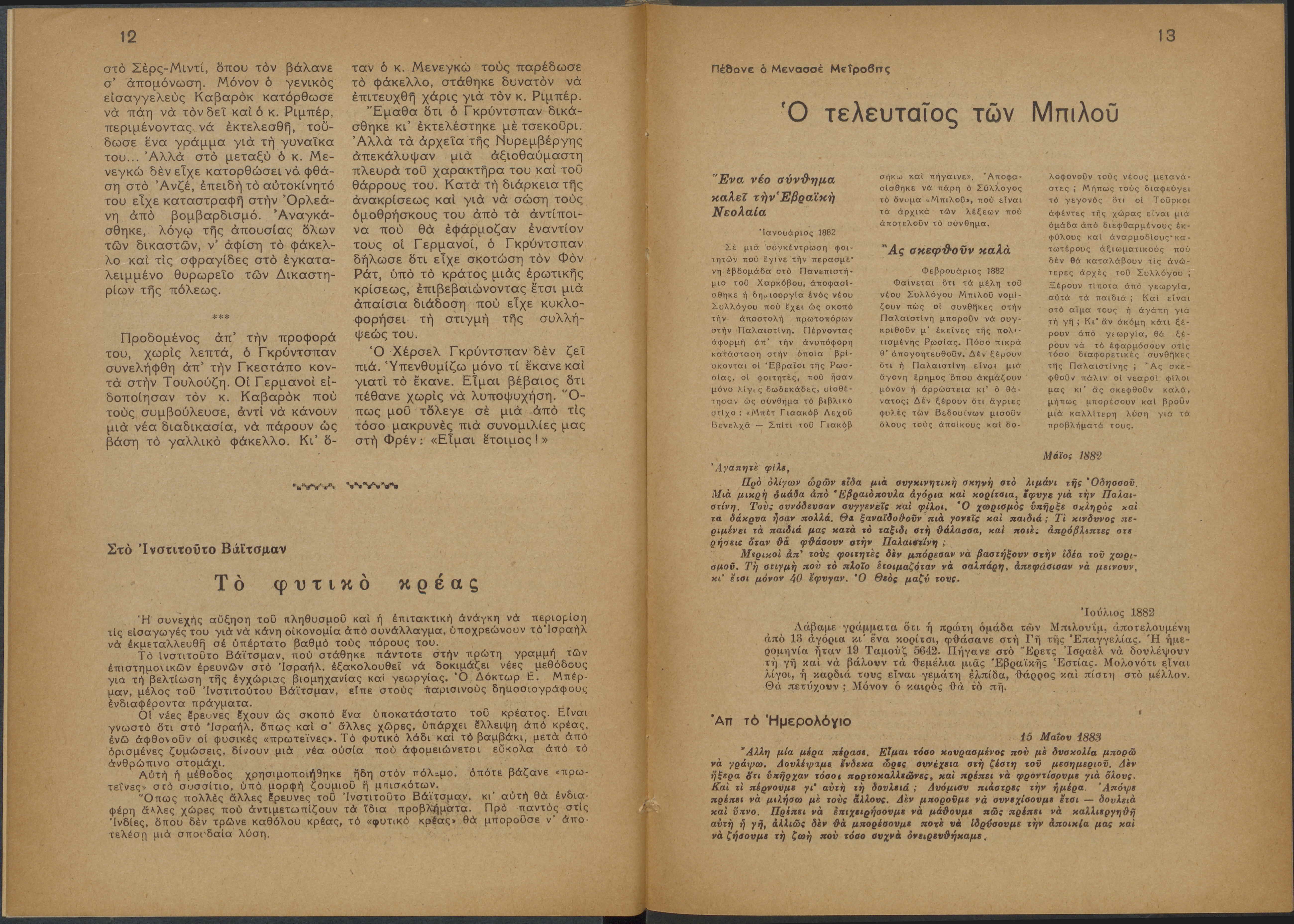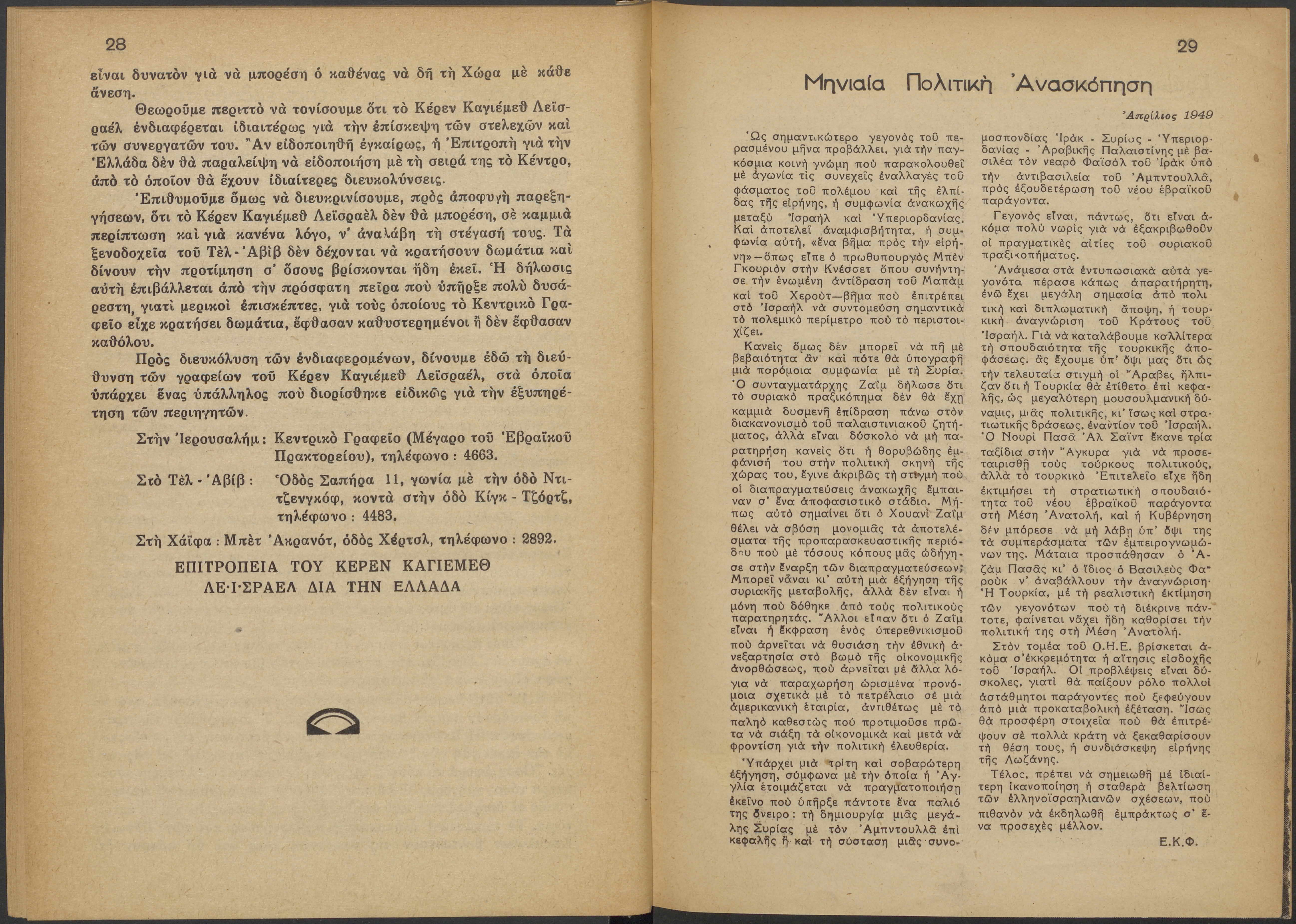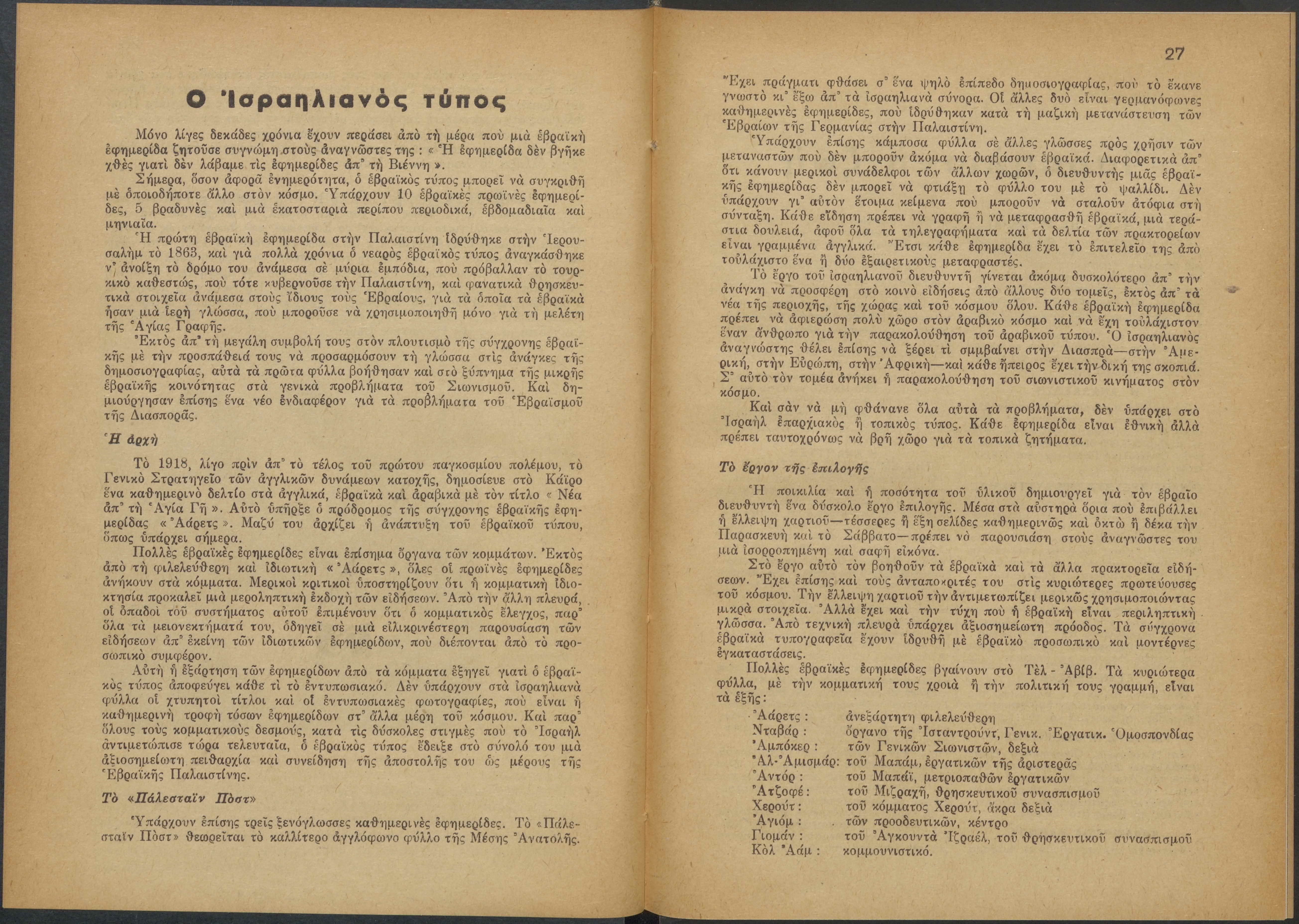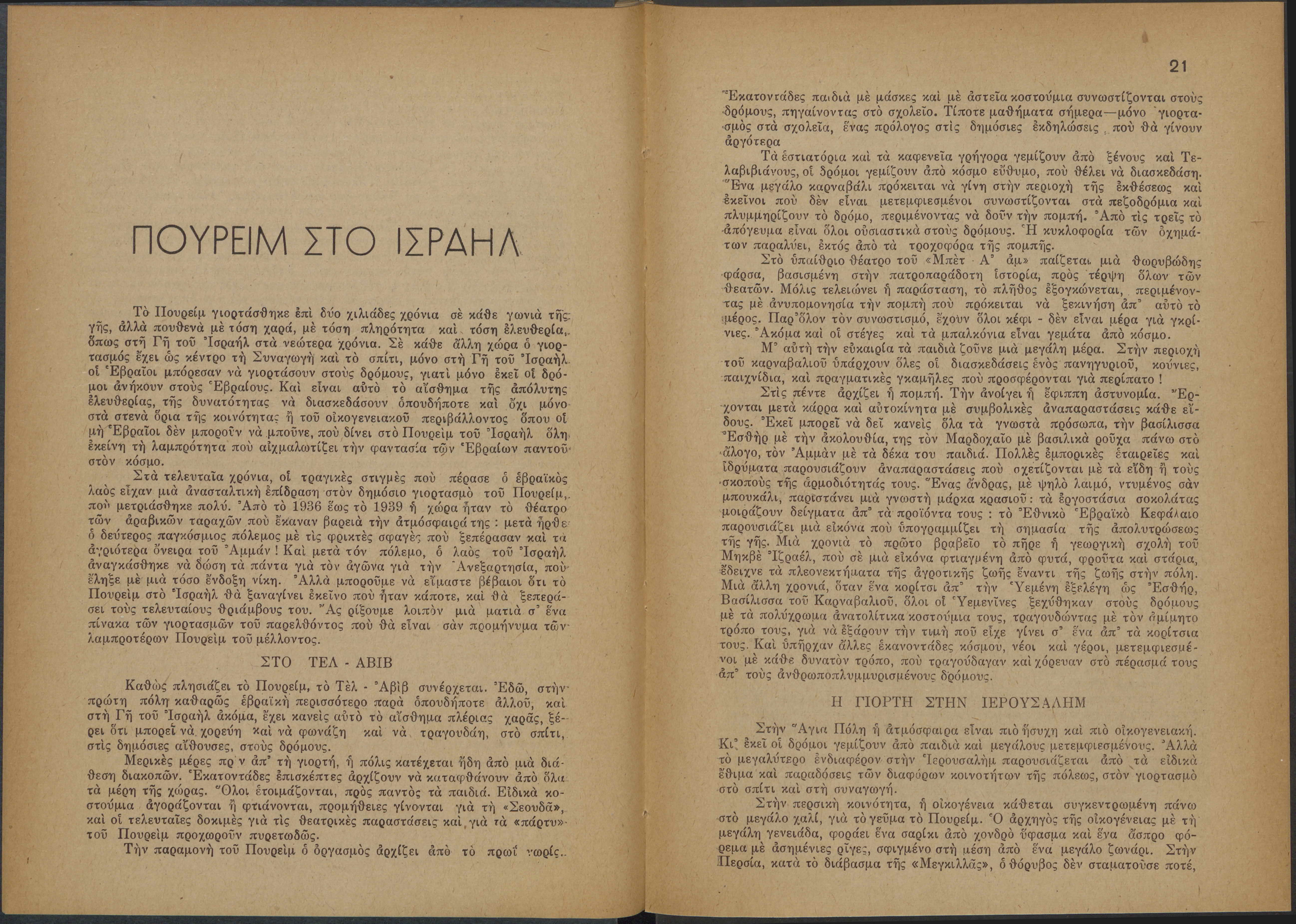 Monthly publication of Keren Kayemeth LeIsrael (Jewish National Fund/Εθνικό Εβραϊκό Κεφάλαιο), 12 issues bound in book form, 116 pages.