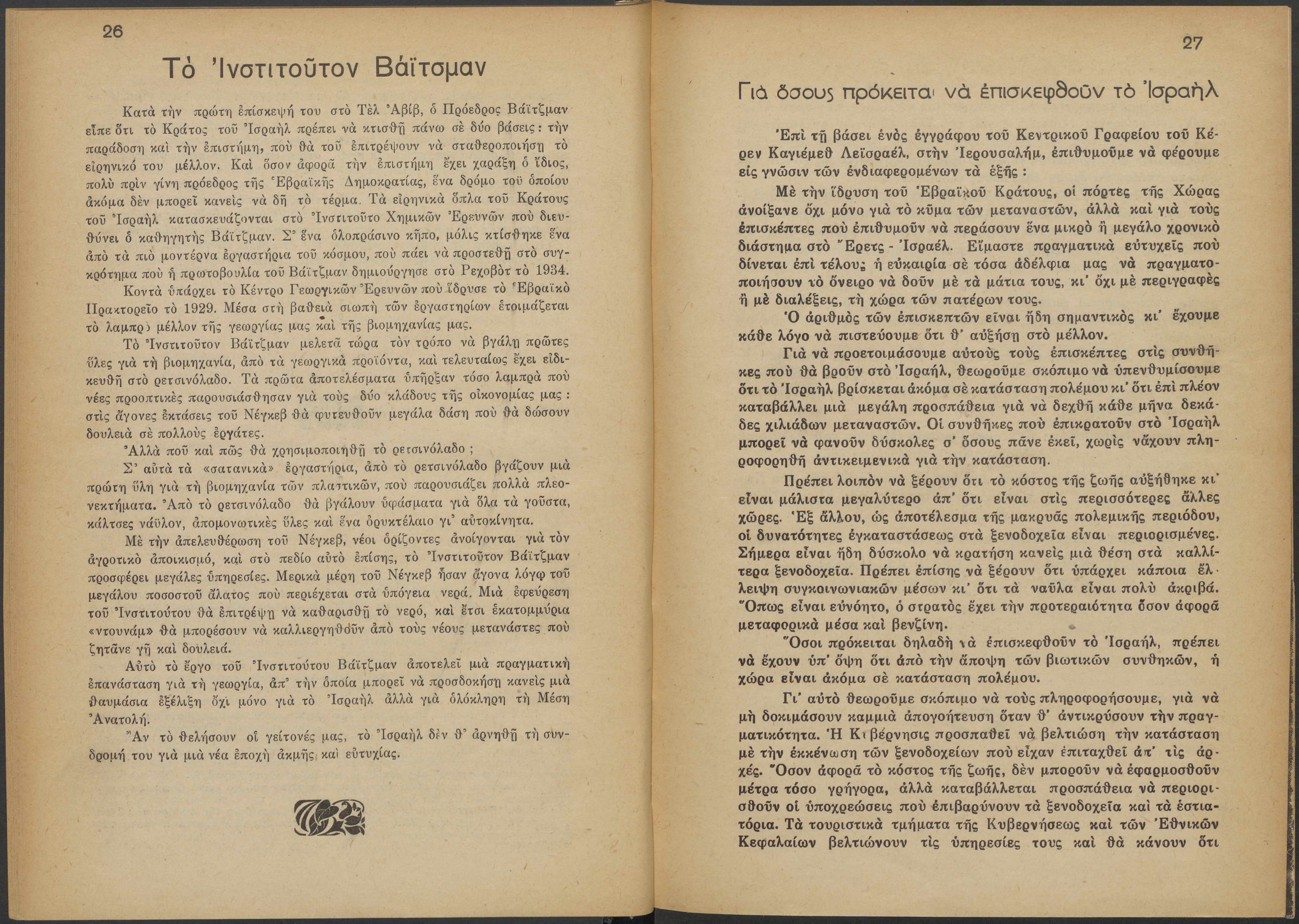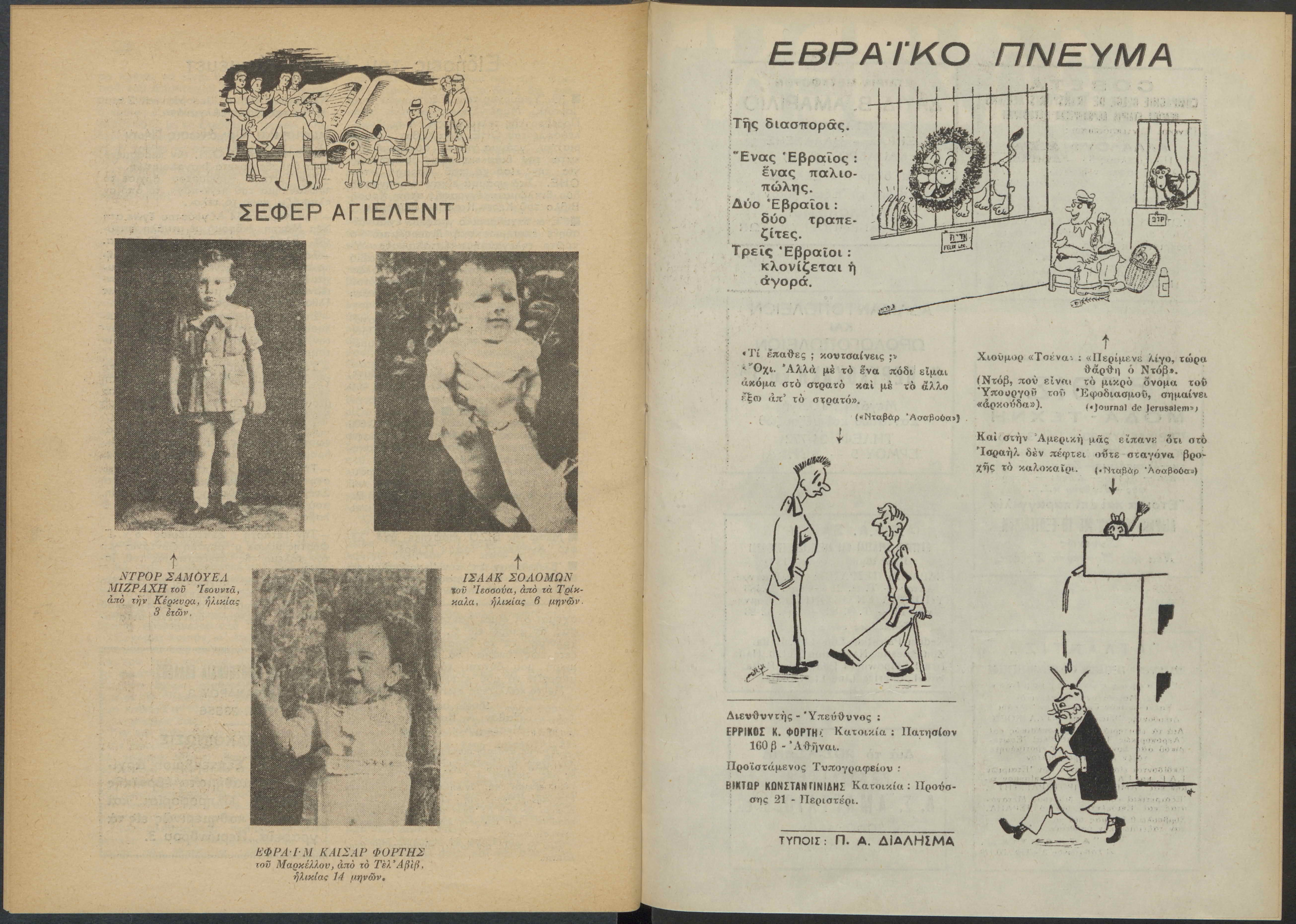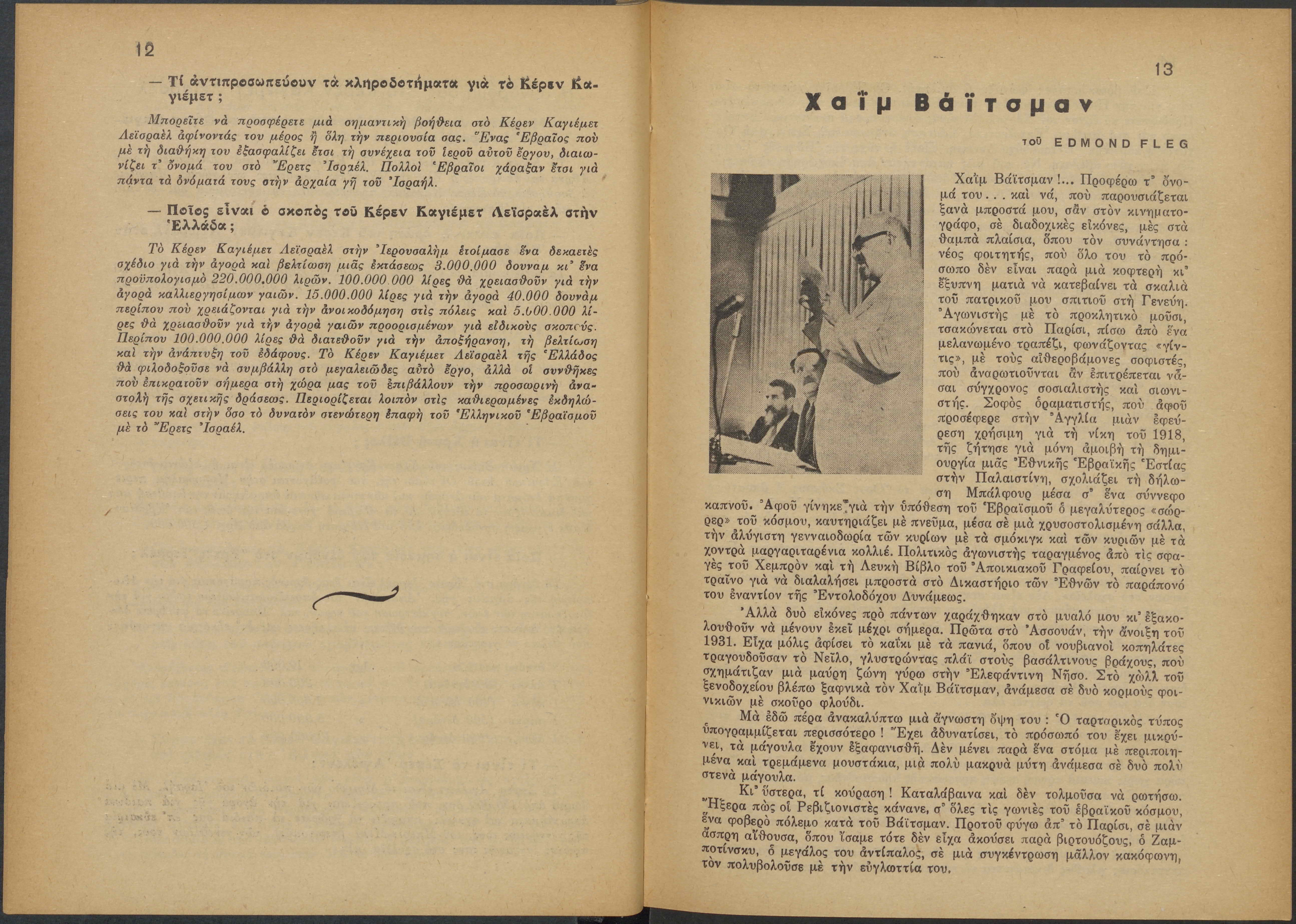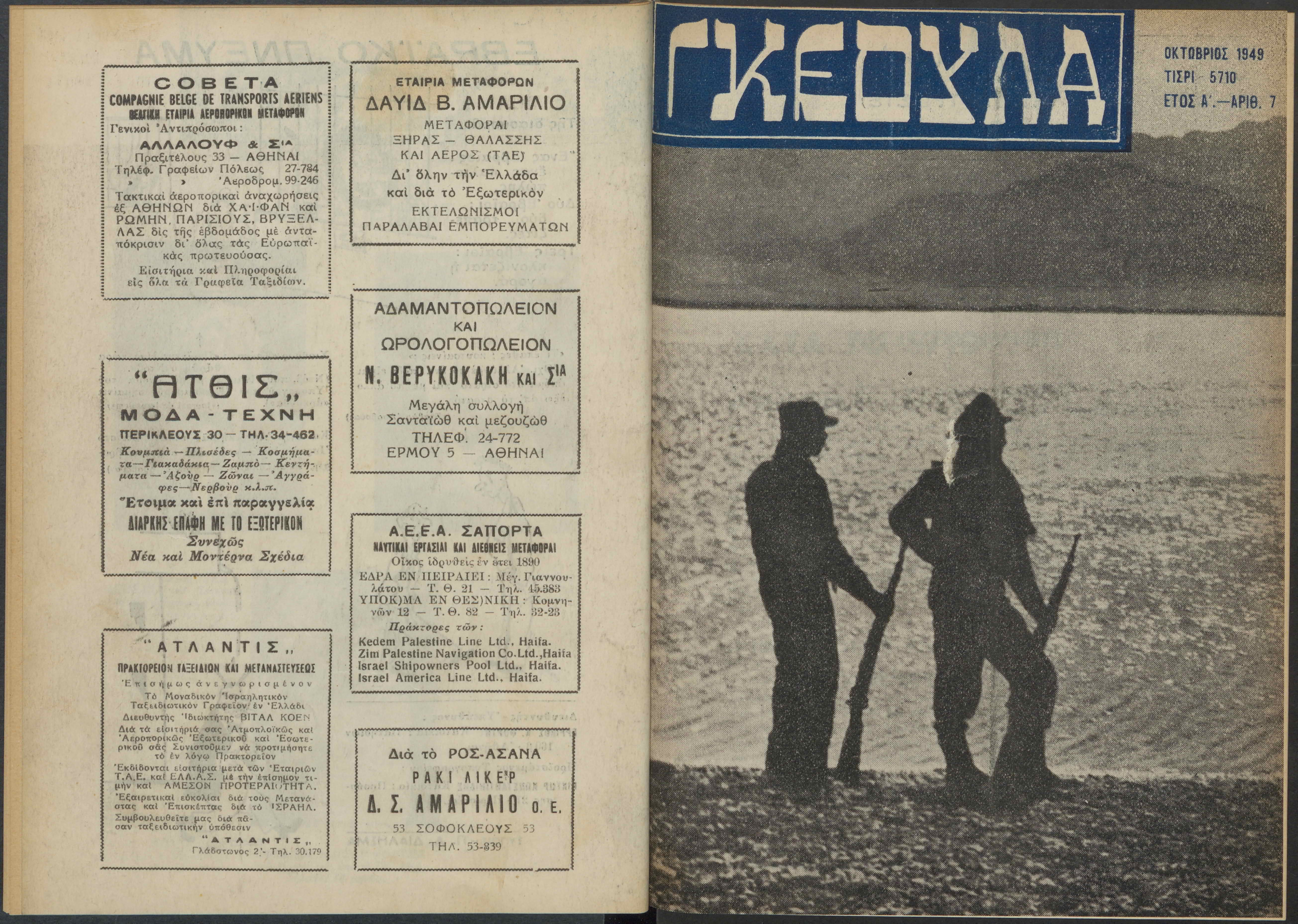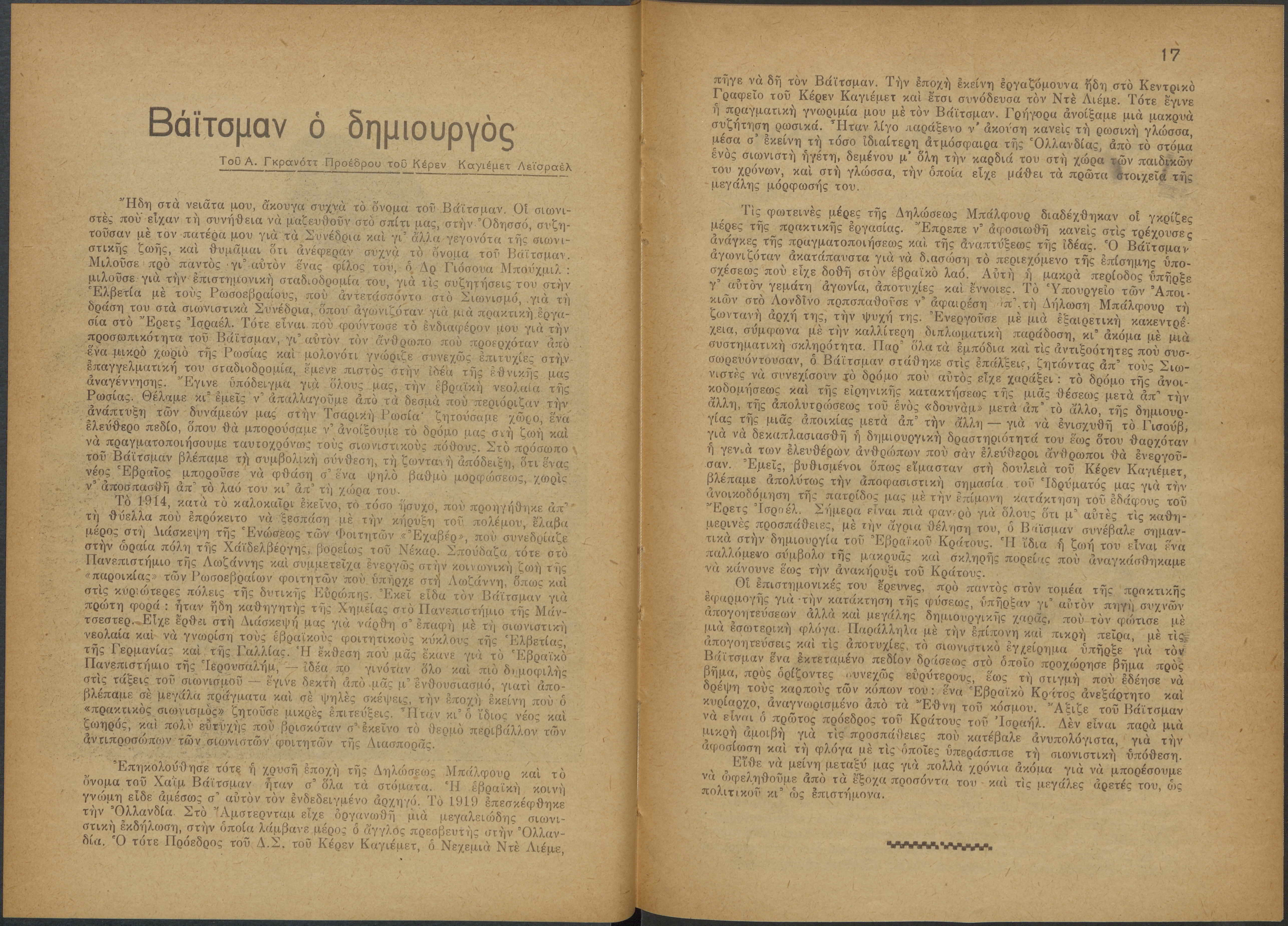 Monthly publication of Keren Kayemeth LeIsrael (Jewish National Fund/Εθνικό Εβραϊκό Κεφάλαιο), 12 issues bound in book form, 116 pages.