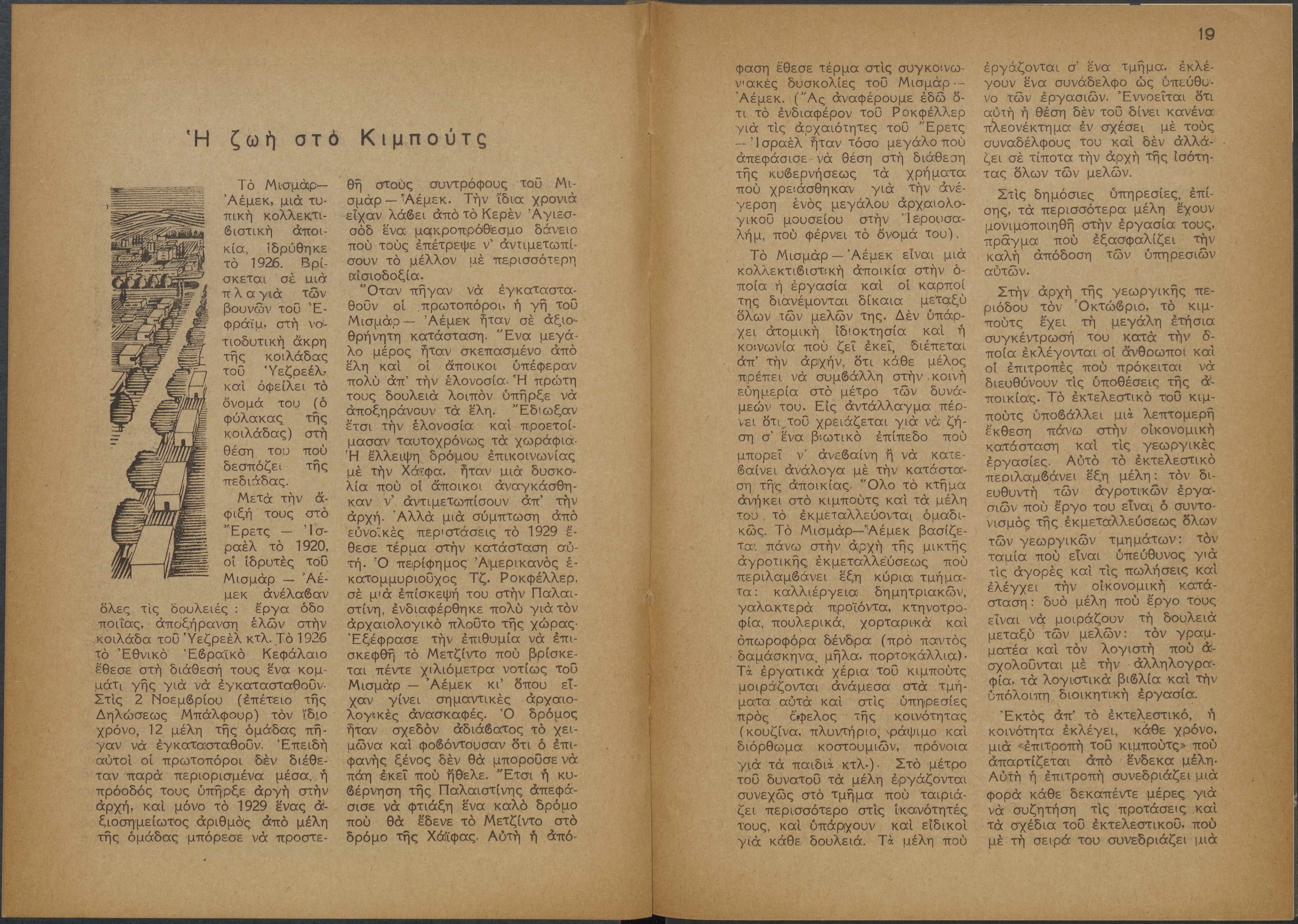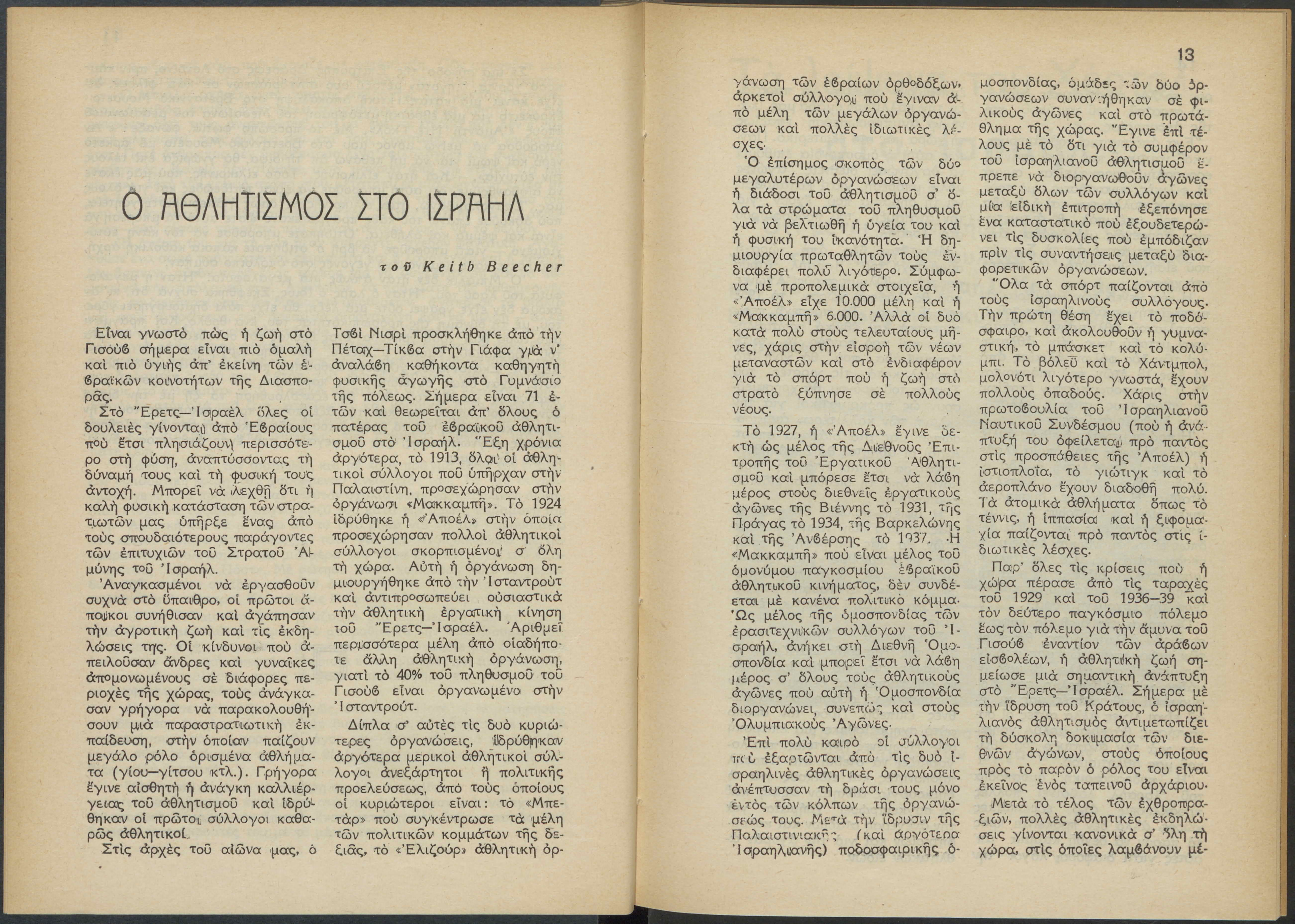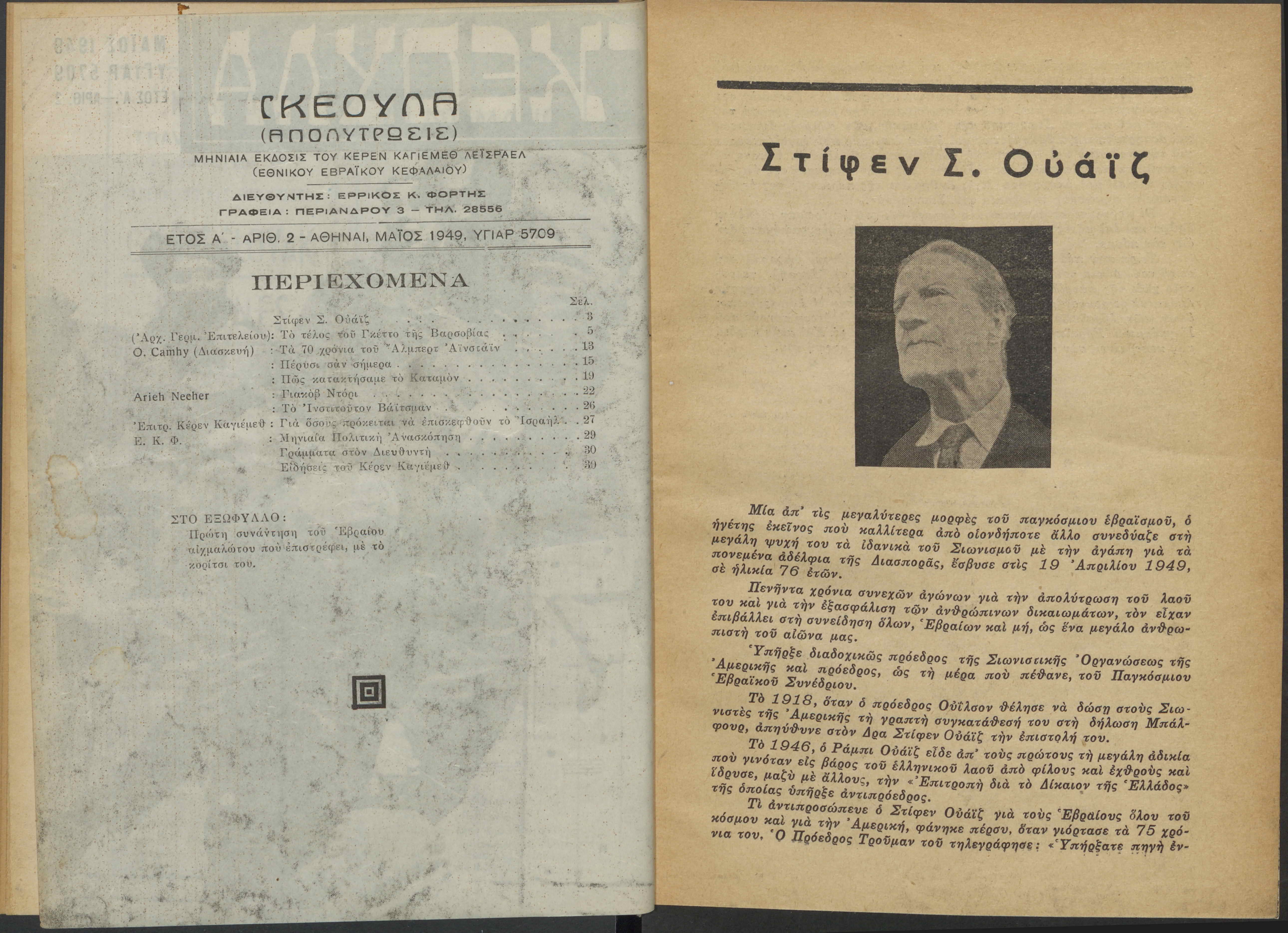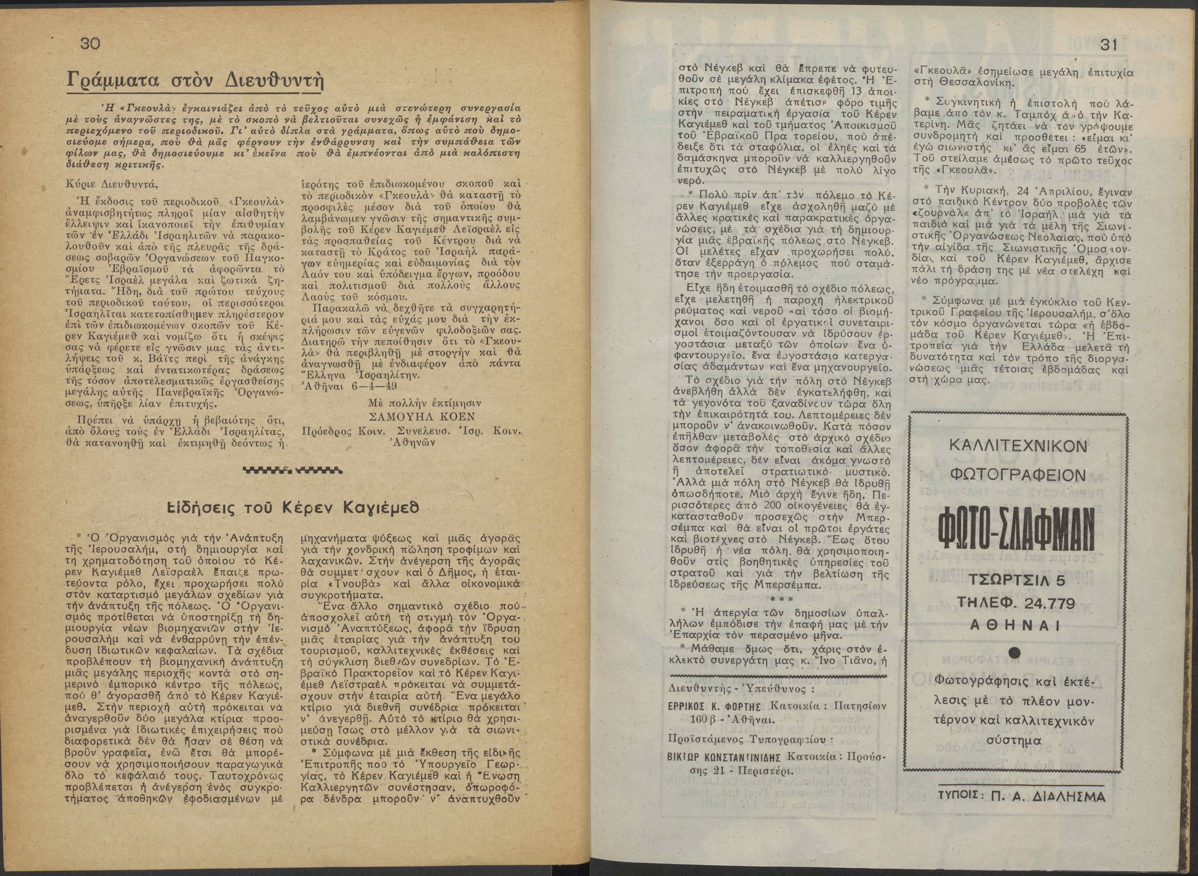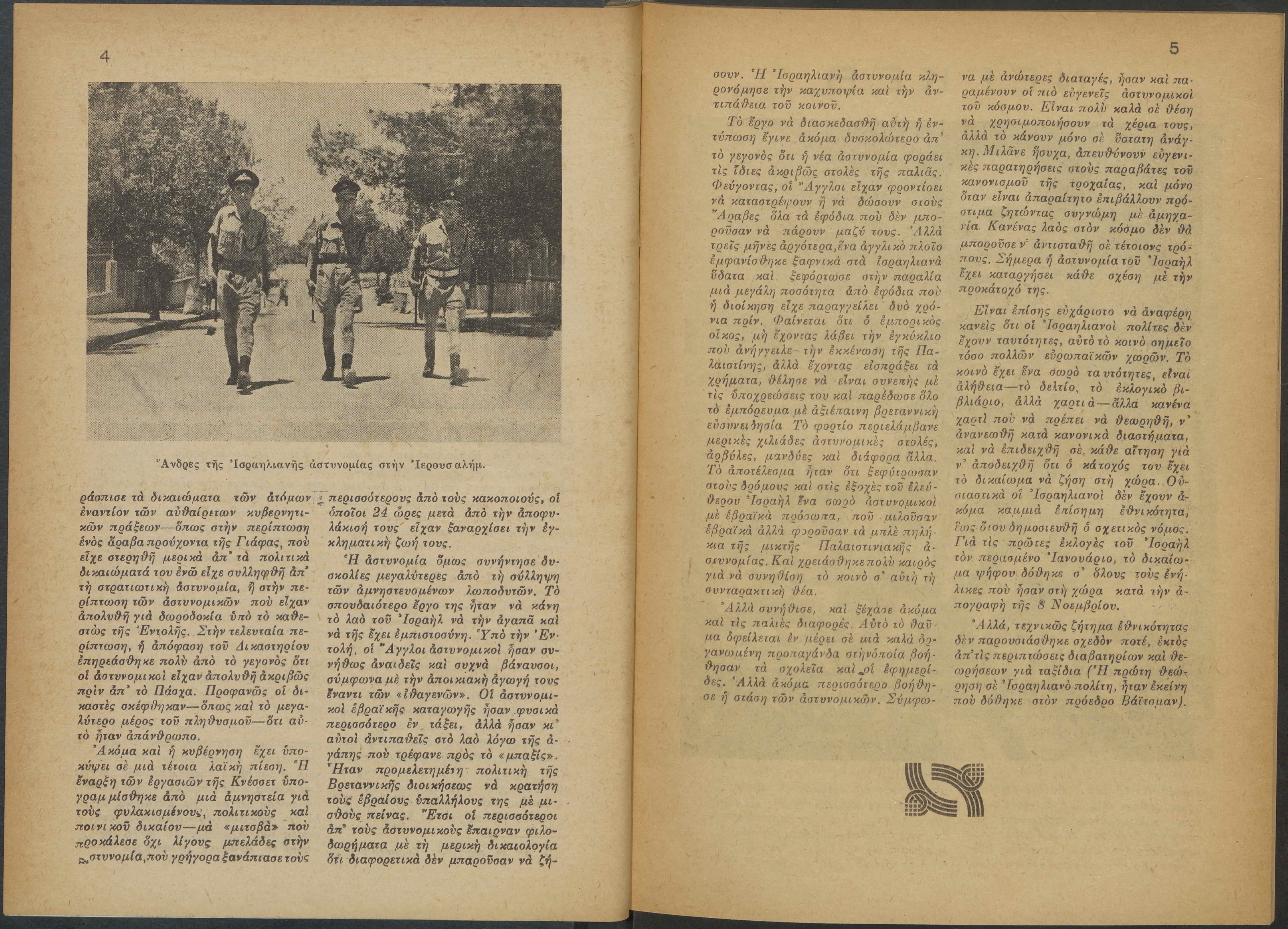 Monthly publication of Keren Kayemeth LeIsrael (Jewish National Fund/Εθνικό Εβραϊκό Κεφάλαιο), 12 issues bound in book form, 116 pages.