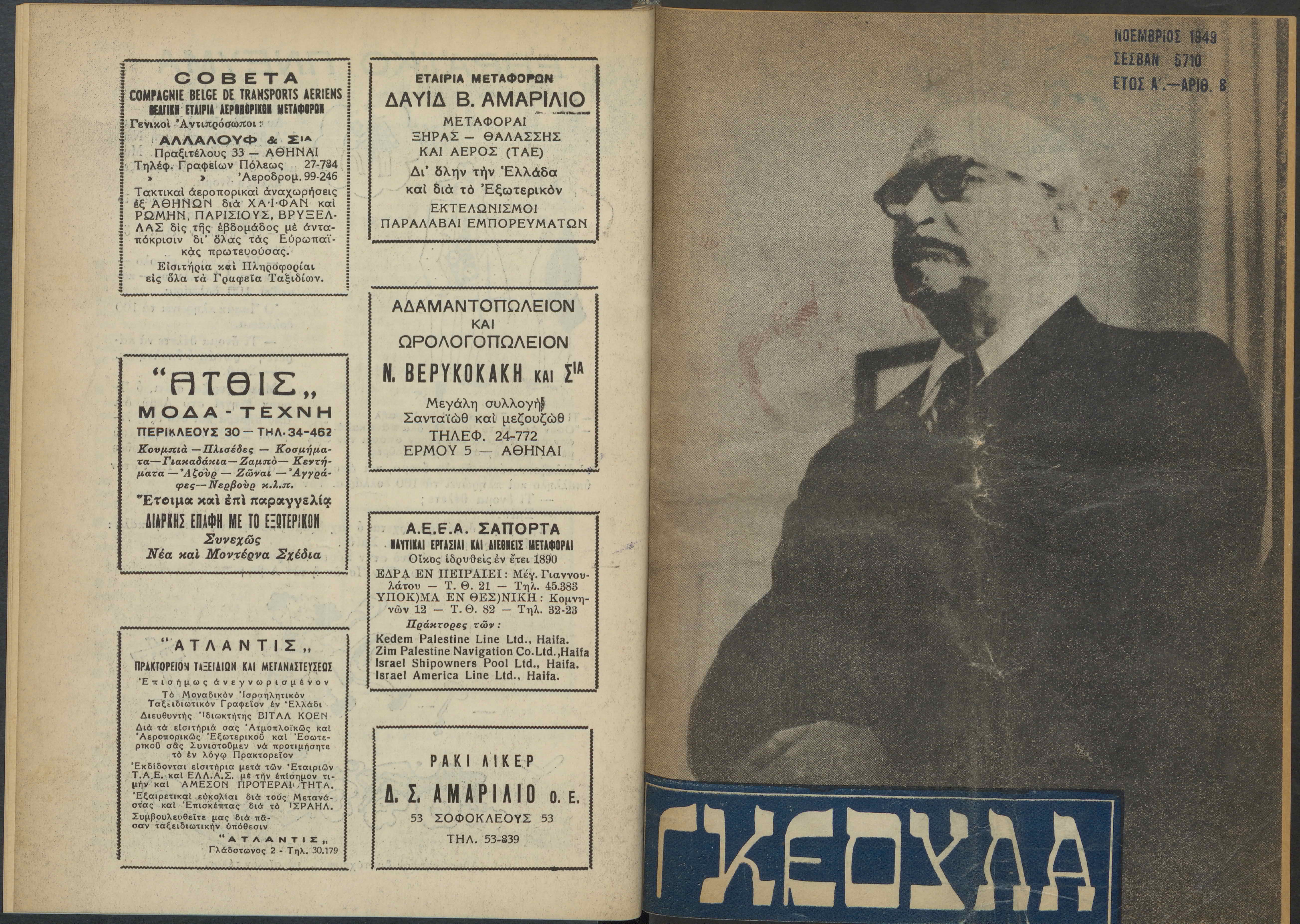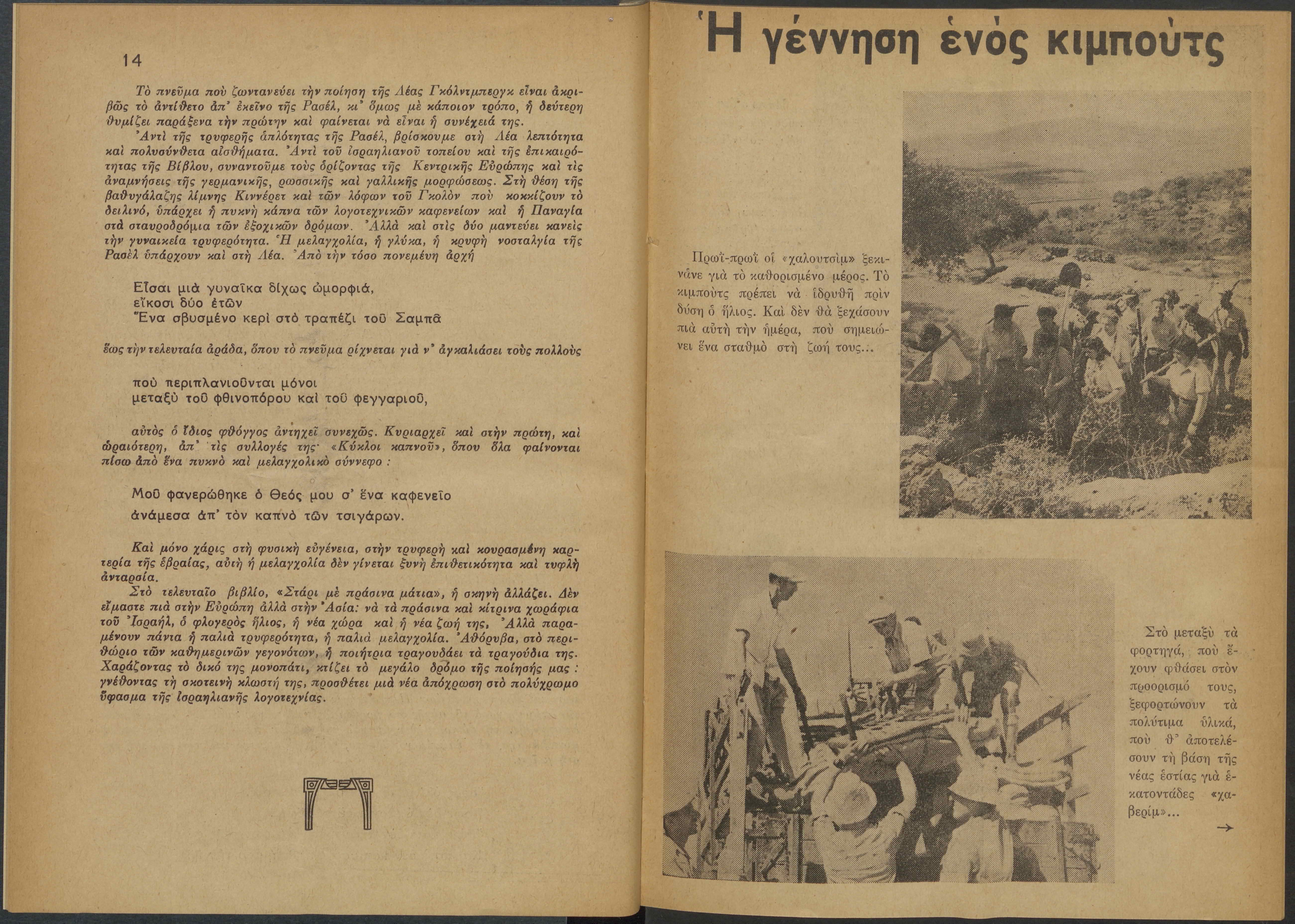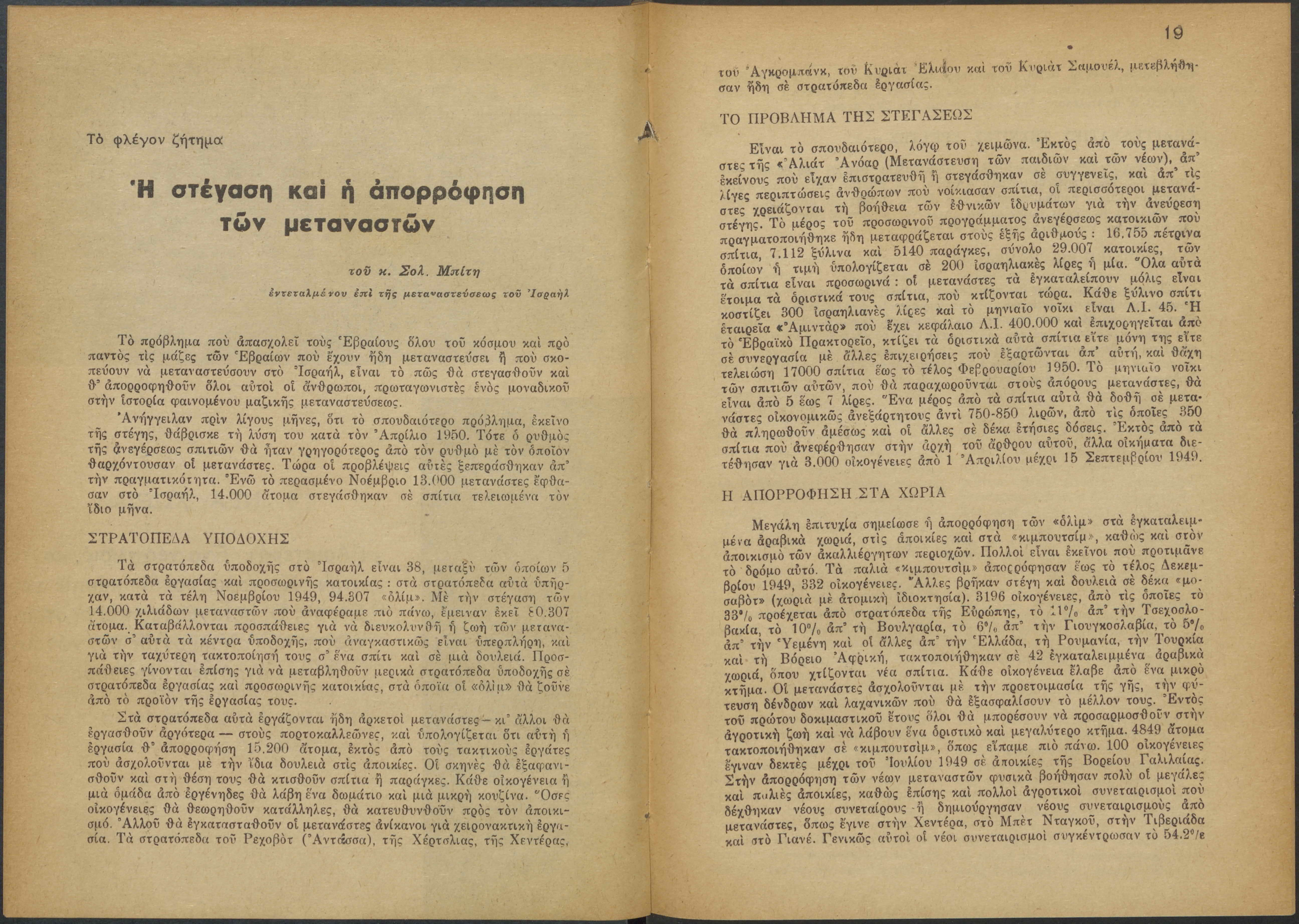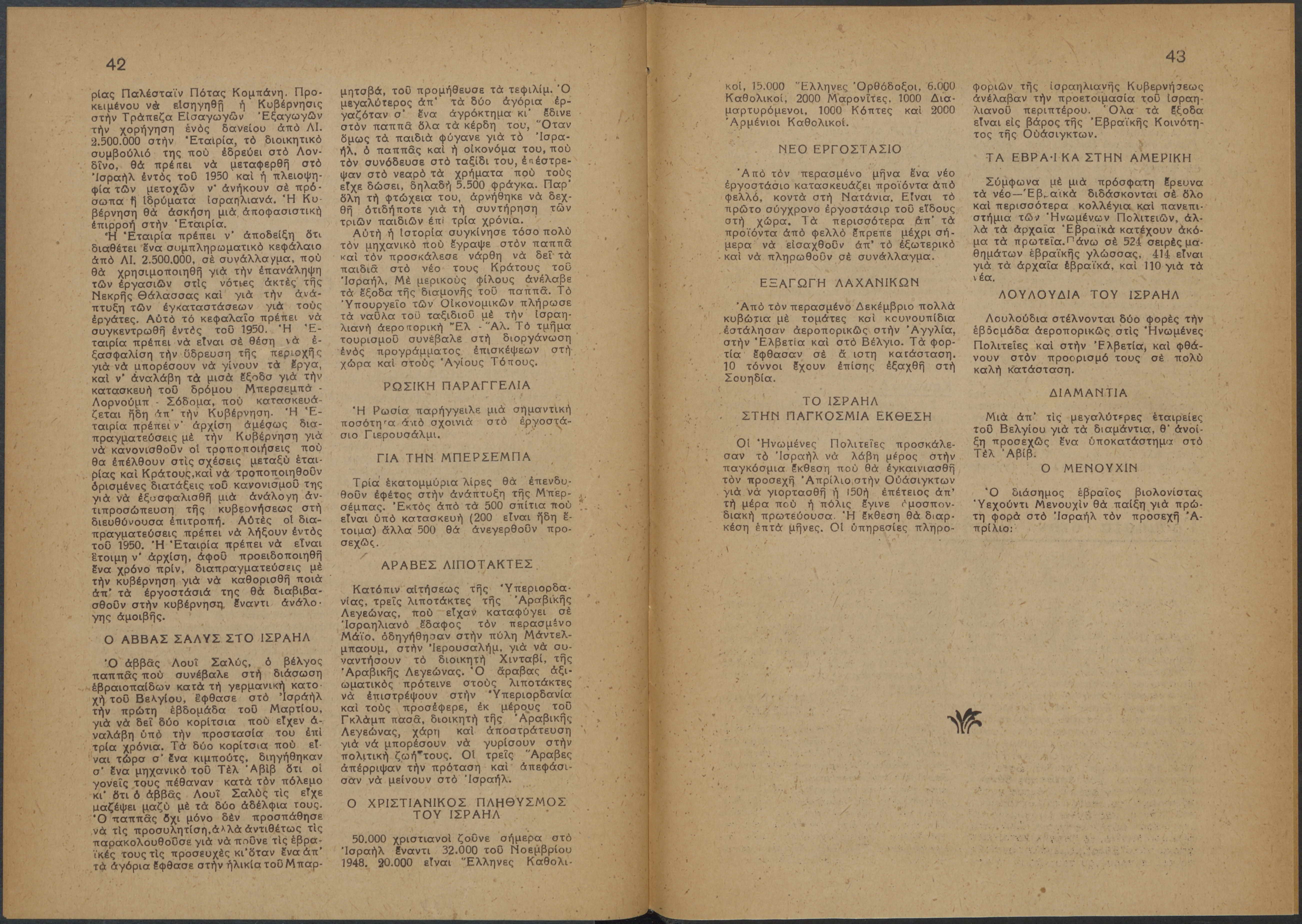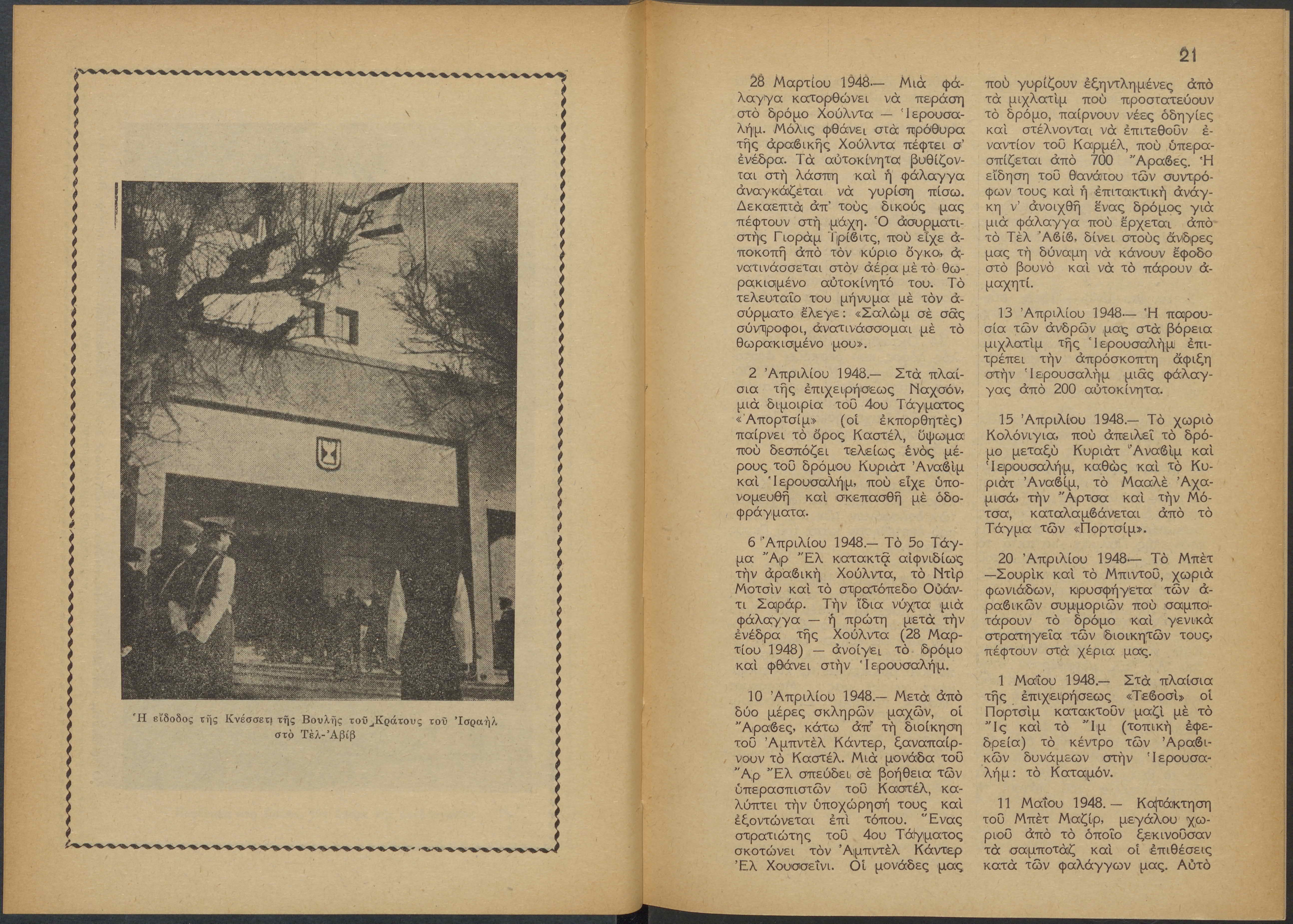 Monthly publication of Keren Kayemeth LeIsrael (Jewish National Fund/Εθνικό Εβραϊκό Κεφάλαιο), 12 issues bound in book form, 116 pages.