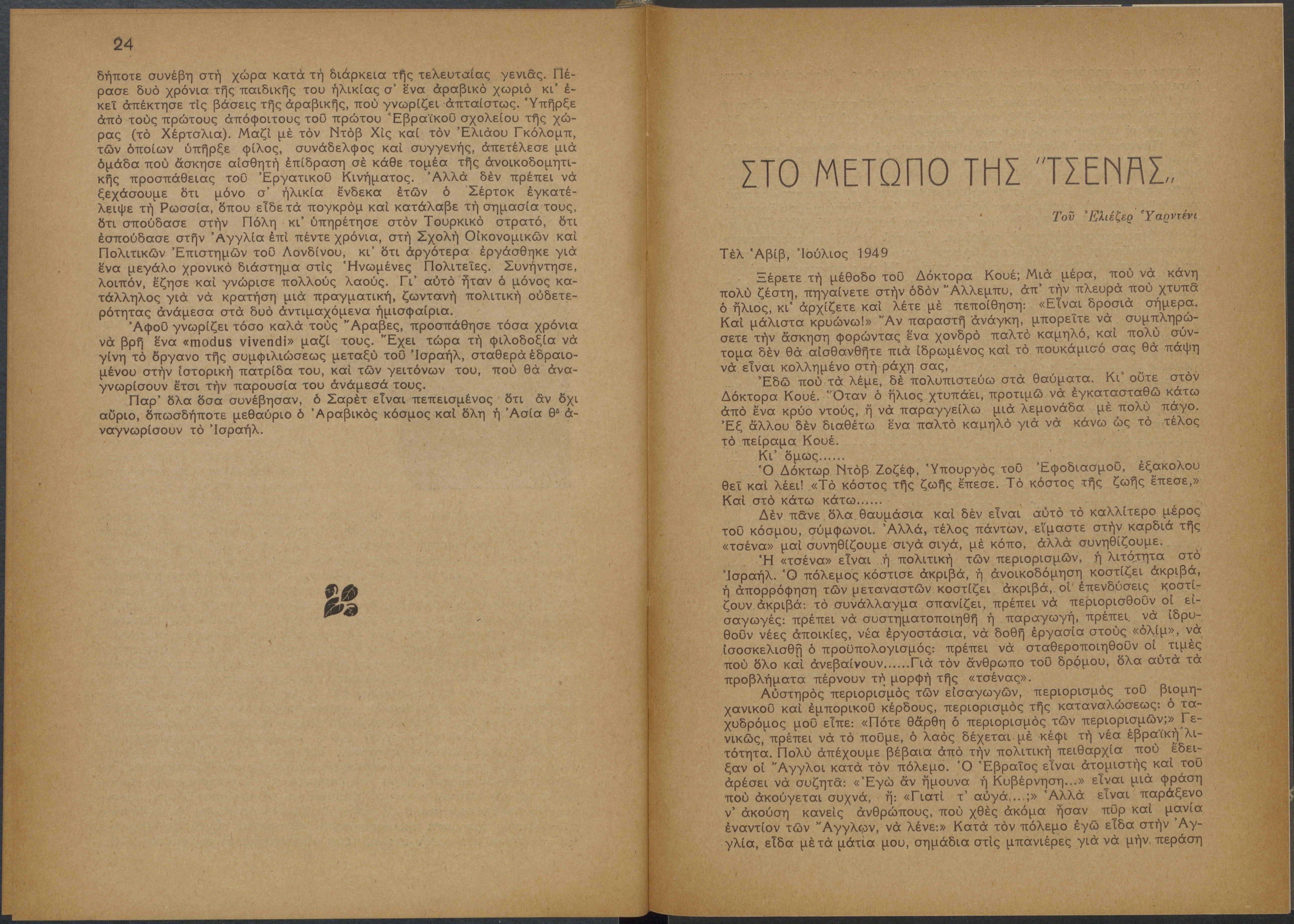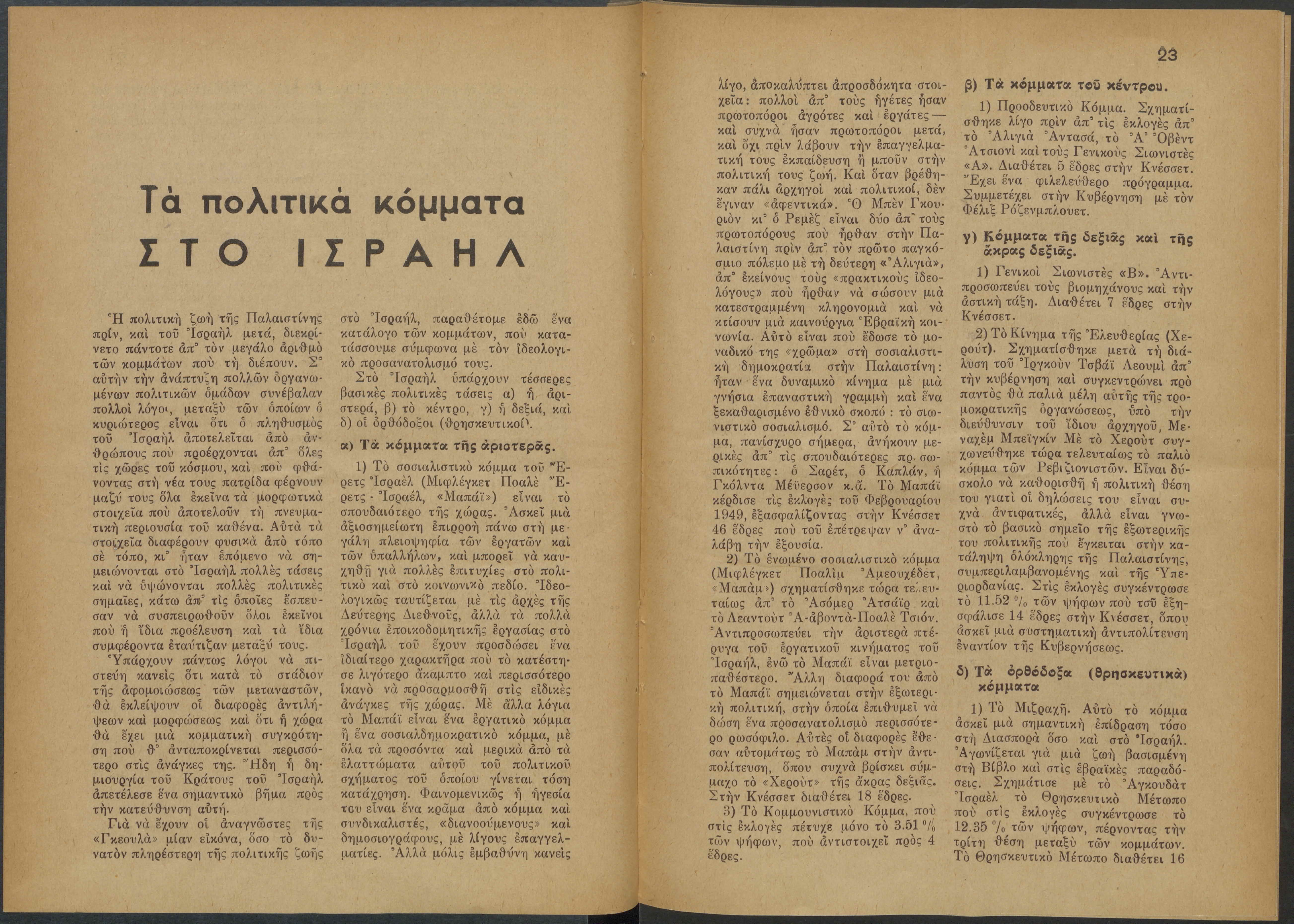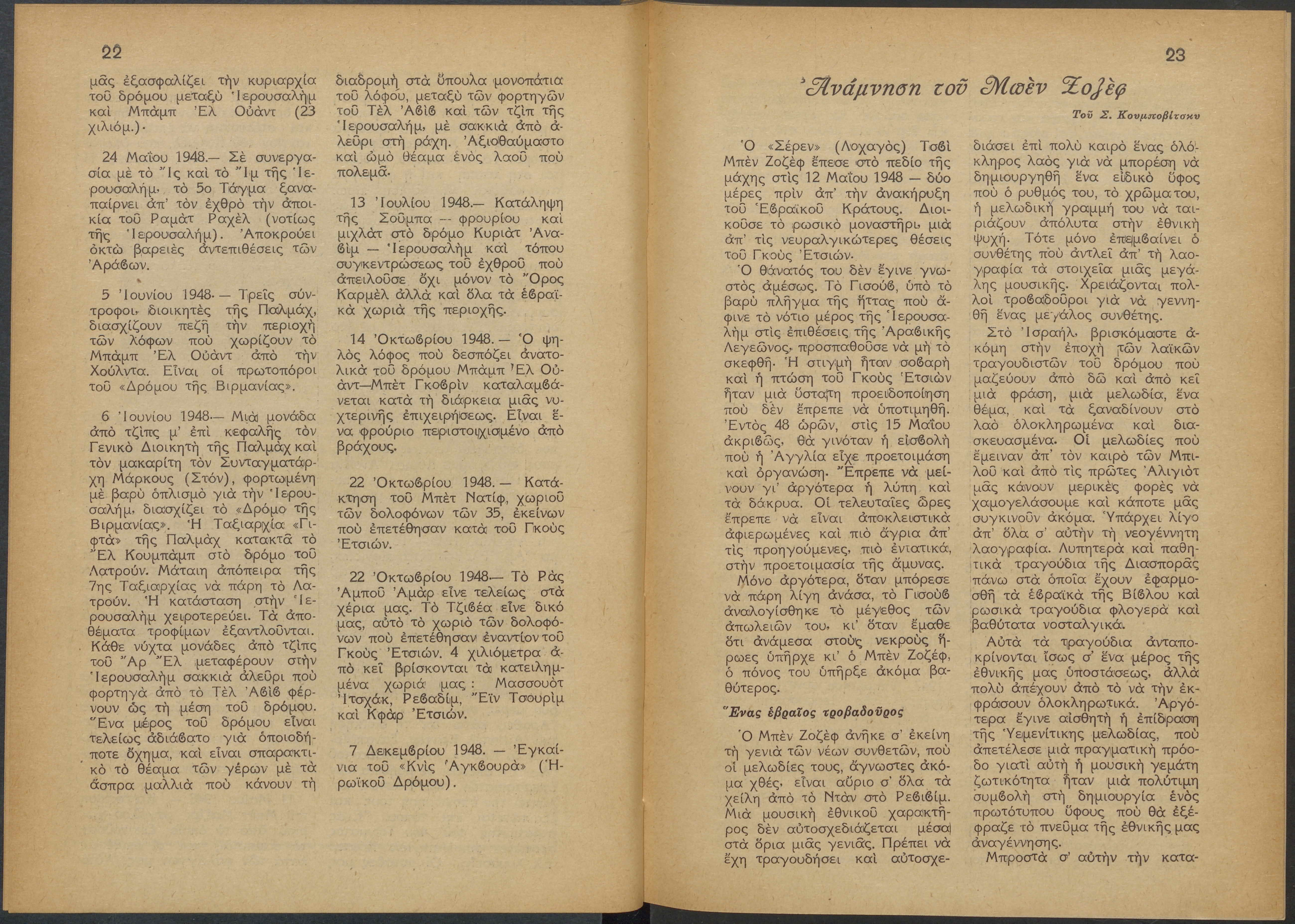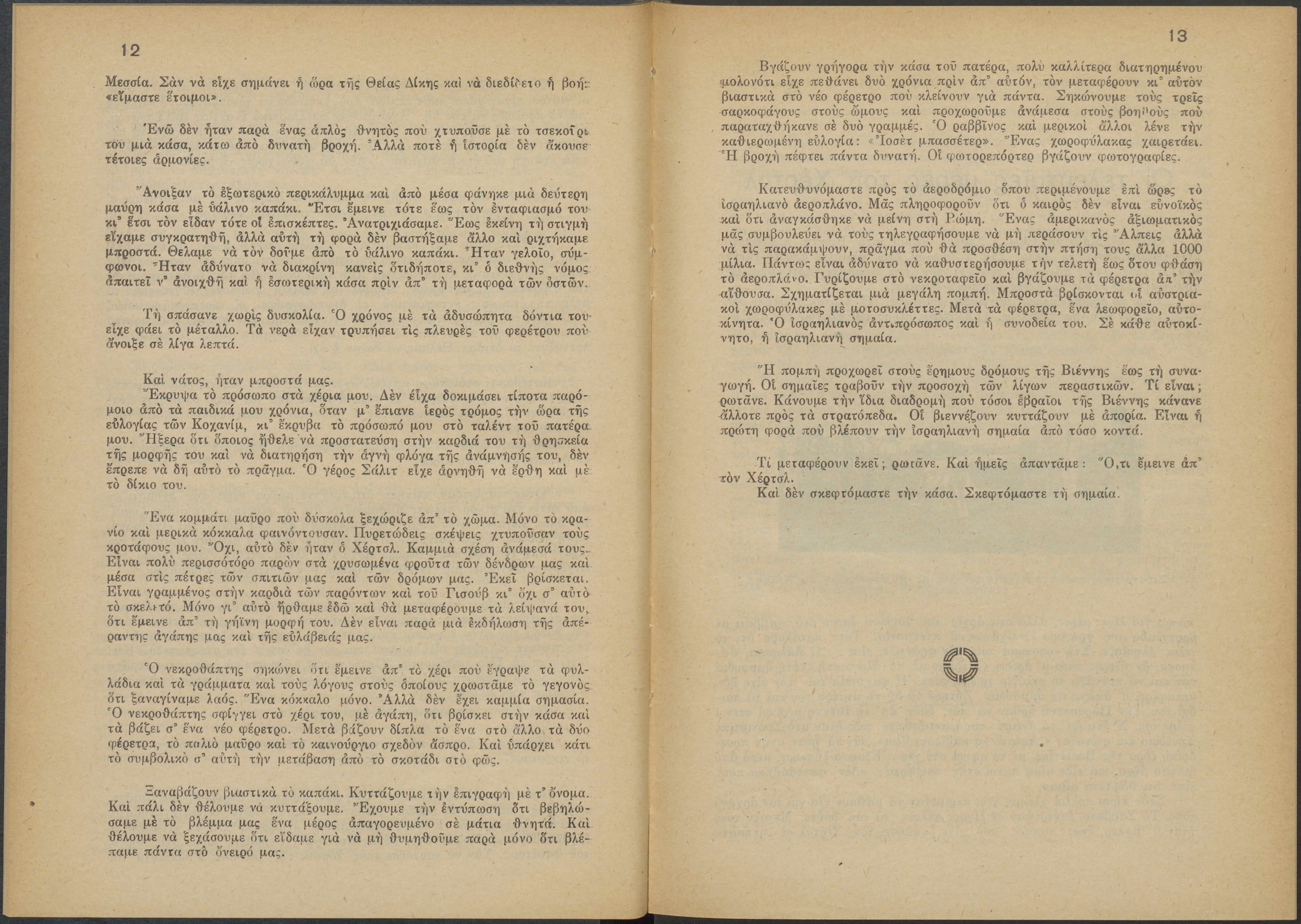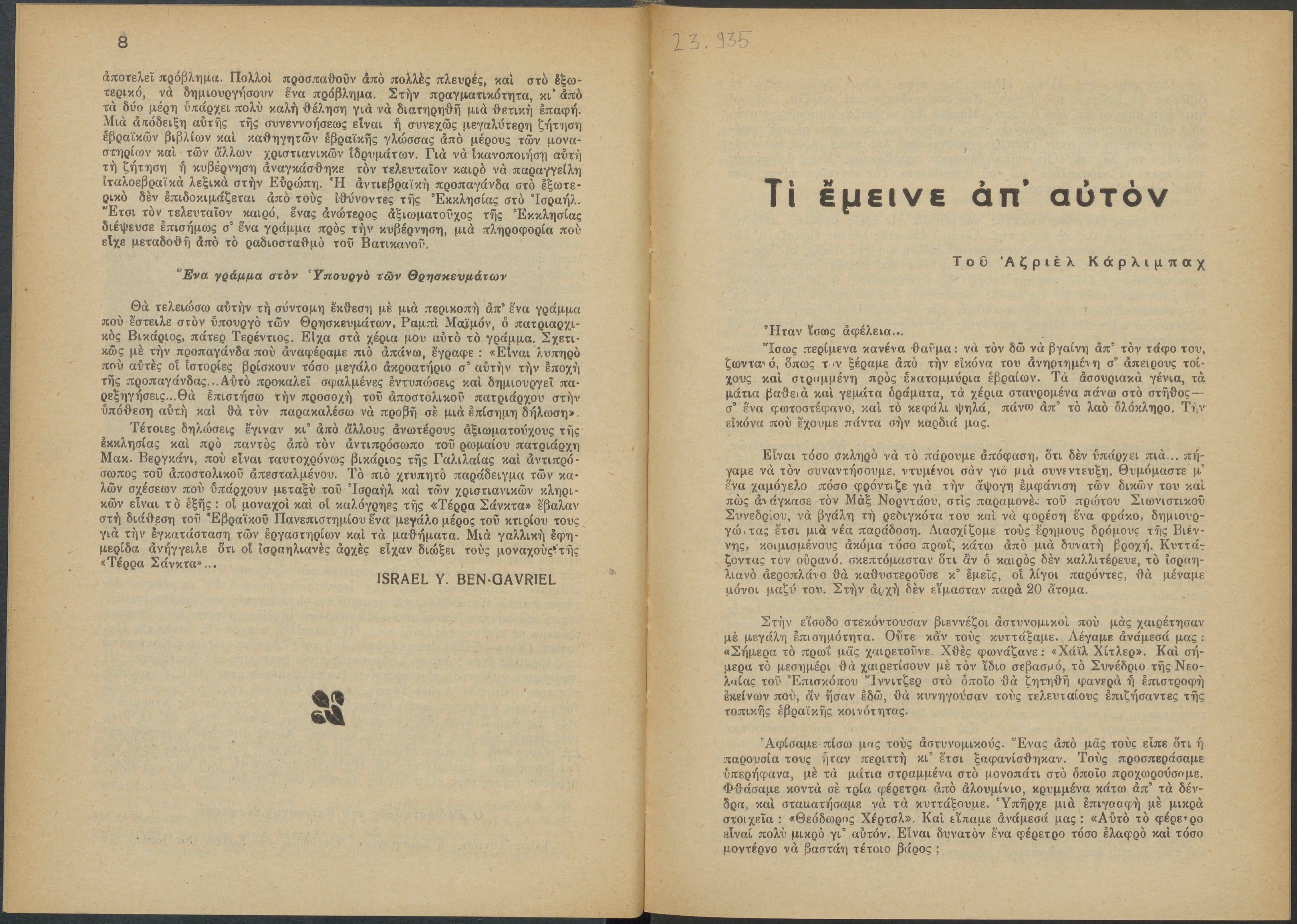 Monthly publication of Keren Kayemeth LeIsrael (Jewish National Fund/Εθνικό Εβραϊκό Κεφάλαιο), 12 issues bound in book form, 116 pages.