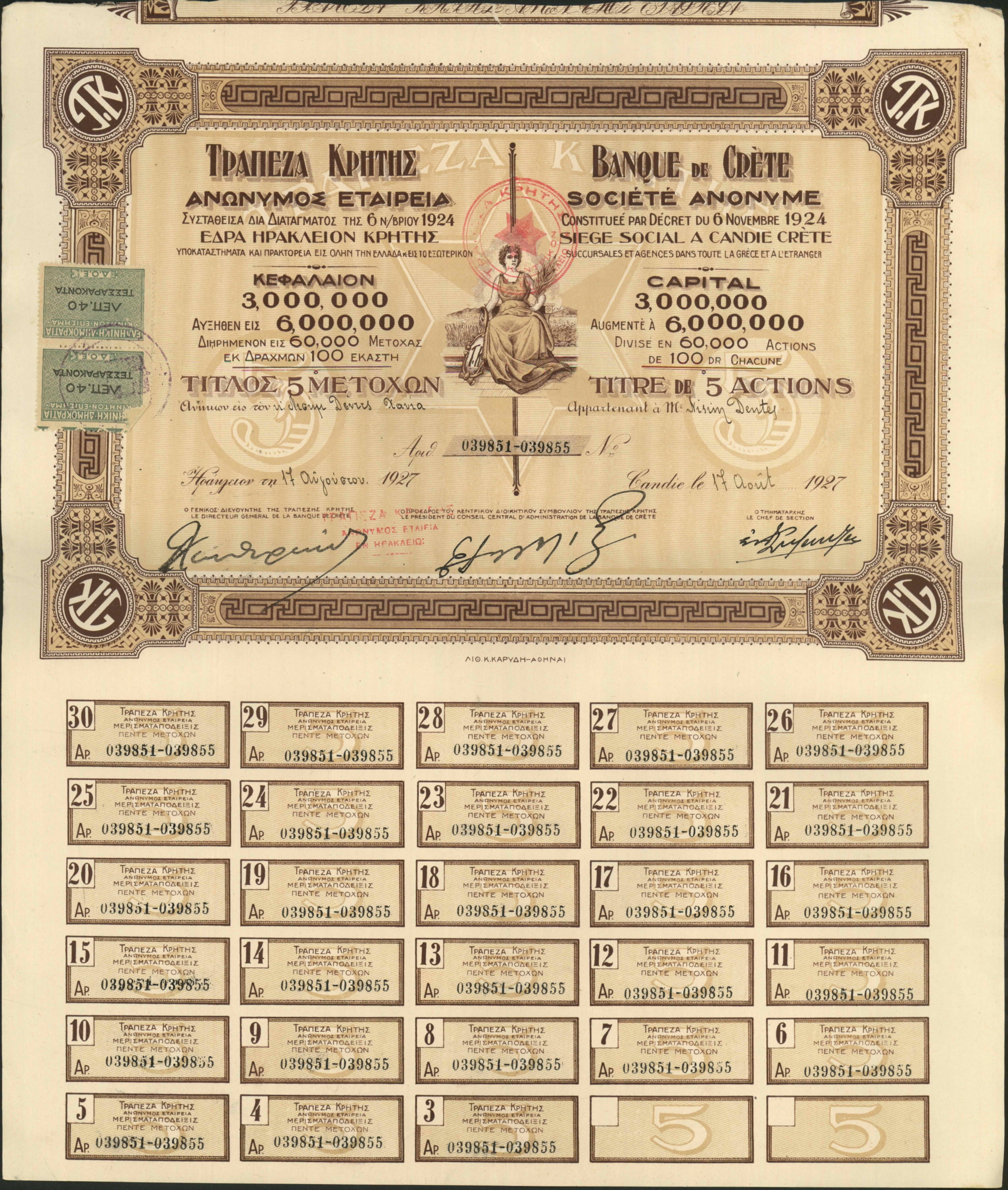 Stock certificates and shares, that belonged to Nissim Dentes and were issued by the Cretan Bank in Heraklion with coupons.