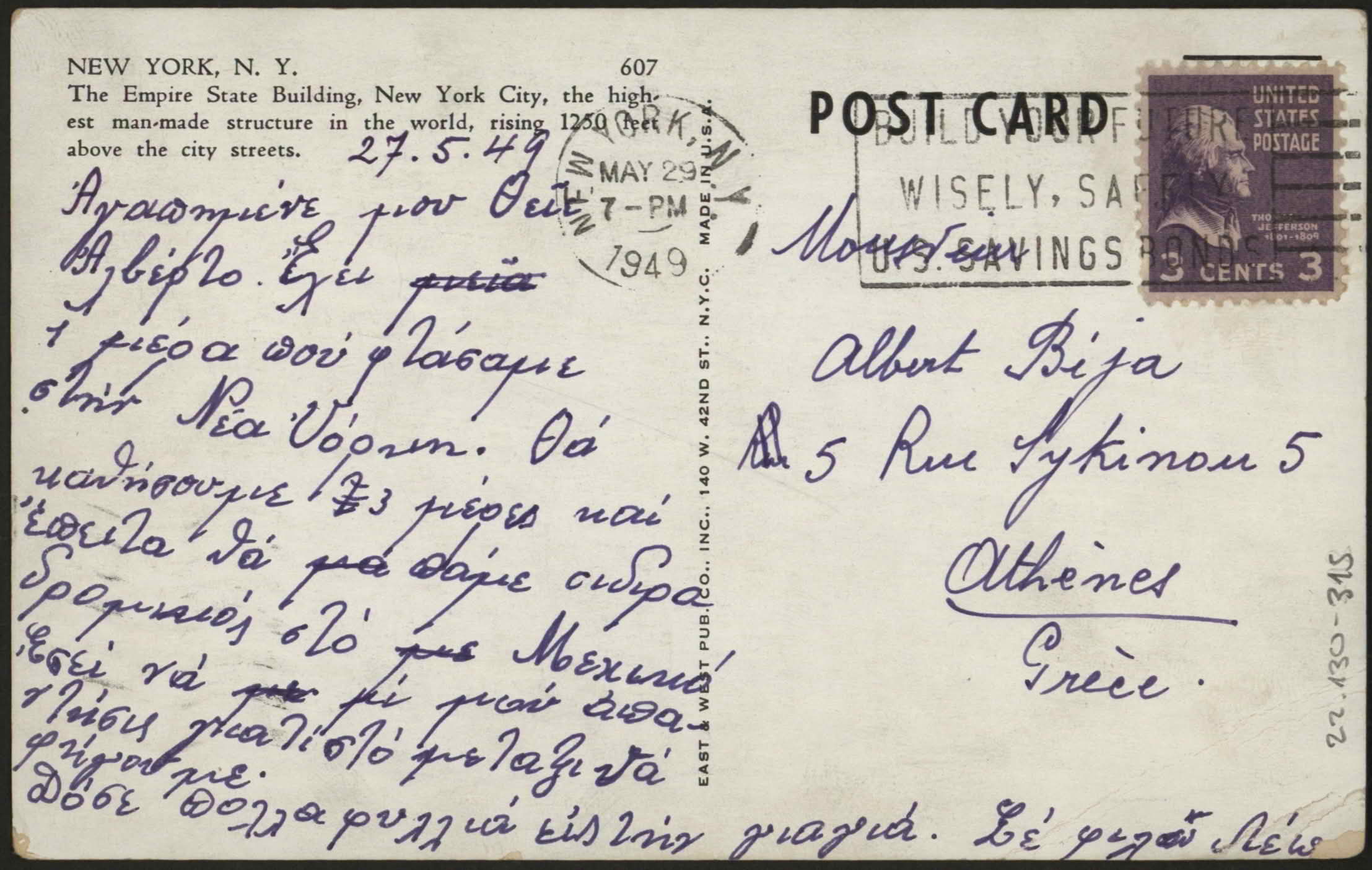 | dc.description | From Leon to Monsieur Albert Beja, 5, Rue Sykinou, Athenes, Grece. "27.5.49, Αγαπημένε μου θείε Αλβέρτο. 'Εχει 1 μέρα που φτάσαμε στην Νέα Υόρκη. Θα καθήσουμε 3 μέρες και έπειτα θα πάμε σιδηροδρομικός στο Μεξικό. Εσύ να μη μου απαντήσεις γιατί στο μεταξύ θα φύγουμε. Δώσε πολλά φιλιά εις την γιαγιά. Σε φιλώ, Λεων". | |
