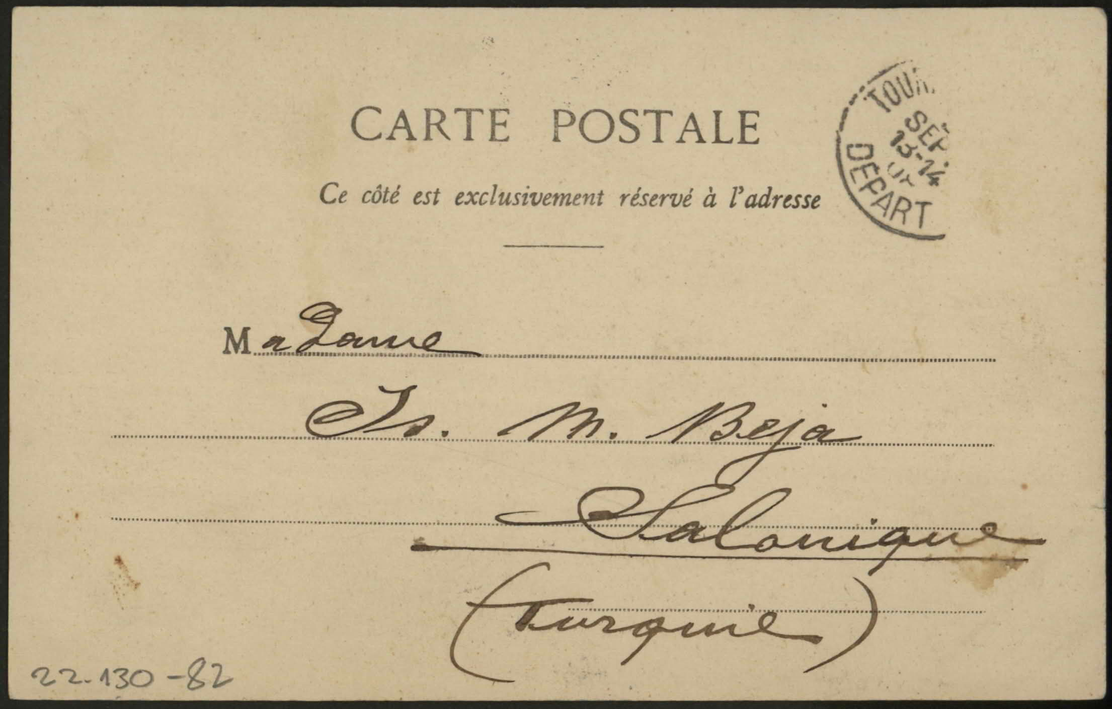 Isac to Mme. Is. M. Beja, Salonick, Europ. Tuerkey. "Carissima Fortunata, alier tadre arrivuy (?) … es muy ermosa sindad, … Te merky alqimas (?) er mosas costas i para Alice, Lucia & Sarina, los mandare con Coly postal a Salonique. … partire por Leipzig. Vos abrasso … los ijos, Isac, 6/9/08". "C'est l'hotel ou je loge, Isac, 6/9/08" (on front side).
