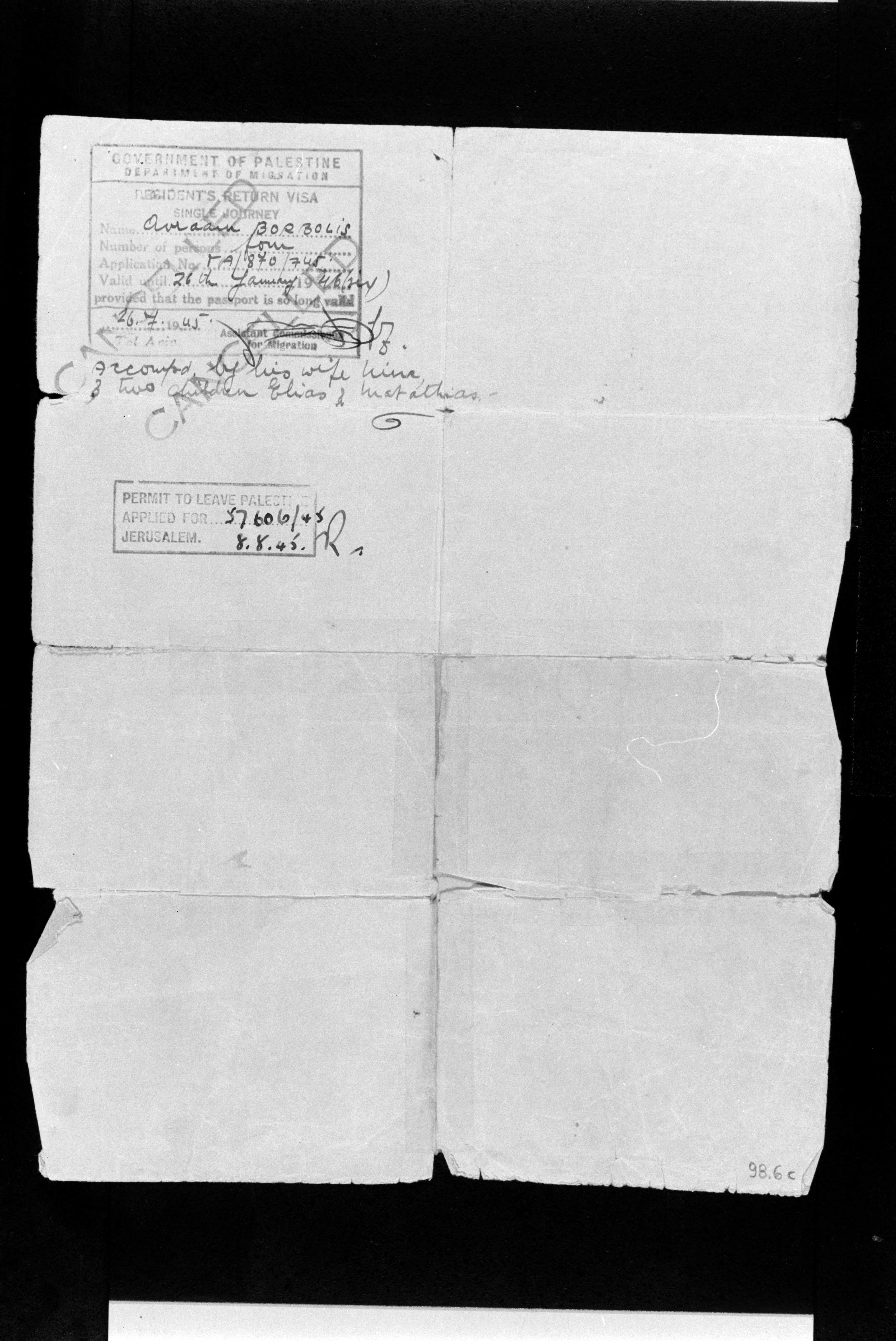 Travel permit issued to Avraham Borbolis and his family in 1945 in Israel