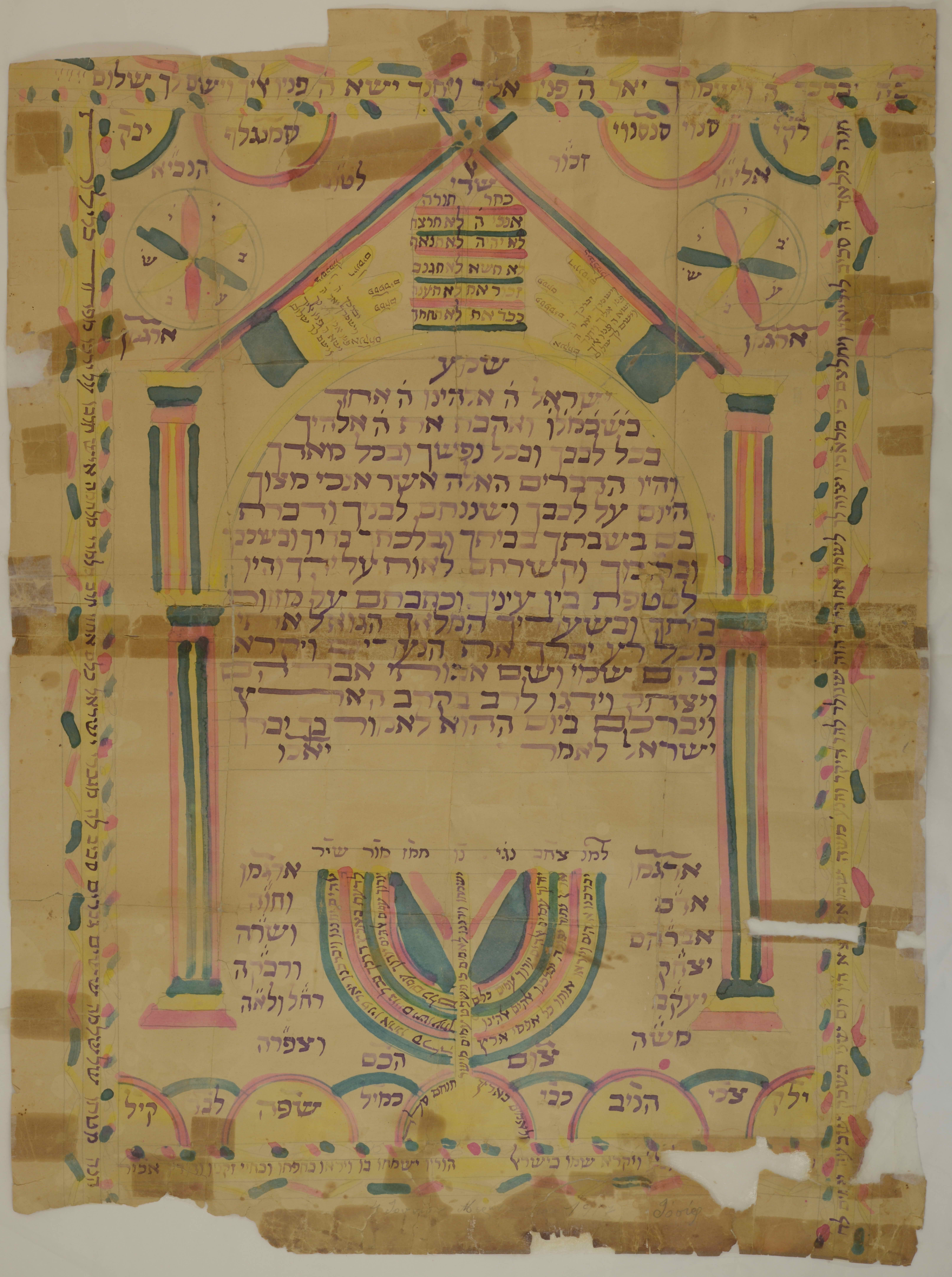 Aleph (Circumsicion certificate), with with blue ink and watercolour on paper, for Joseph, son of Moses Samuel Matza, born on May 28th, 1917 (Sivan 7, 5677).