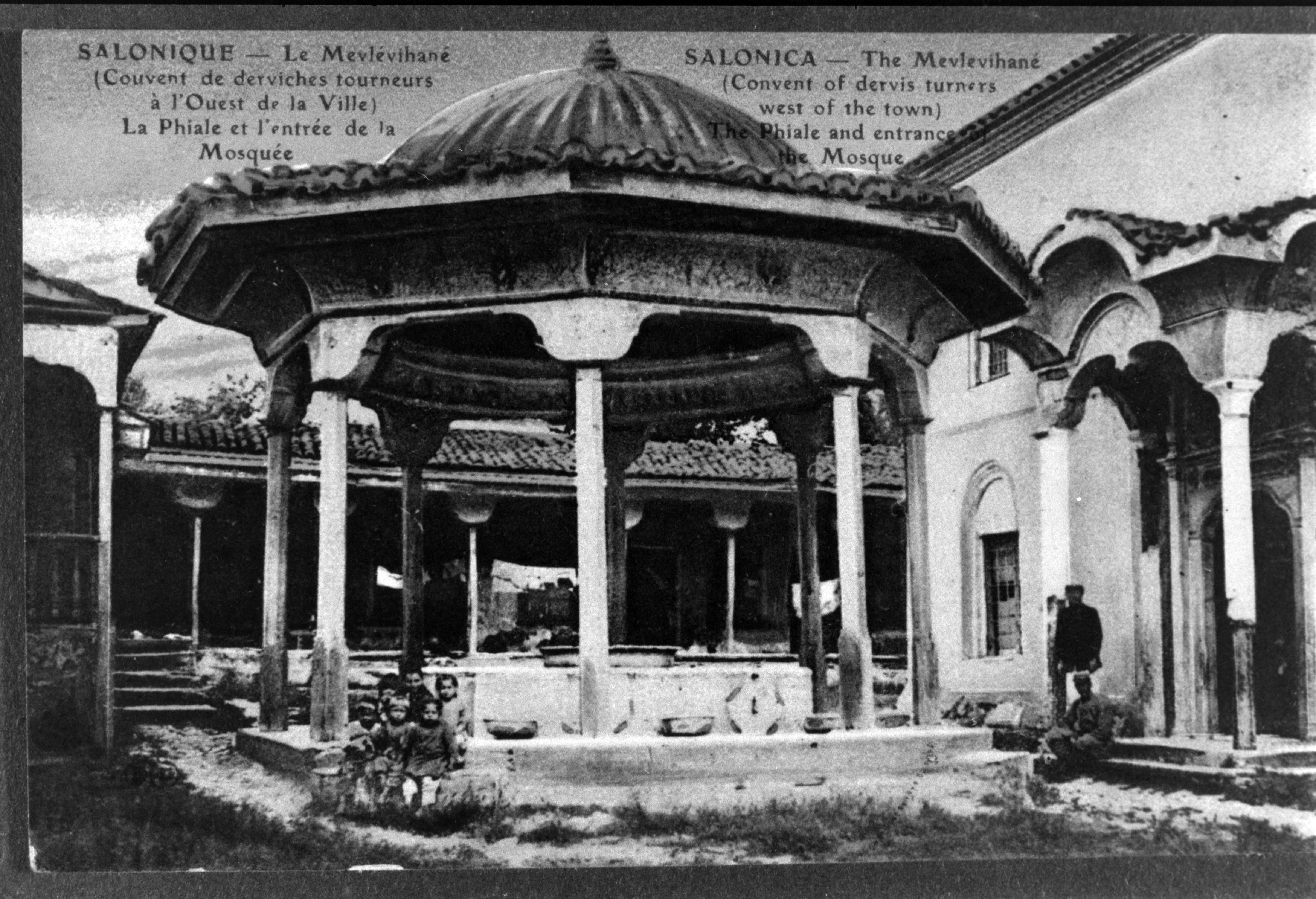 Photograph of a postcard with a picture of the Dervish Tekke in Salonica.