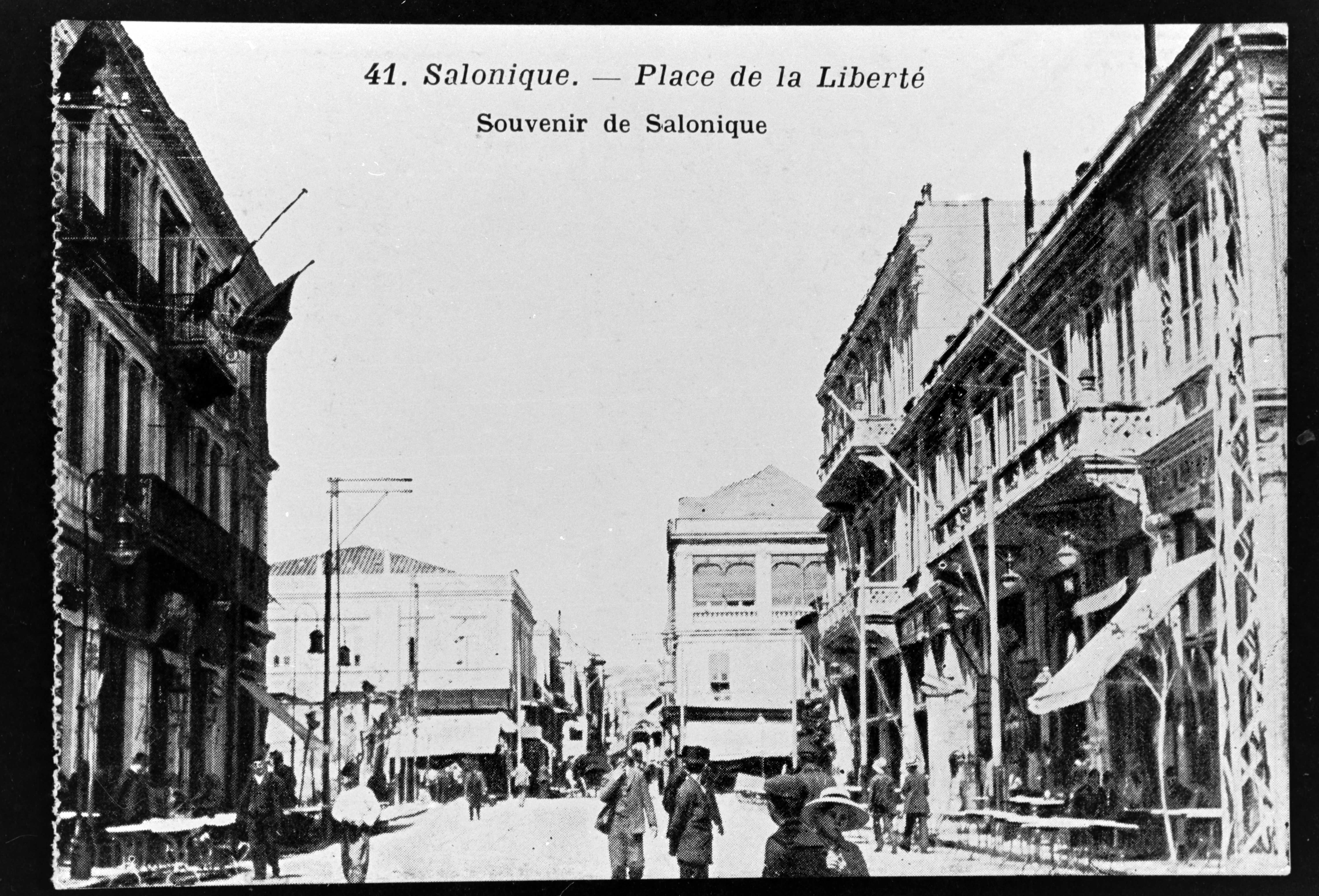 Photograph of a postcard with a picture of Agias Sophias square in Thessaloniki.