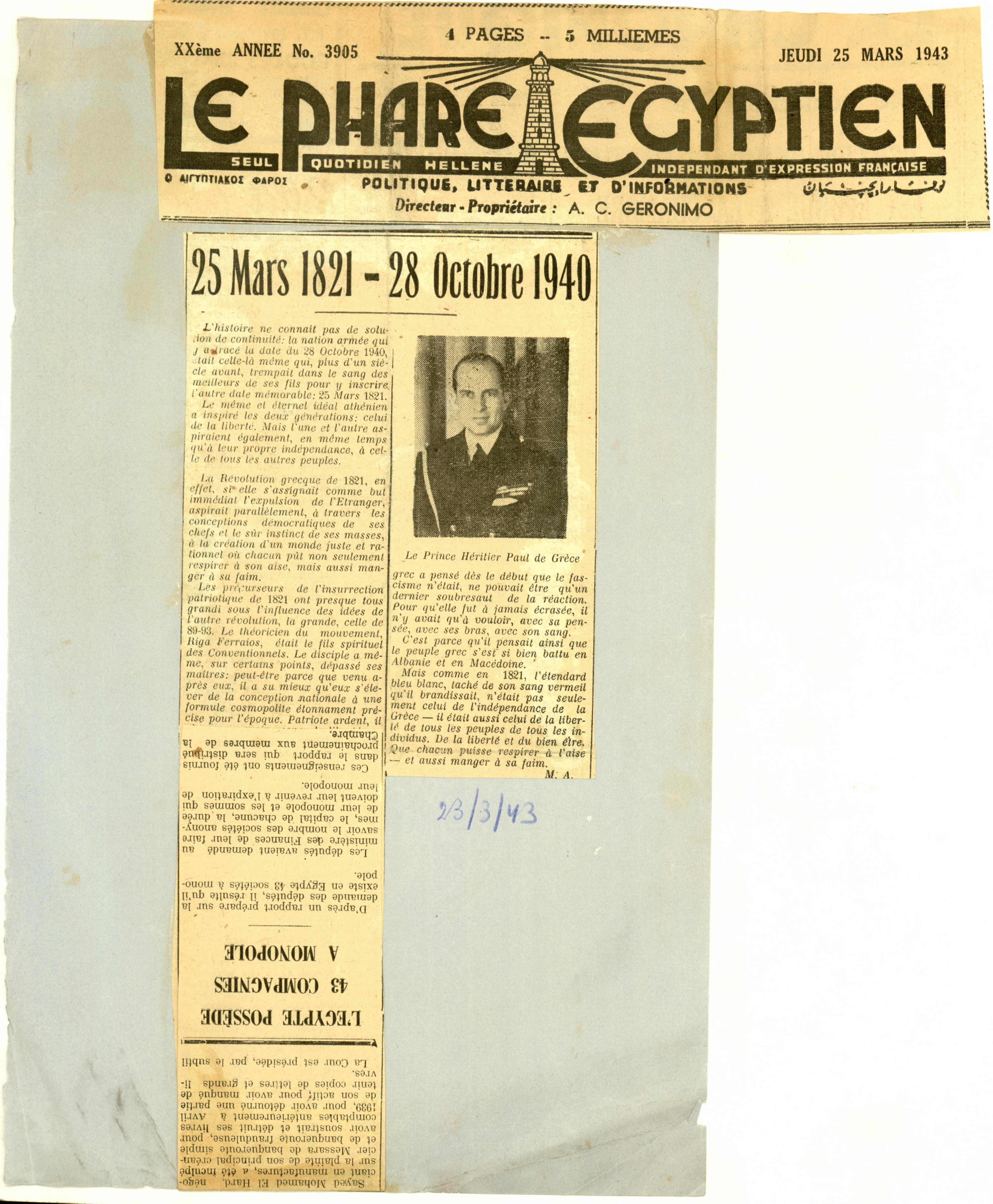 "Le Phare Égyptien" newspaper clippings, attached on paper, with article titled "25 Mars 1821 - 28 Octobre 1940" by A. Molho, March 25th, 1943, No. 3905.