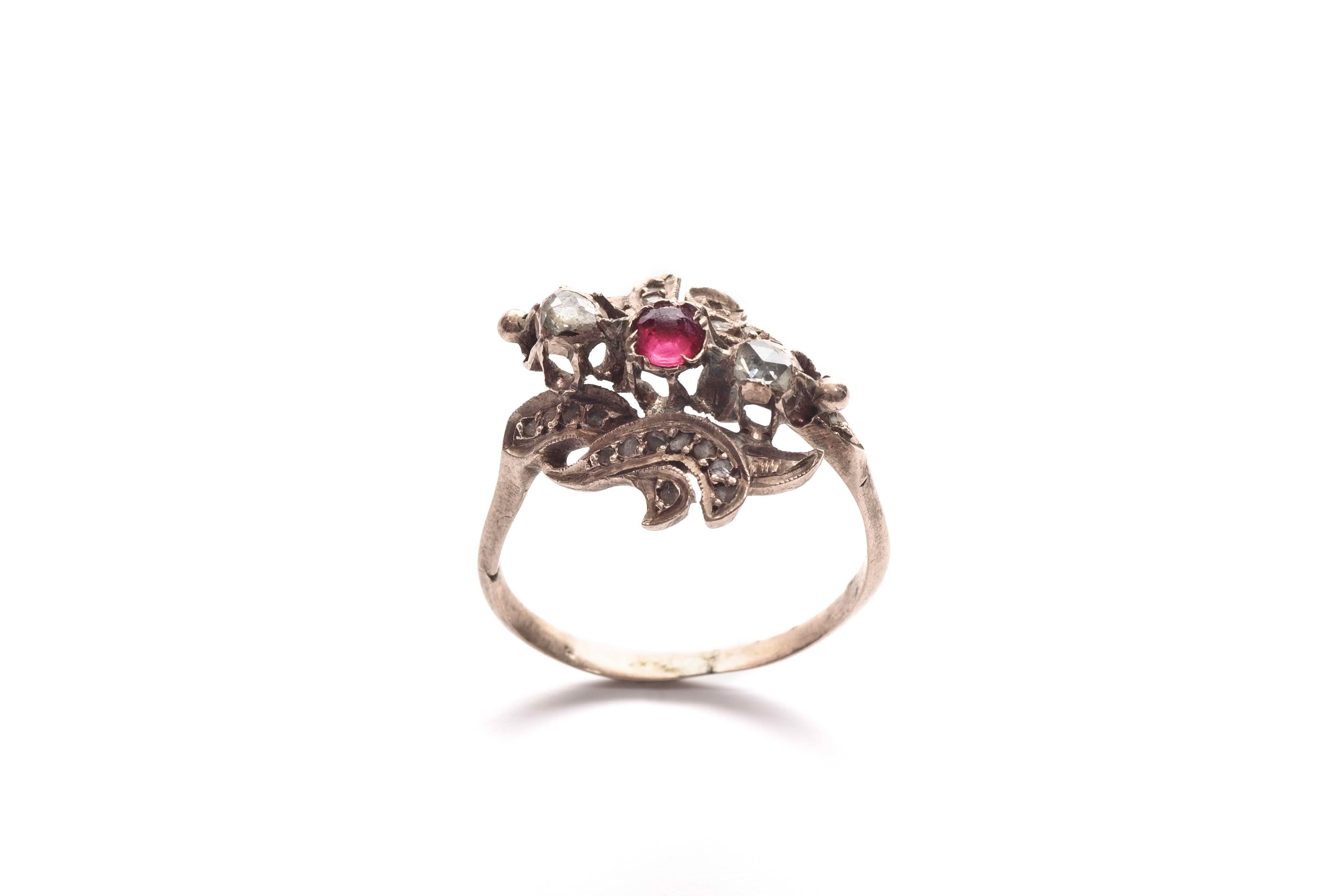 Woman's gold ring, decorated with a baroque openwork ornament consisting of scrolling leaves set with diamond chips flanking a row of a sapphire and two diamonds in individual high prong setting.